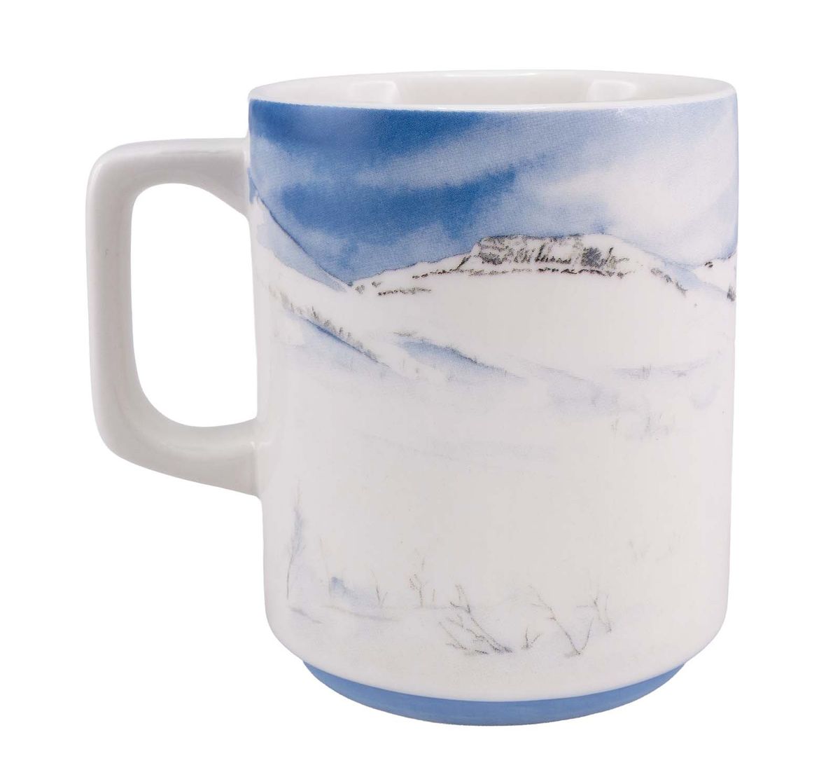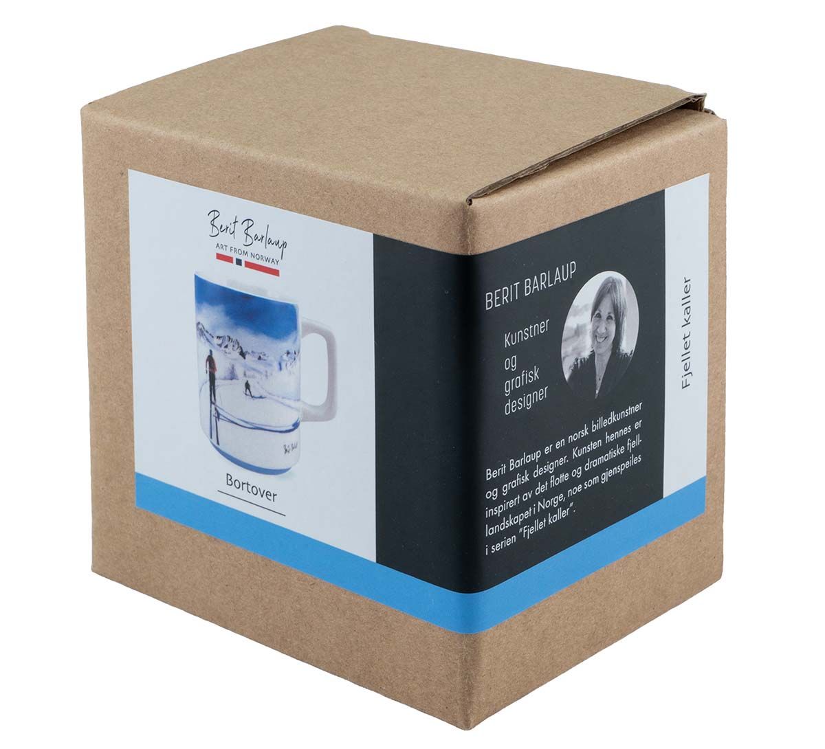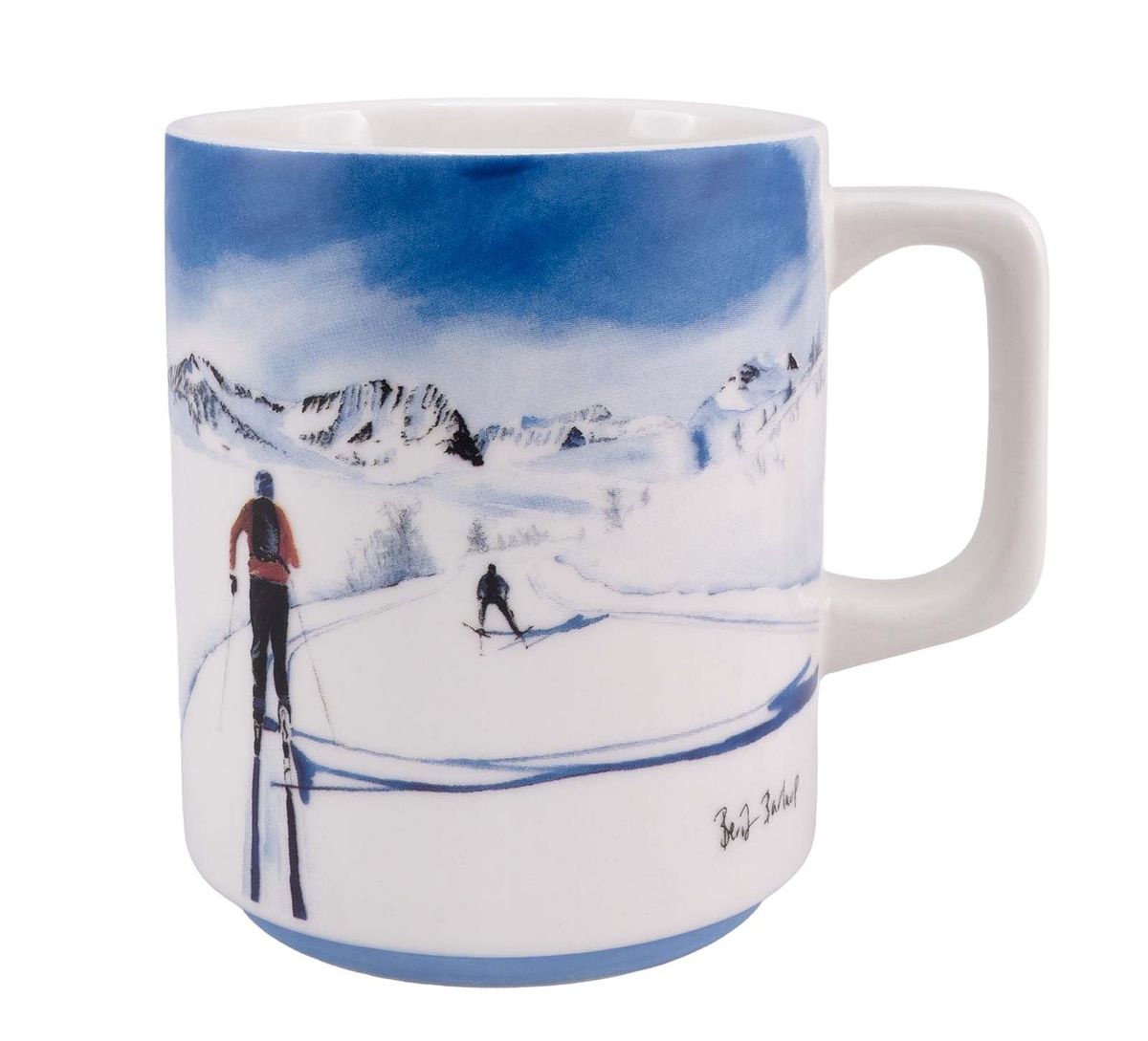 Nyt en varm drikke i dette stilrene kruset med motivet Bortover fra serien Fjellet kaller. Motivet Bortover er malt i vakre akvarellfarger med fine penselstrøk og viser avslappede og langt-gående langrennsløpere i norske vinterfjell.