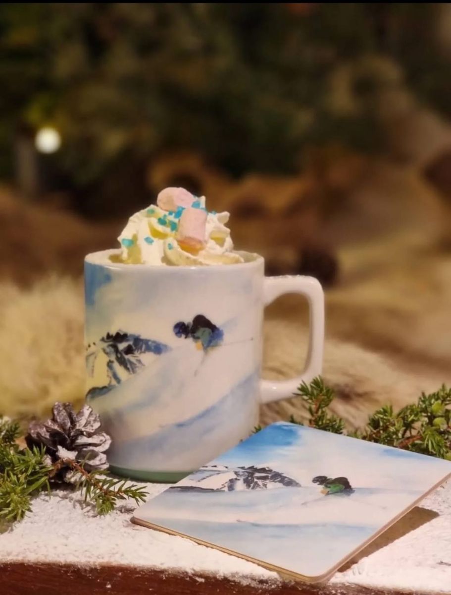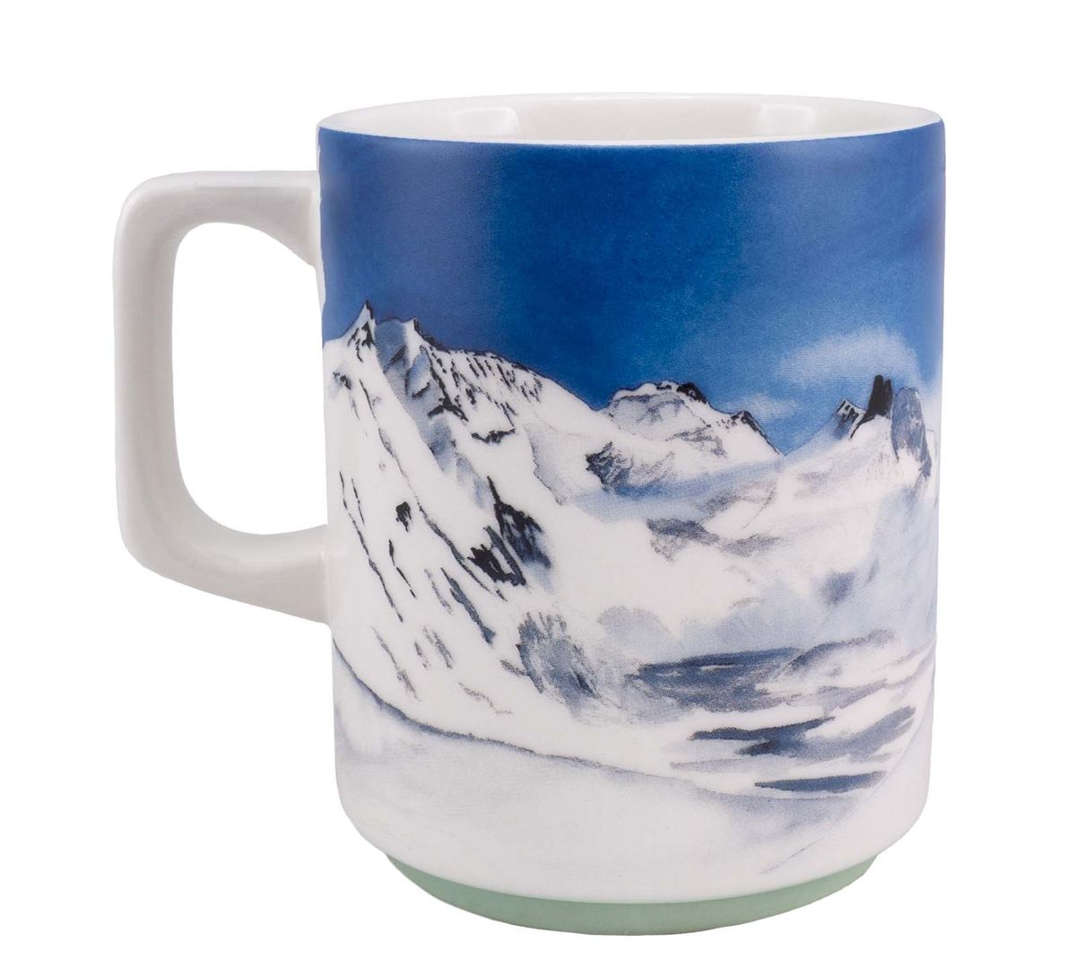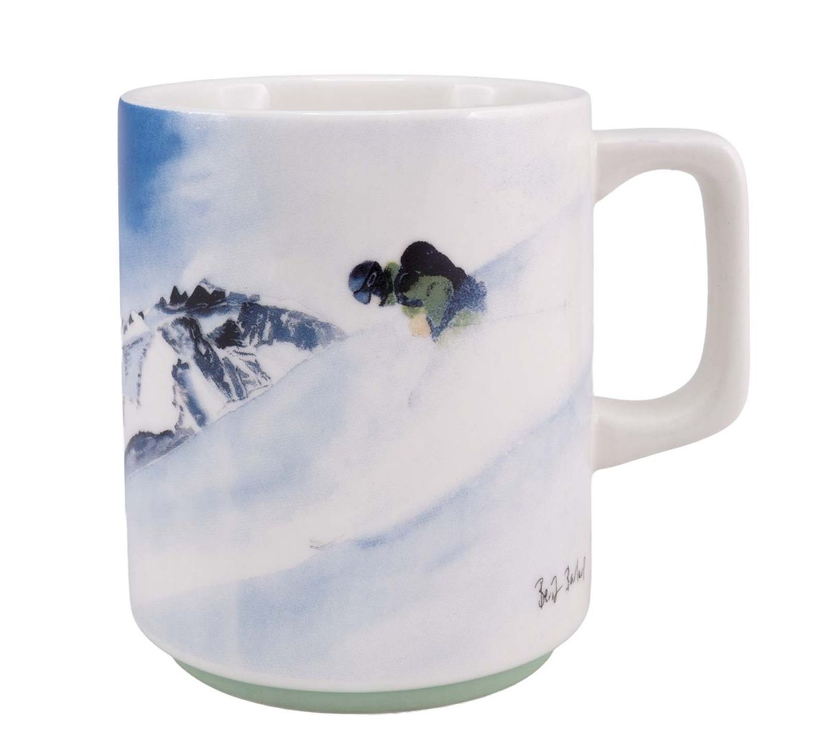 Nyt en varm drikke i dette stilrene kruset med motivet Nedover fra serien Fjellet kaller. Motivet Nedover er malt i vakre akvarellfarger med delikate penselstrøk og viser de ivrigste skiløperne på vei nedover - i full fart!