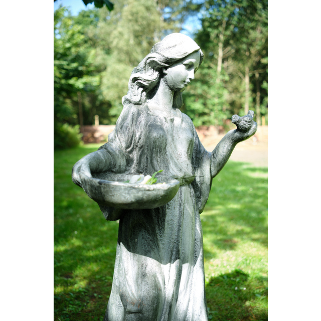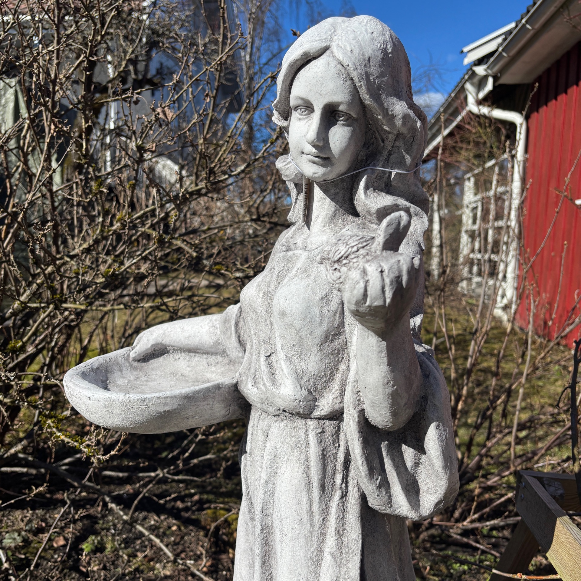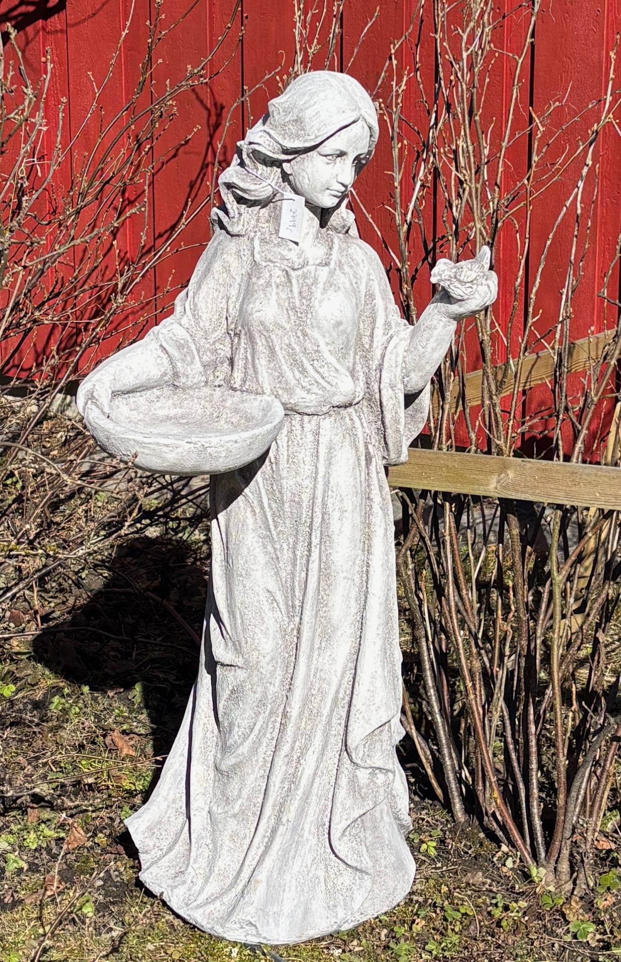 Liker du nostalgiske figurer i hagen eller ønsker noe annet enn det som tradisjonelt finnes i hagene rundtomkring, kan du jo kaste øynene på denne figuren. Den viser en gammeldags kledd jente med et stort fat - som kan brukes både som vannbad (med litt blomster i), fuglebad eller fuglemater.