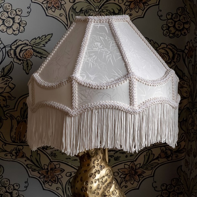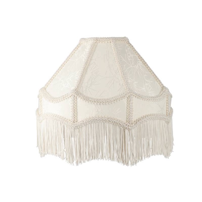 Denne lampeskjermen forsvinner ikke i mengden! :-) Den er hvit, forseggjort og har lange frynser og flotte kantbånd. Vendbar lampeholder gjør at den passer til både bordlamper og taklamper.