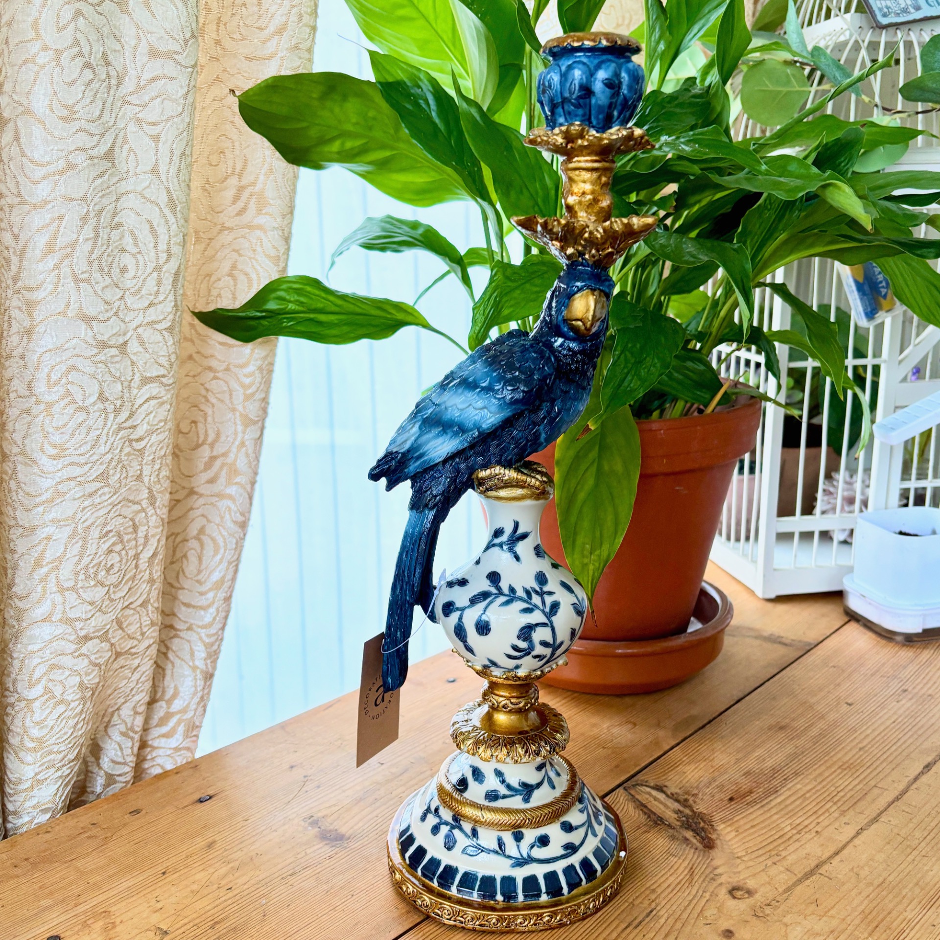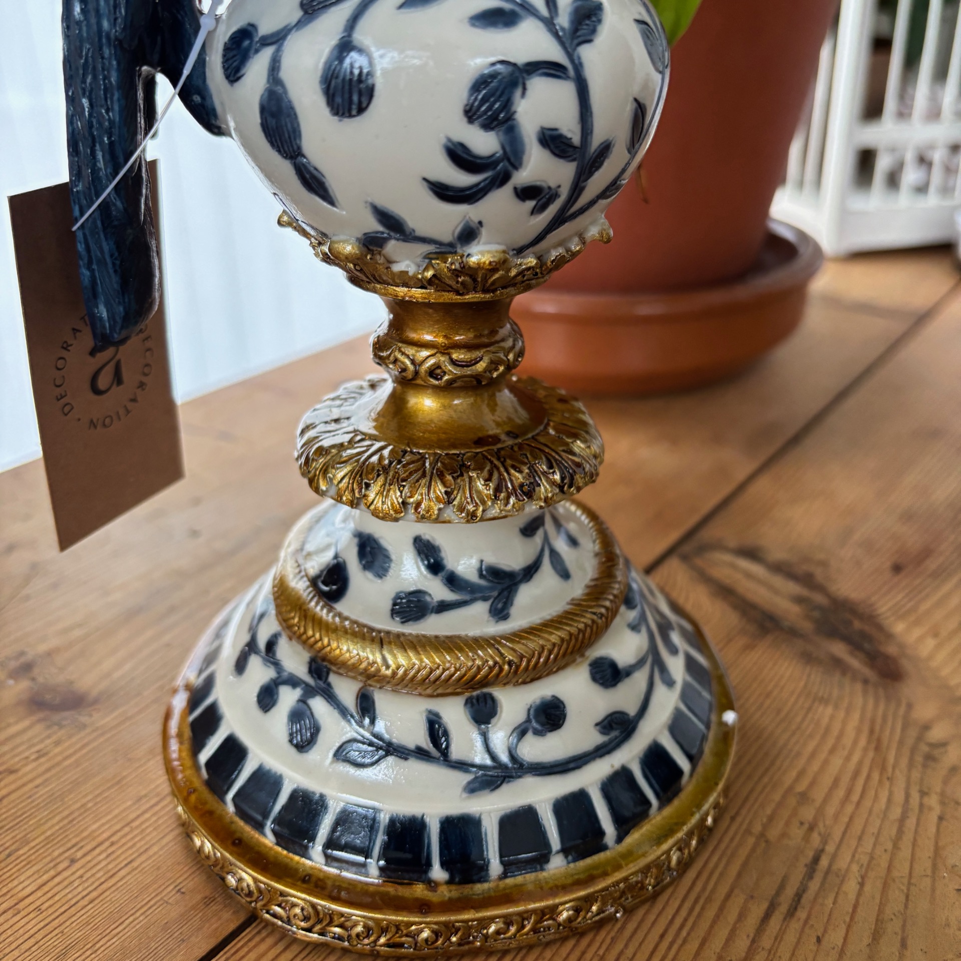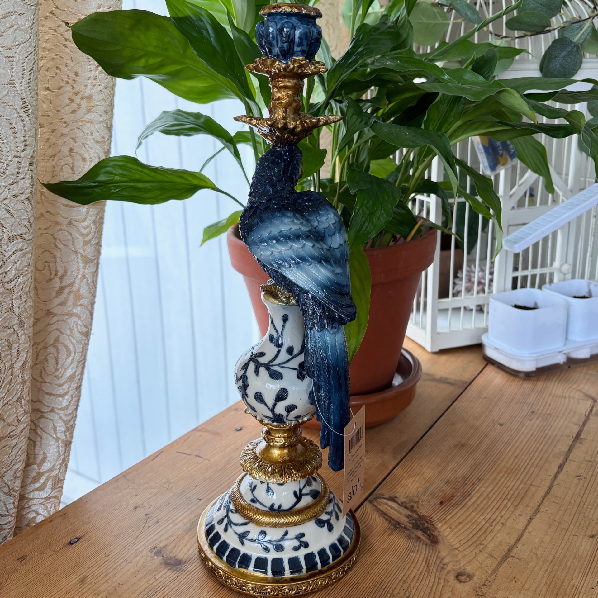 - Lysestaken har en blå fugl - kanskje en undulat eller liten papegøye og ellers går det i gull og blader. Den er hele 40 cm høy, det passer godt med kronelys i holderen og bredde og dybde er 14x13 cm. Laget i polyresin. Håndlaget i Østen.