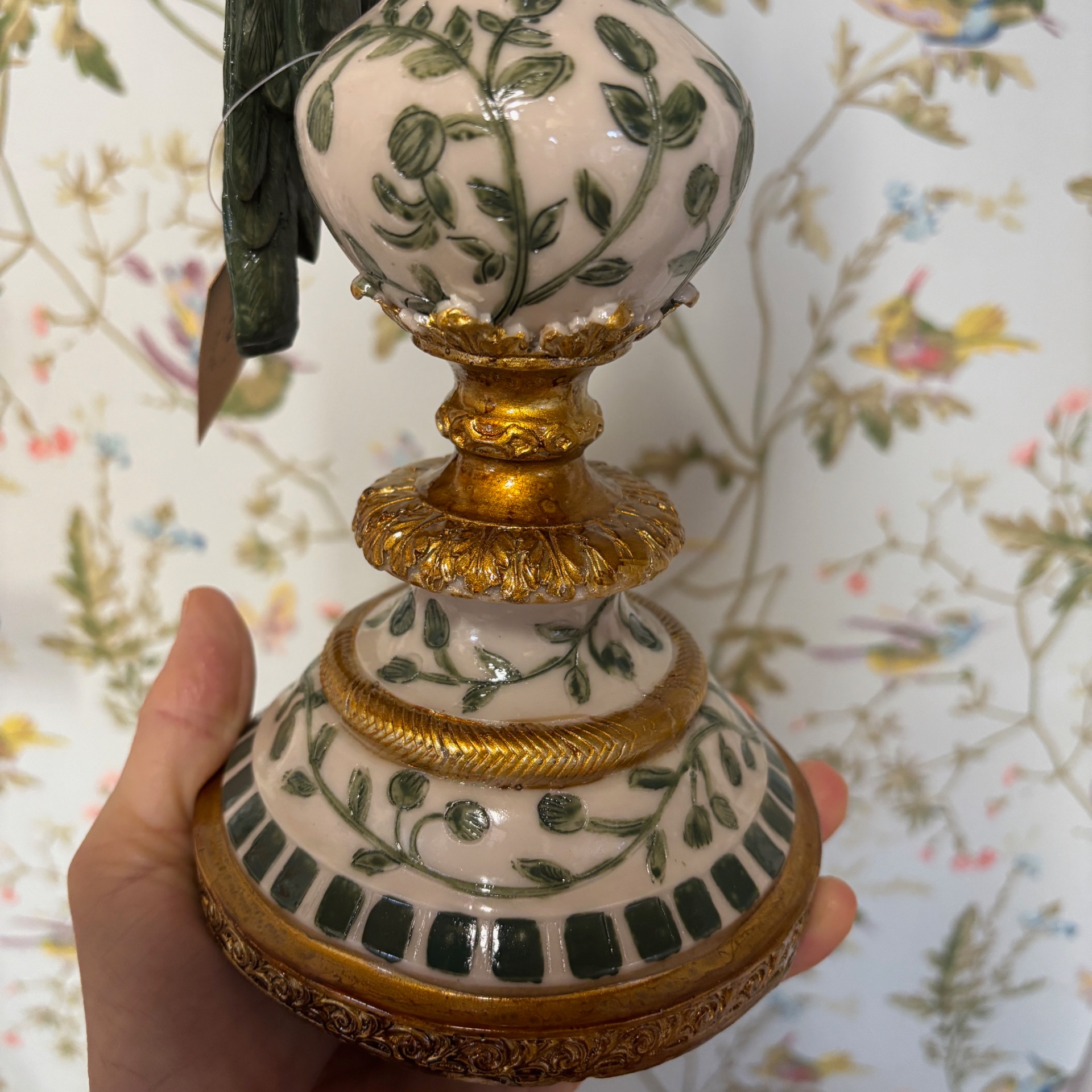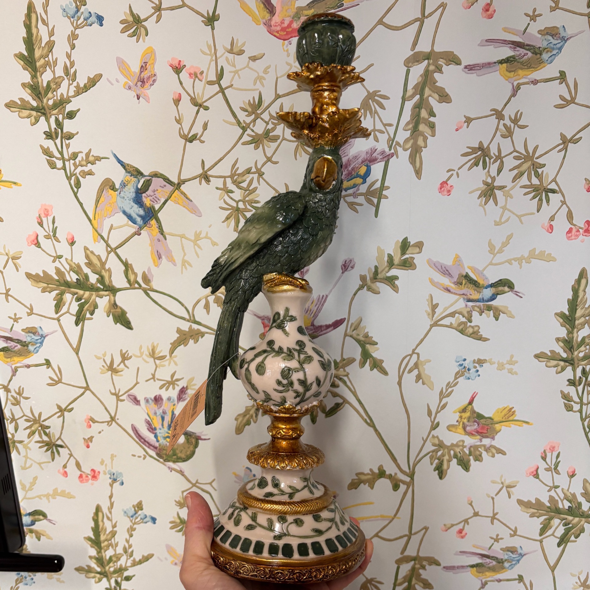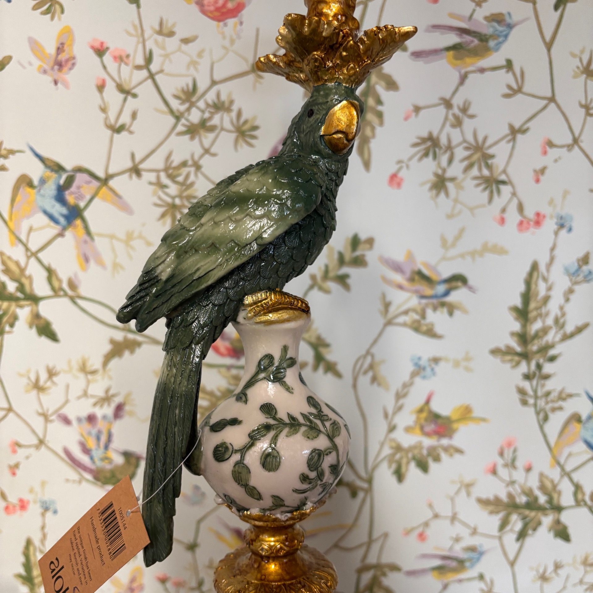 Liker du å ha litt iøynefallende interiør, bør du se på denne her (og en del andre lysestaker og lampeføtter som er i butikken). Lysestaken har en grønn fugl - kanskje en undulat eller liten papegøye og ellers går det i gull og blader. Den er hele 40 cm høy, det passer godt med kronelys i holderen og bredde og dybde er 14x13 cm. Laget i polyresin. Håndlaget i Østen.
