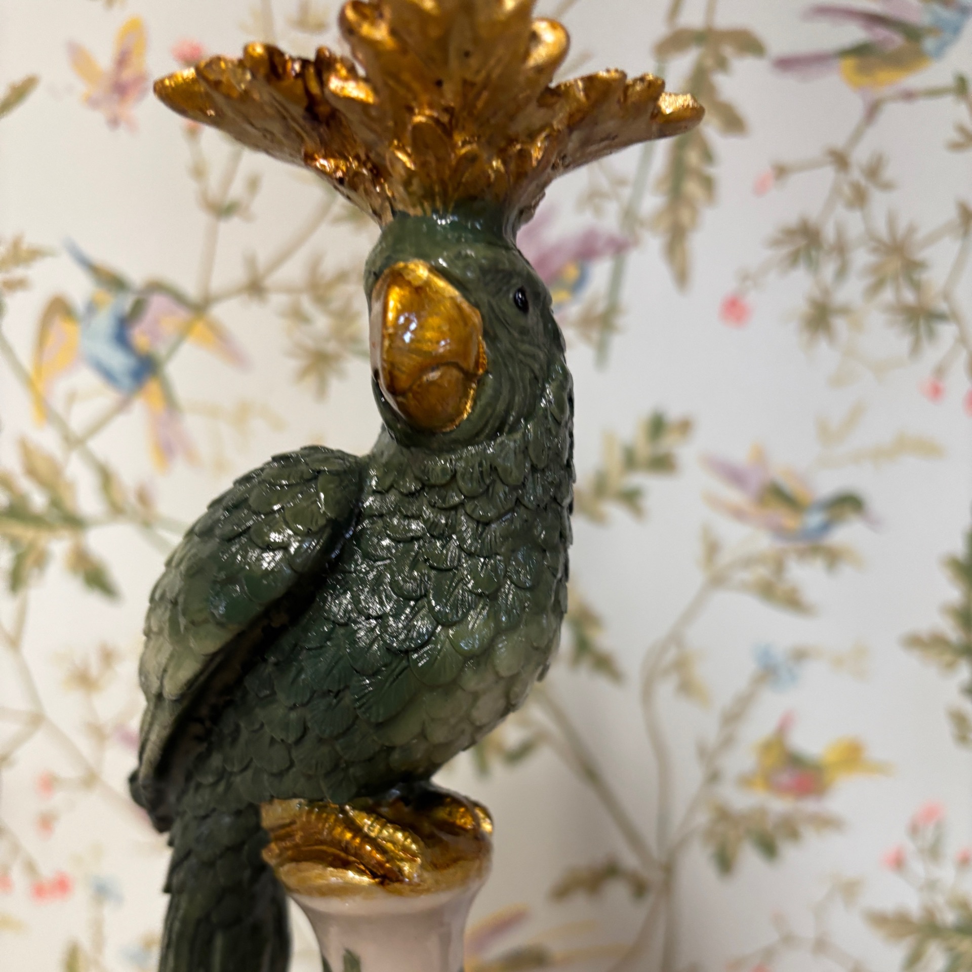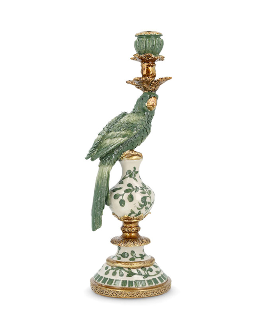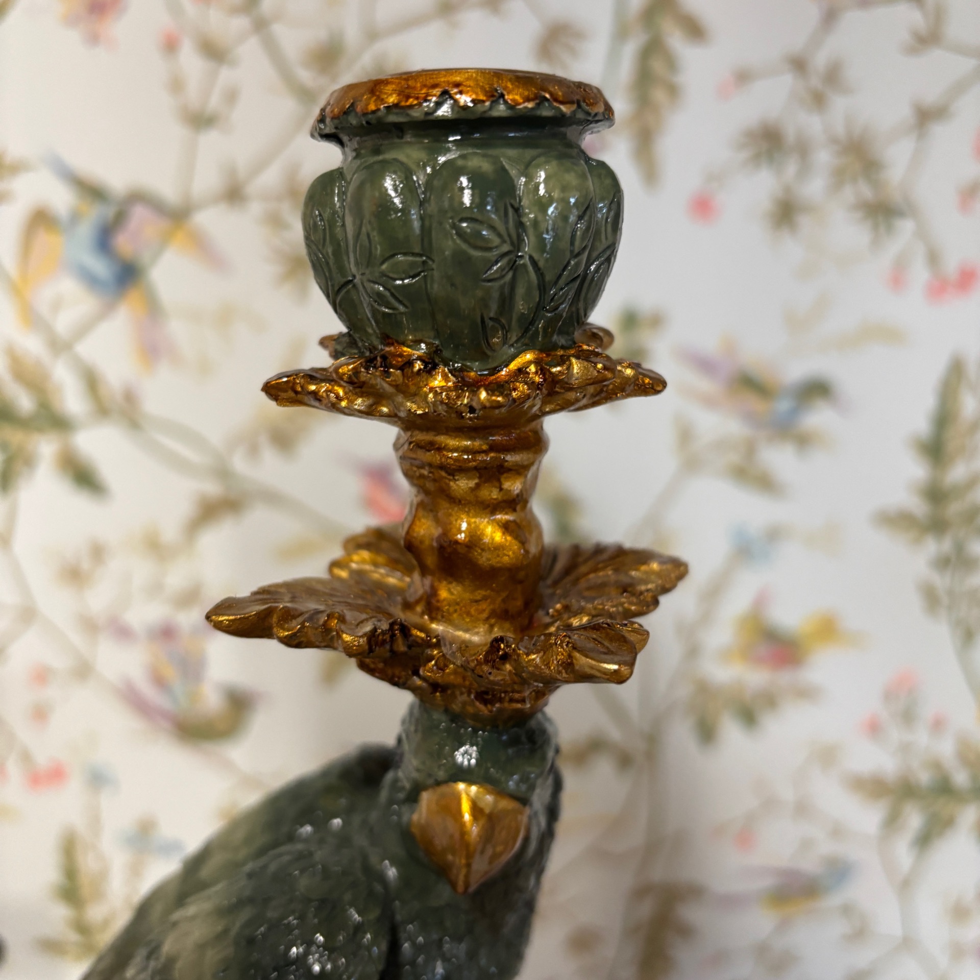 Liker du å ha litt iøynefallende interiør, bør du se på denne her (og en del andre lysestaker og lampeføtter som er i butikken). Lysestaken har en grønn fugl - kanskje en undulat eller liten papegøye og ellers går det i gull og blader. Den er hele 40 cm høy, det passer godt med kronelys i holderen og bredde og dybde er 14x13 cm. Laget i polyresin. Håndlaget i Østen.