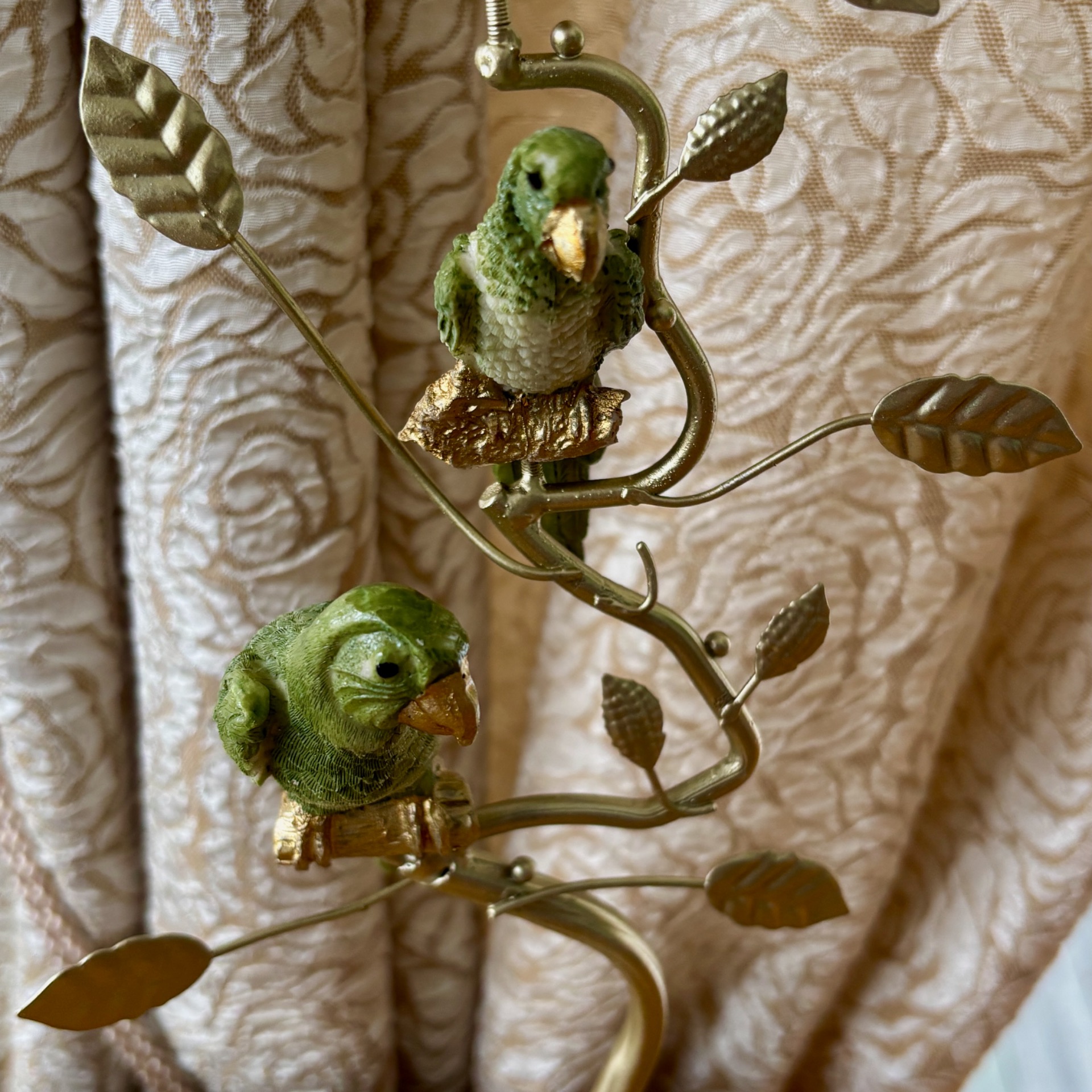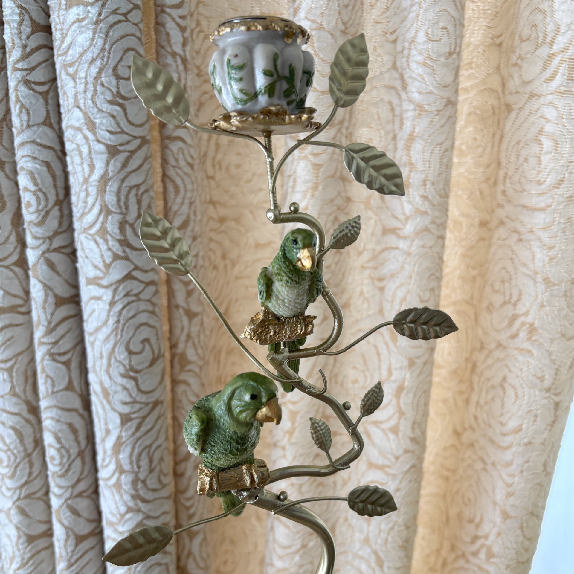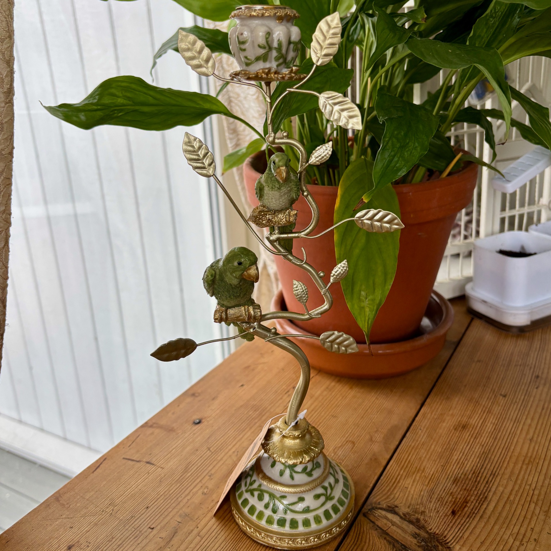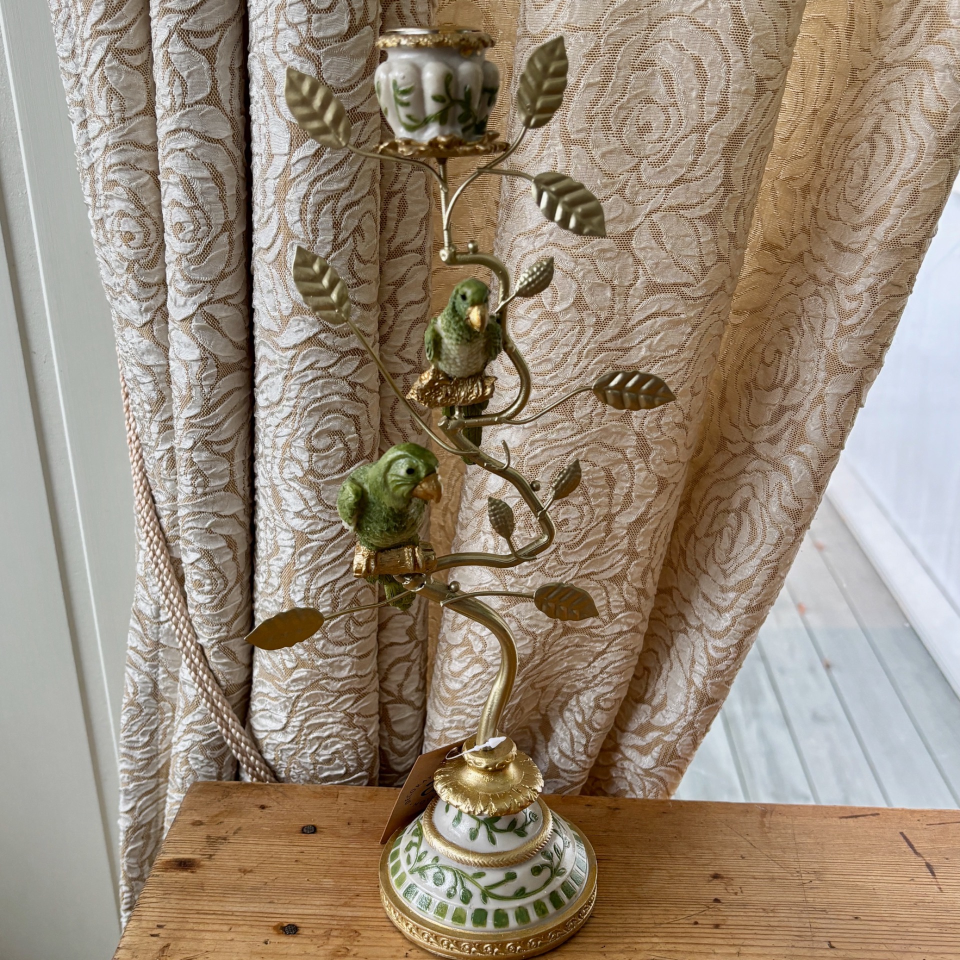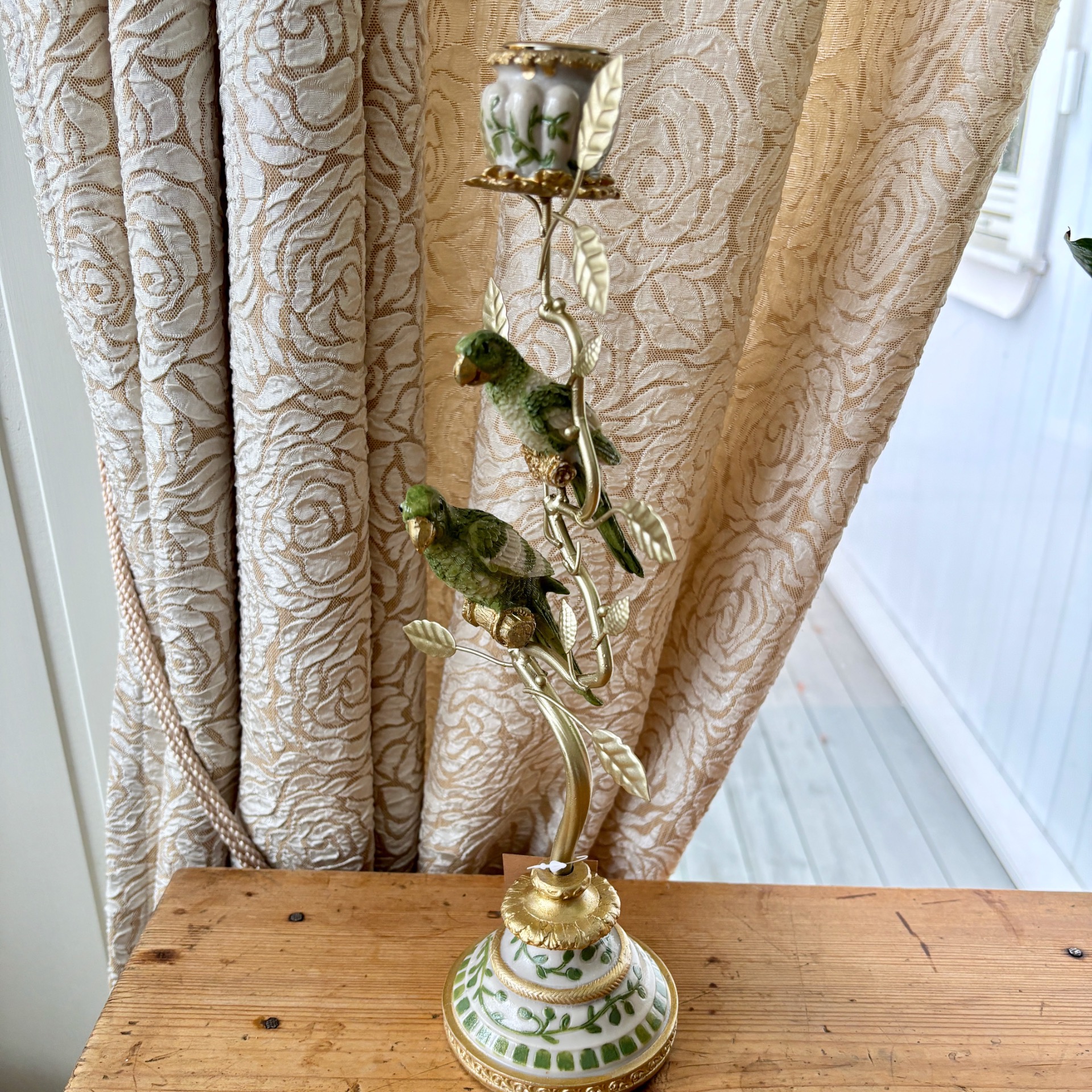Delikat, sart og vakker lysestake i metall og polyresin. Motivet er to papegøye-fugler som sitter på grenene. Grenene har selvsagt blader. Det er plass til ett lys. Håndmalt.