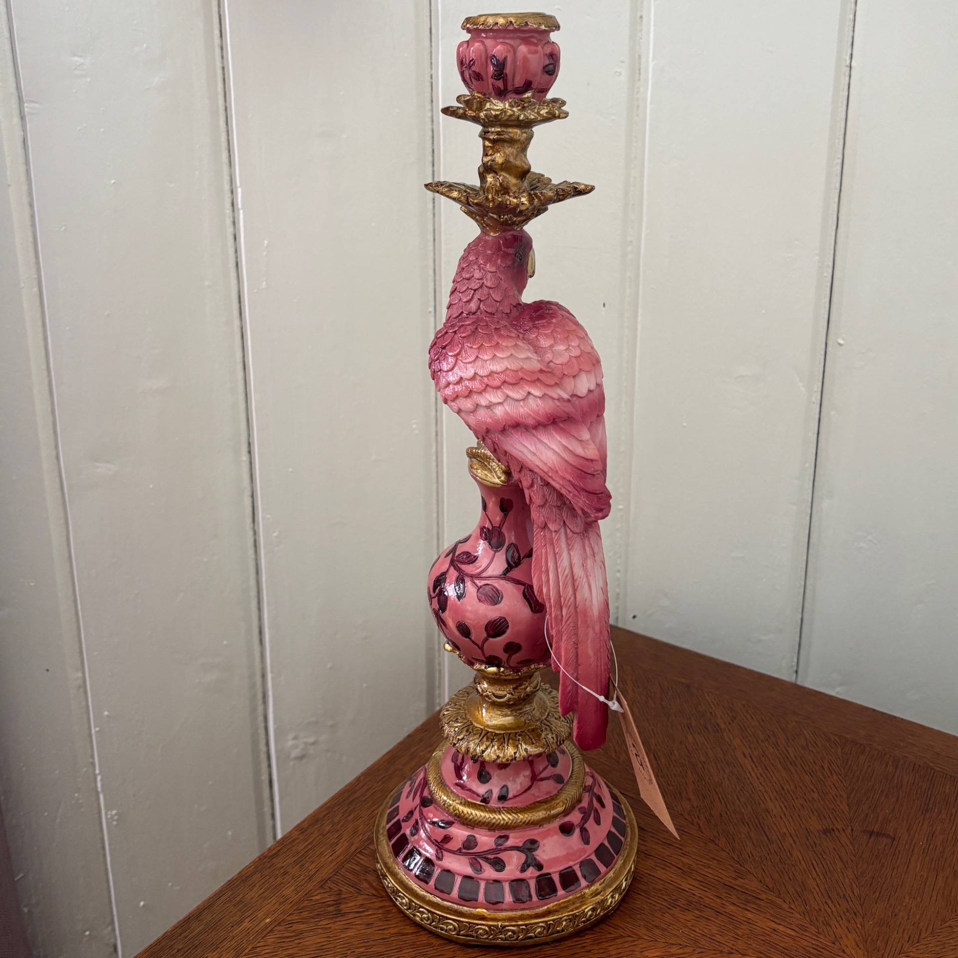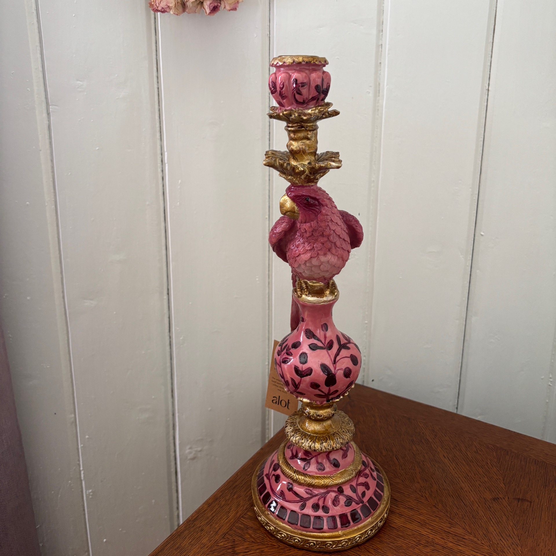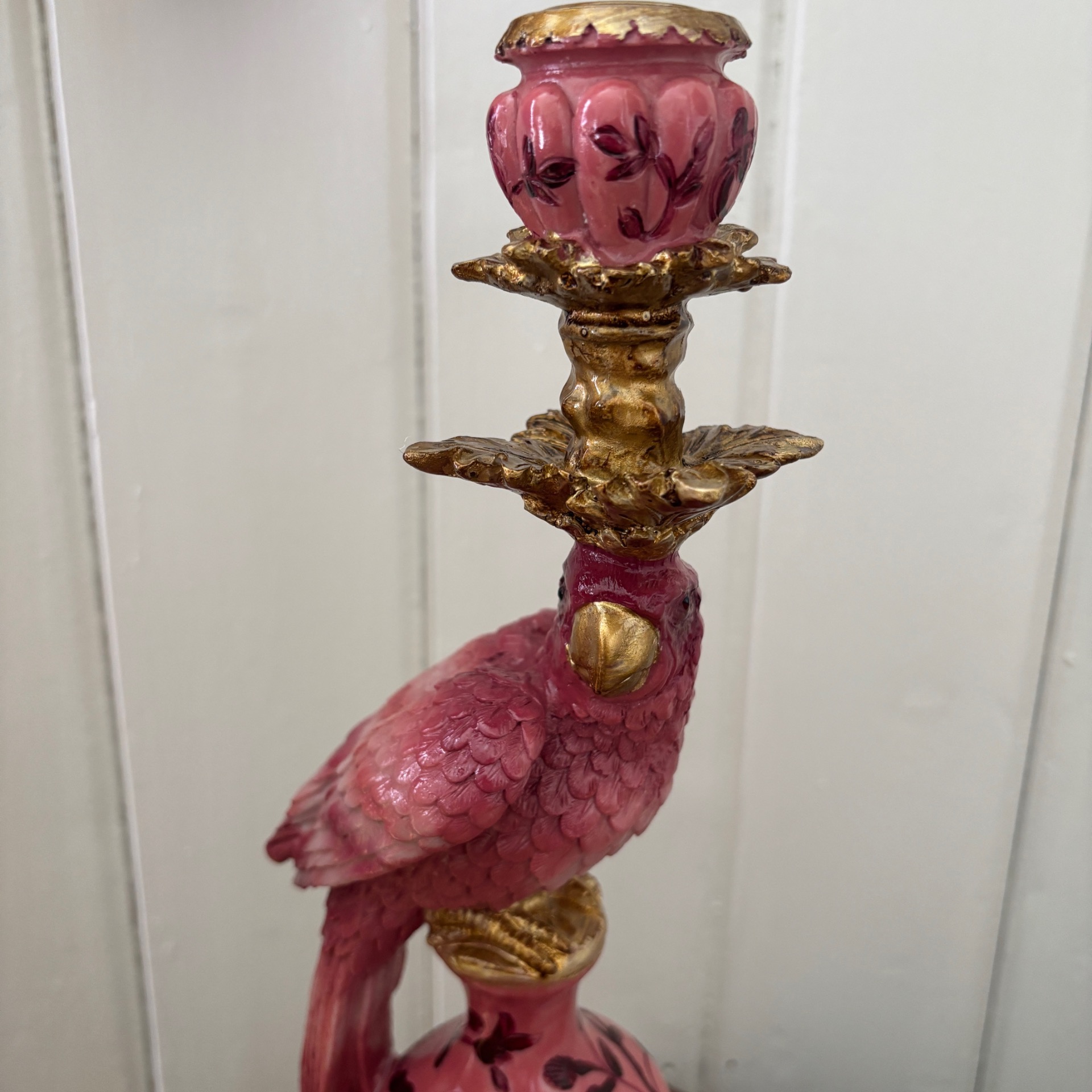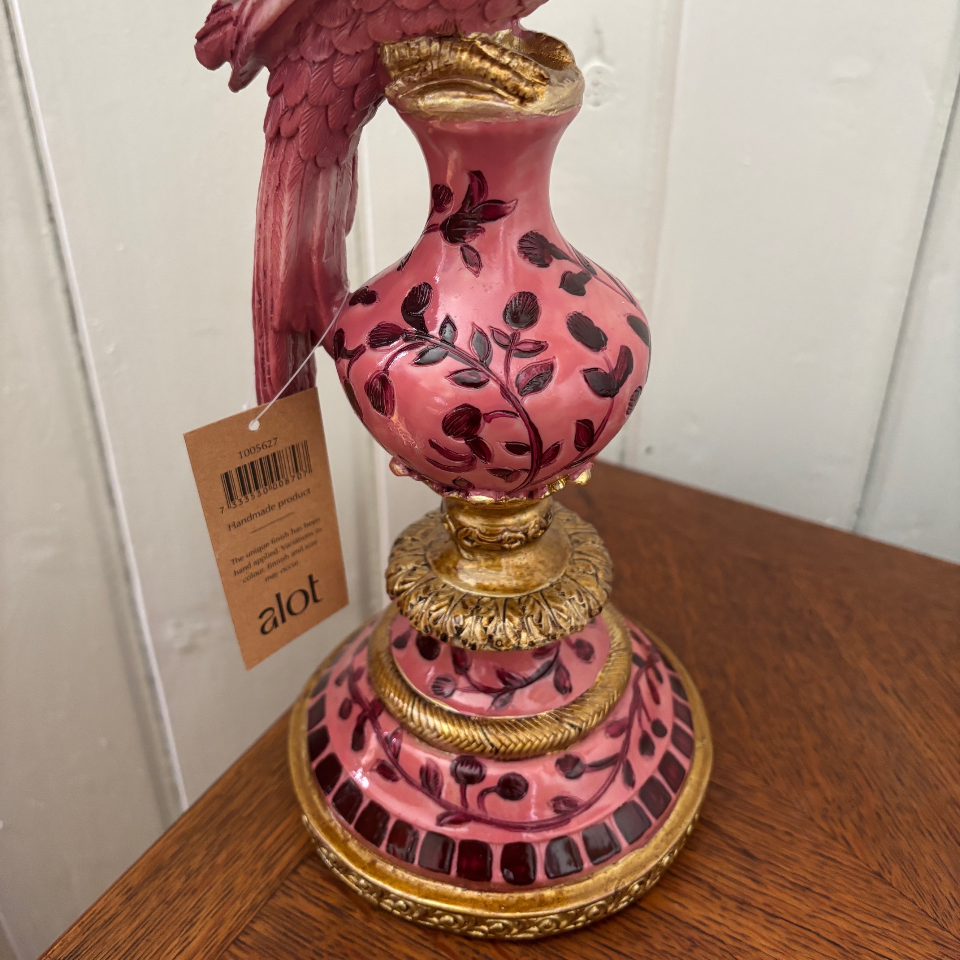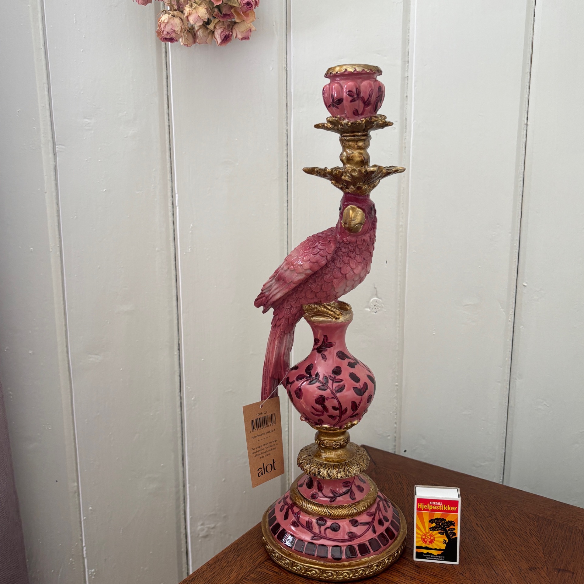 Liker du å ha litt iøynefallende og litt morsomt interiør, bør du se på denne her (og en del andre lysestaker og lampeføtter som er i butikken). Lysestaken har en mørk rosa fugl - antakelig en liten papegøye og ellers går det i gull og blader. Den er hele 40 cm høy, det passer godt med kronelys i holderen og bredde og dybde er 14x13 cm. Laget i polyresin. Håndlaget i Østen.