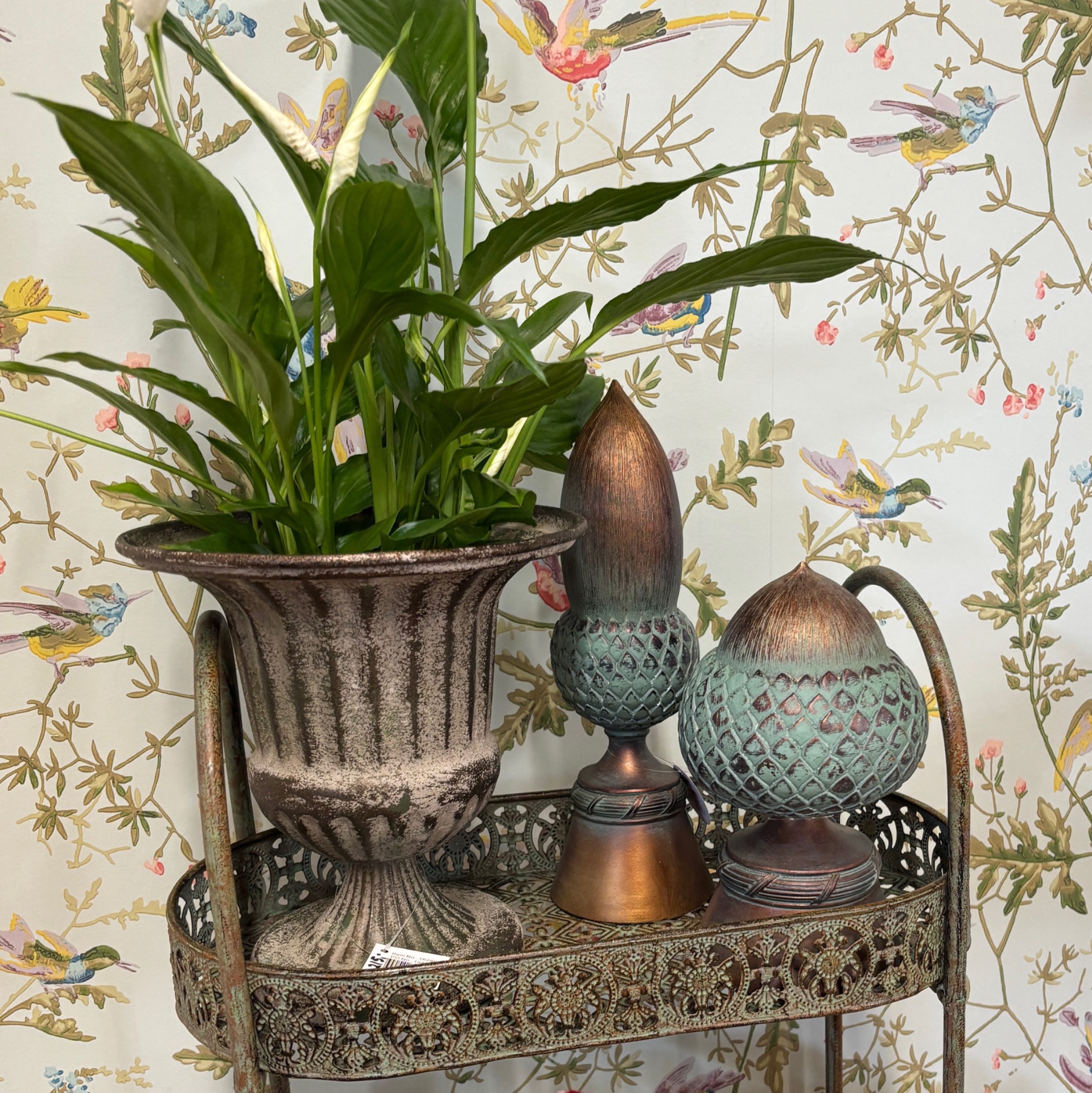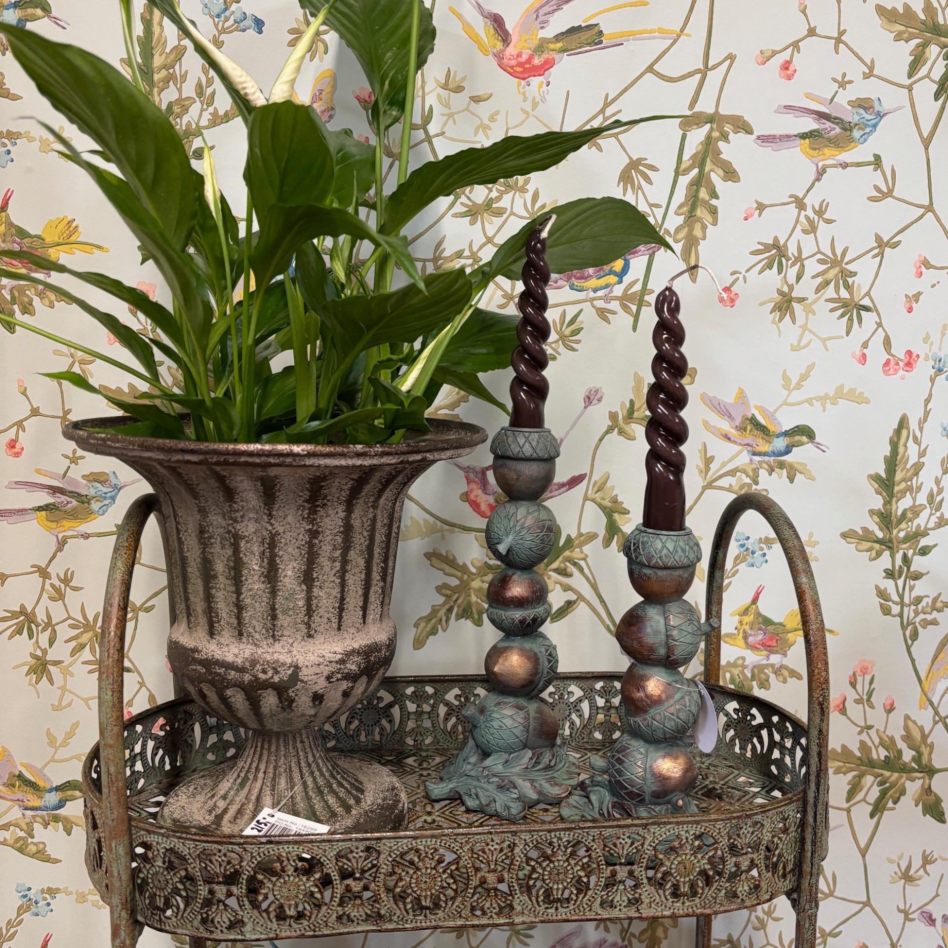 En nett hylle i metall - laget i fargen antique grønn. Flott gjennombrutt mønster på hyllene. Passer like godt inne som ute, og det er jo opp til deg hva du ønsker å fylle den med. På bildene er det fylt med såper og kremer (alt er i nettbutikken til salgs).