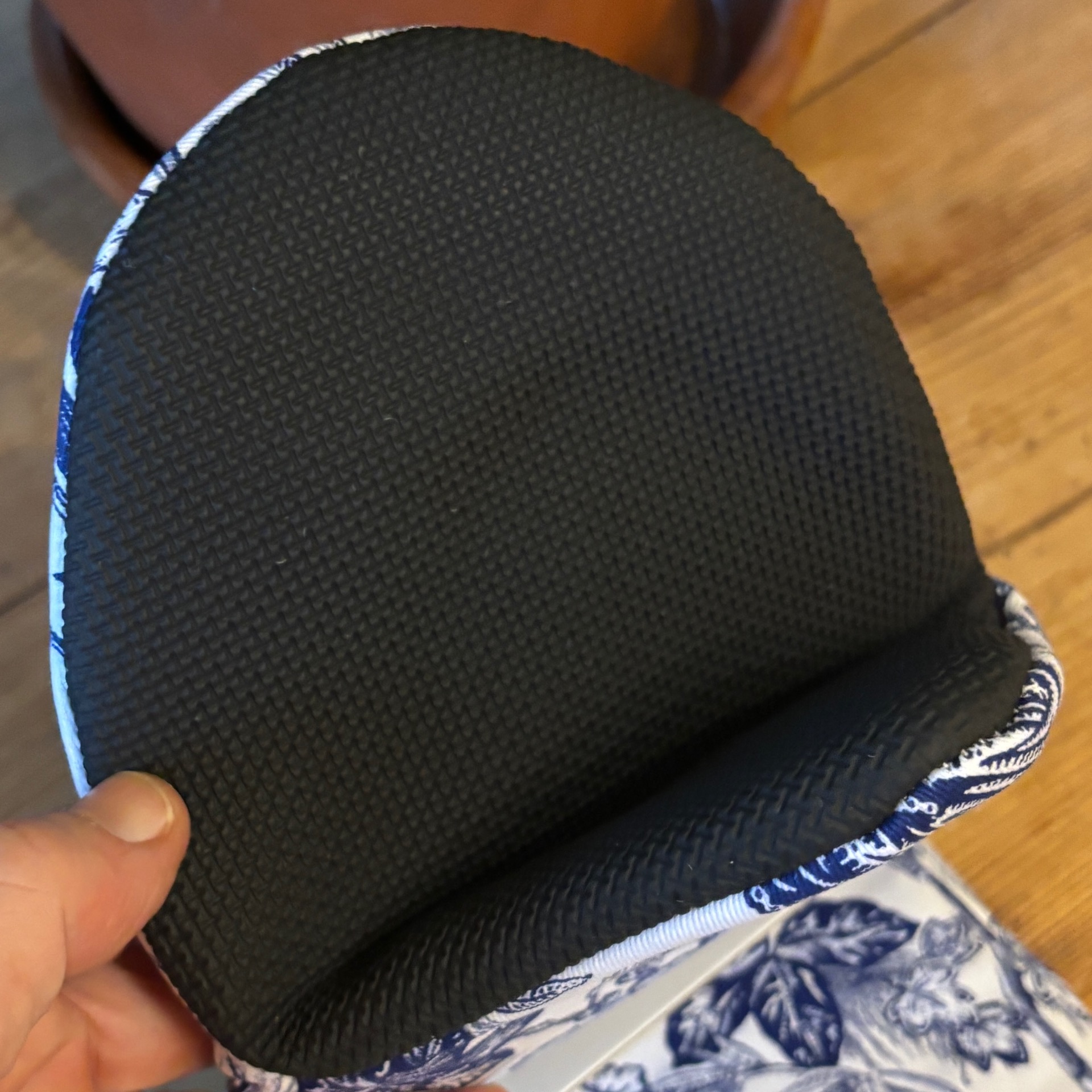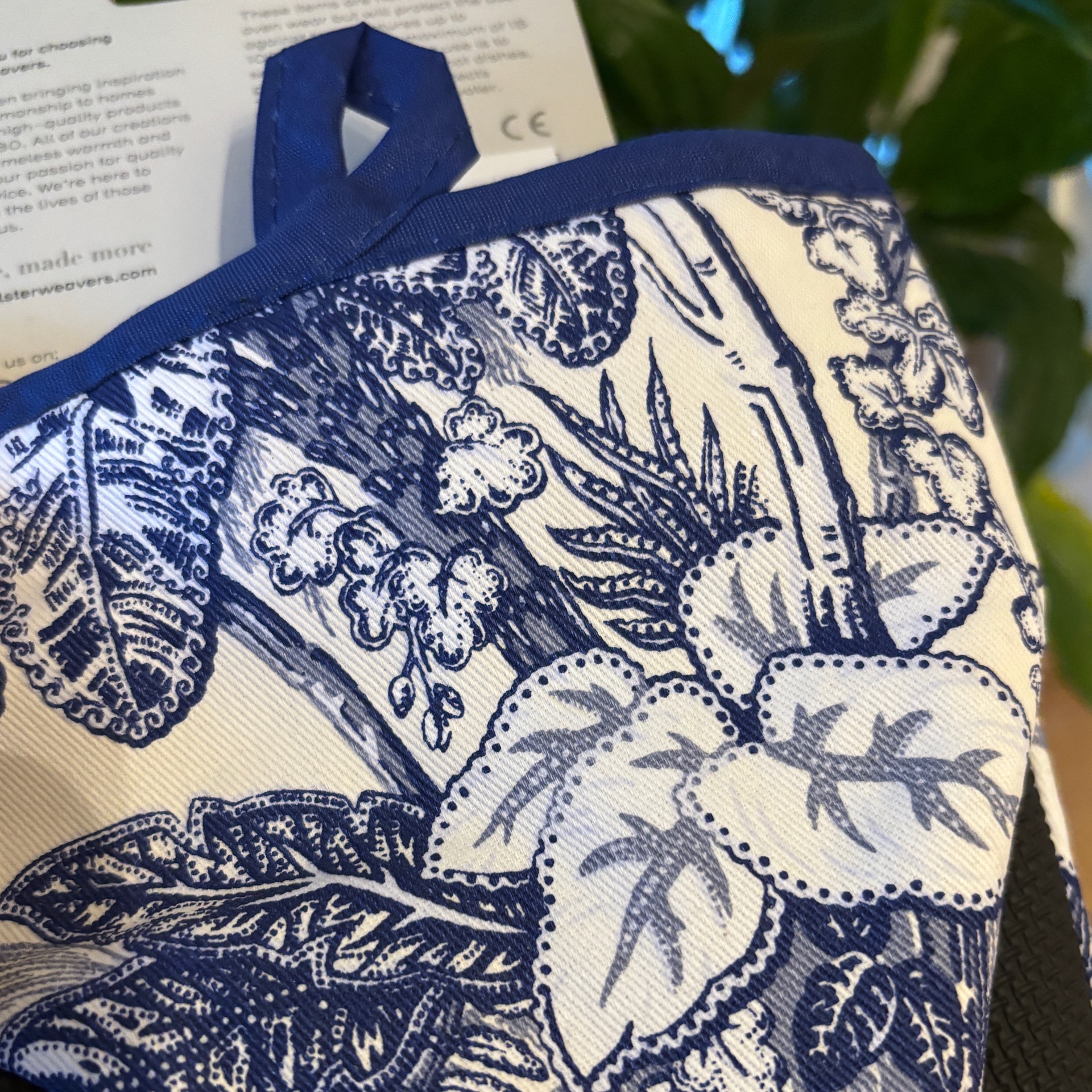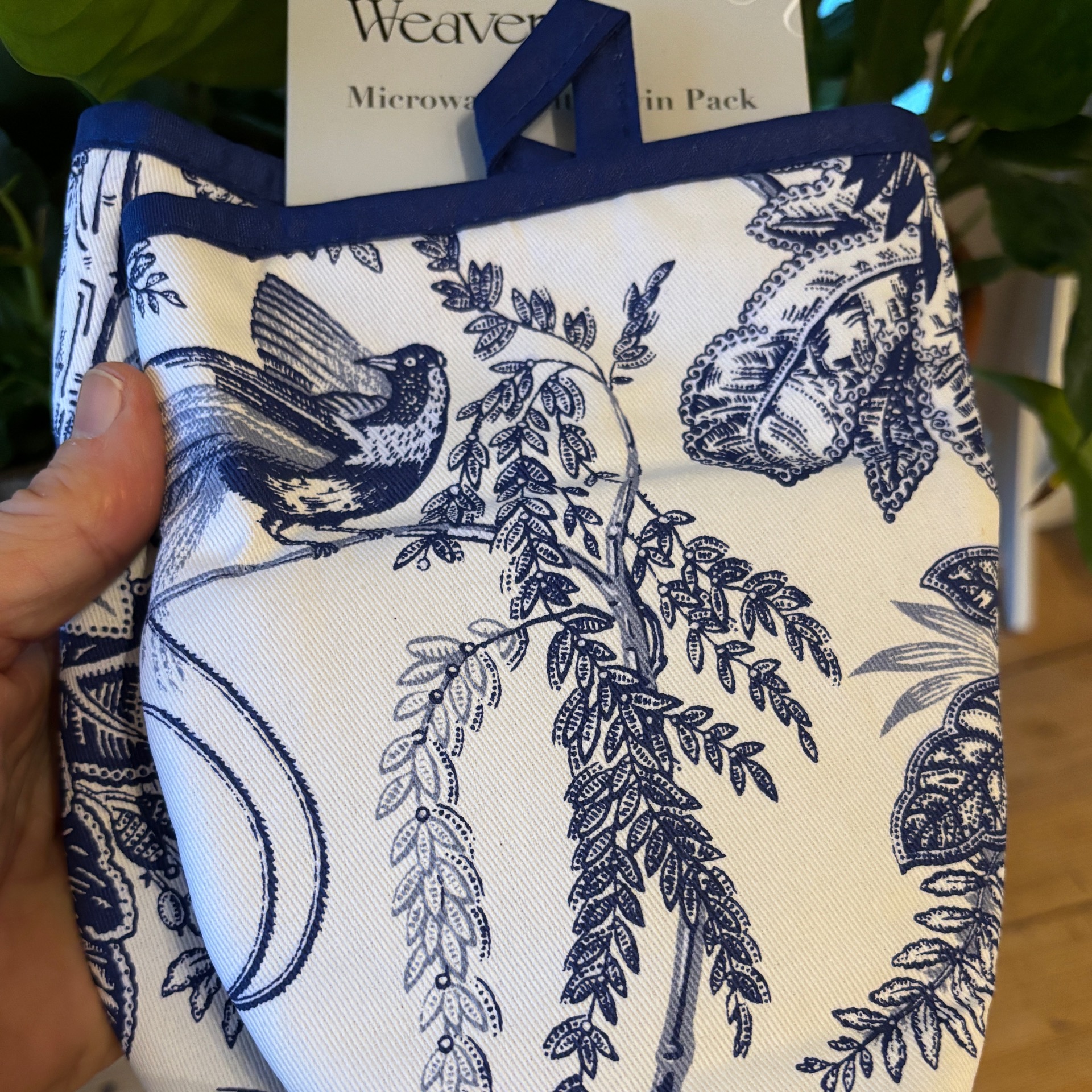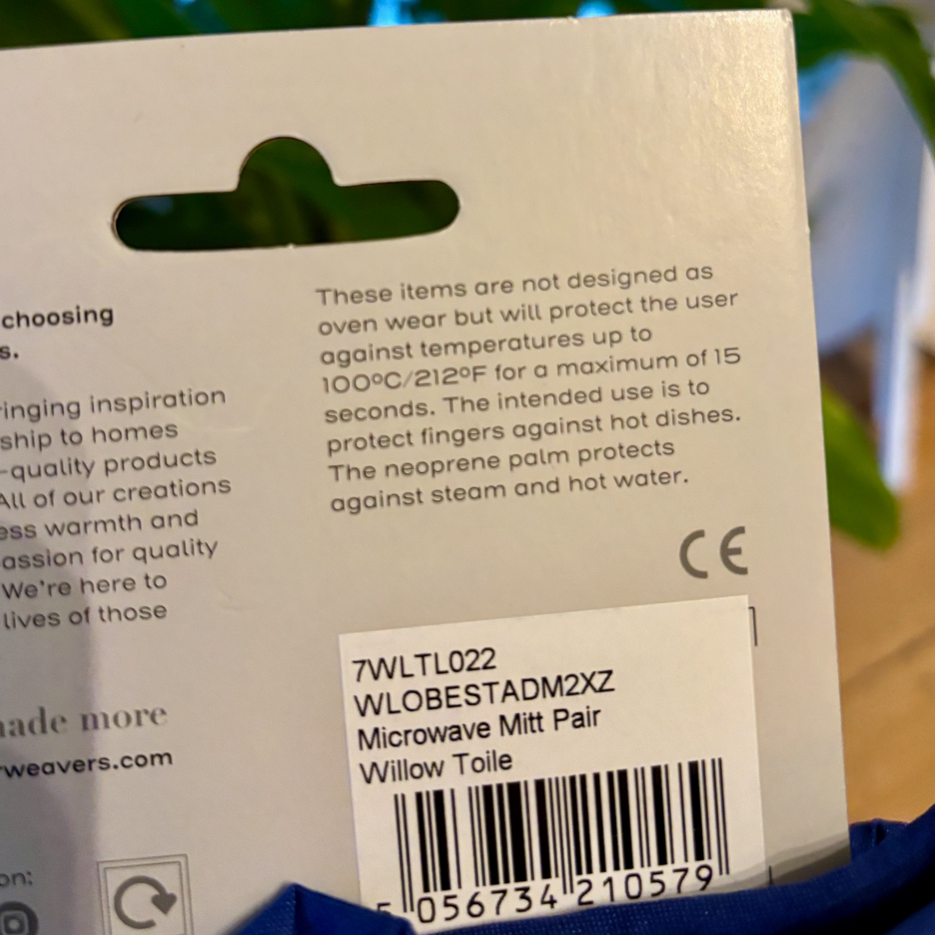 Mikrovott-settet er laget i tykk bomull (topp, fôr og innside) og i griipeområdet er det sort silikon, som gjør at du slipper å brenne deg. Votten er 18 cm. Produsent er Ulsters Weavers.