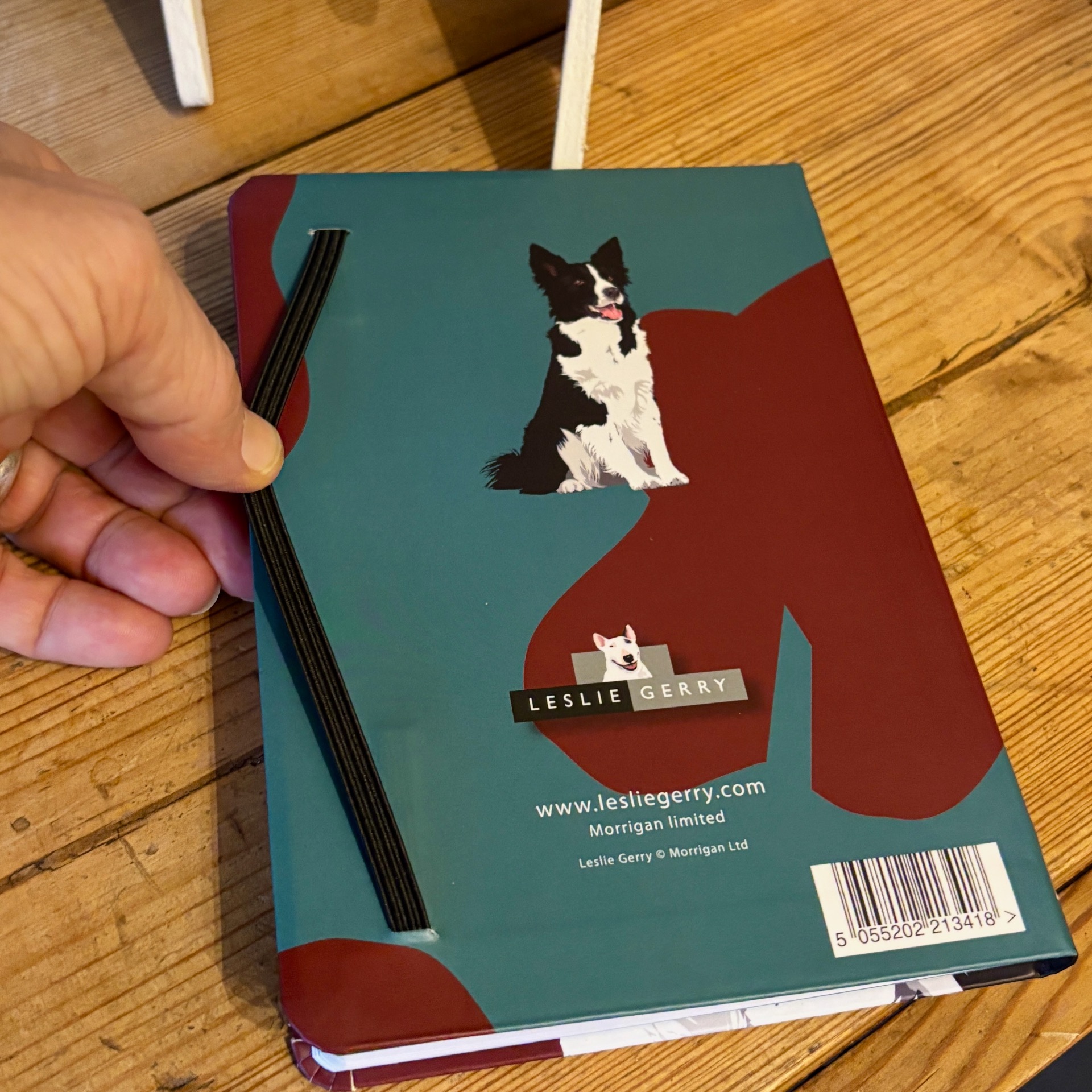 Artig notatbok med strikk (som holder boken lukket eller som bokmerke) med en border collie på fronten. Boken er i format 17,5x12,5 cm. Bredde er 1,3 cm. Det er hvite notatsider. Ca 100 sider.
