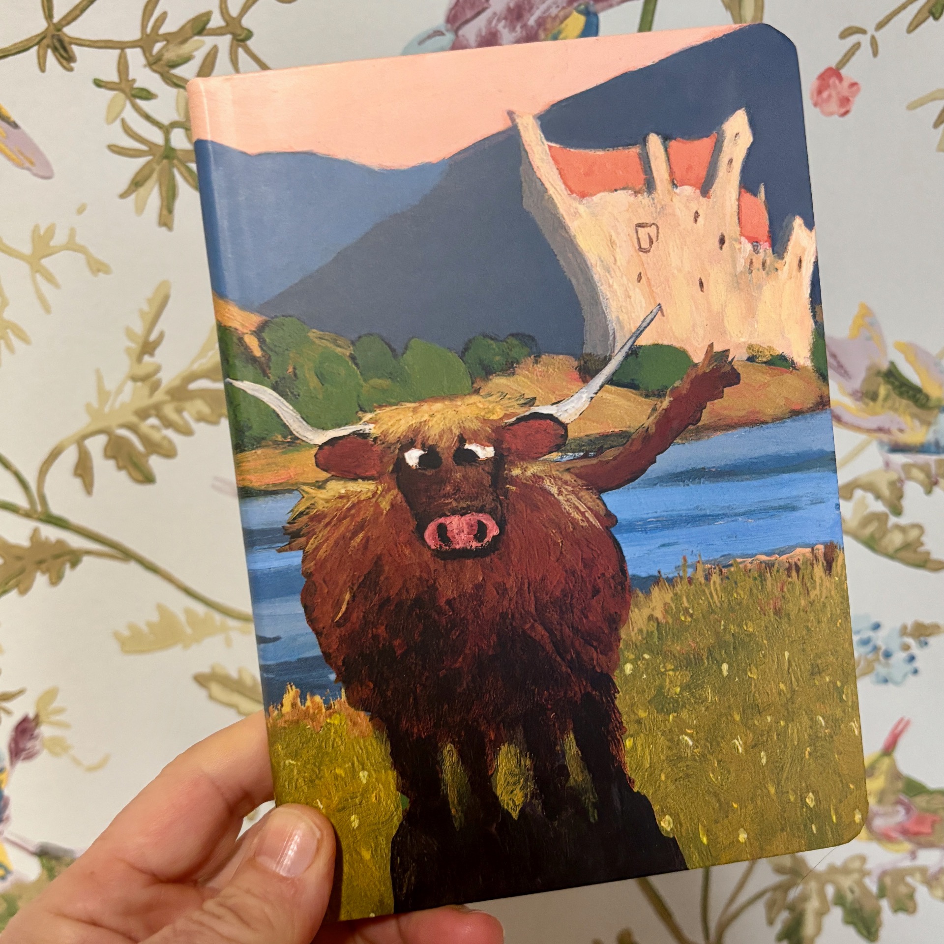 Festlig notatbok med highland ku (eller kanskje det er okse?) på front og bakside. En forseggjort bok med hvite sider, ca 100 sider.