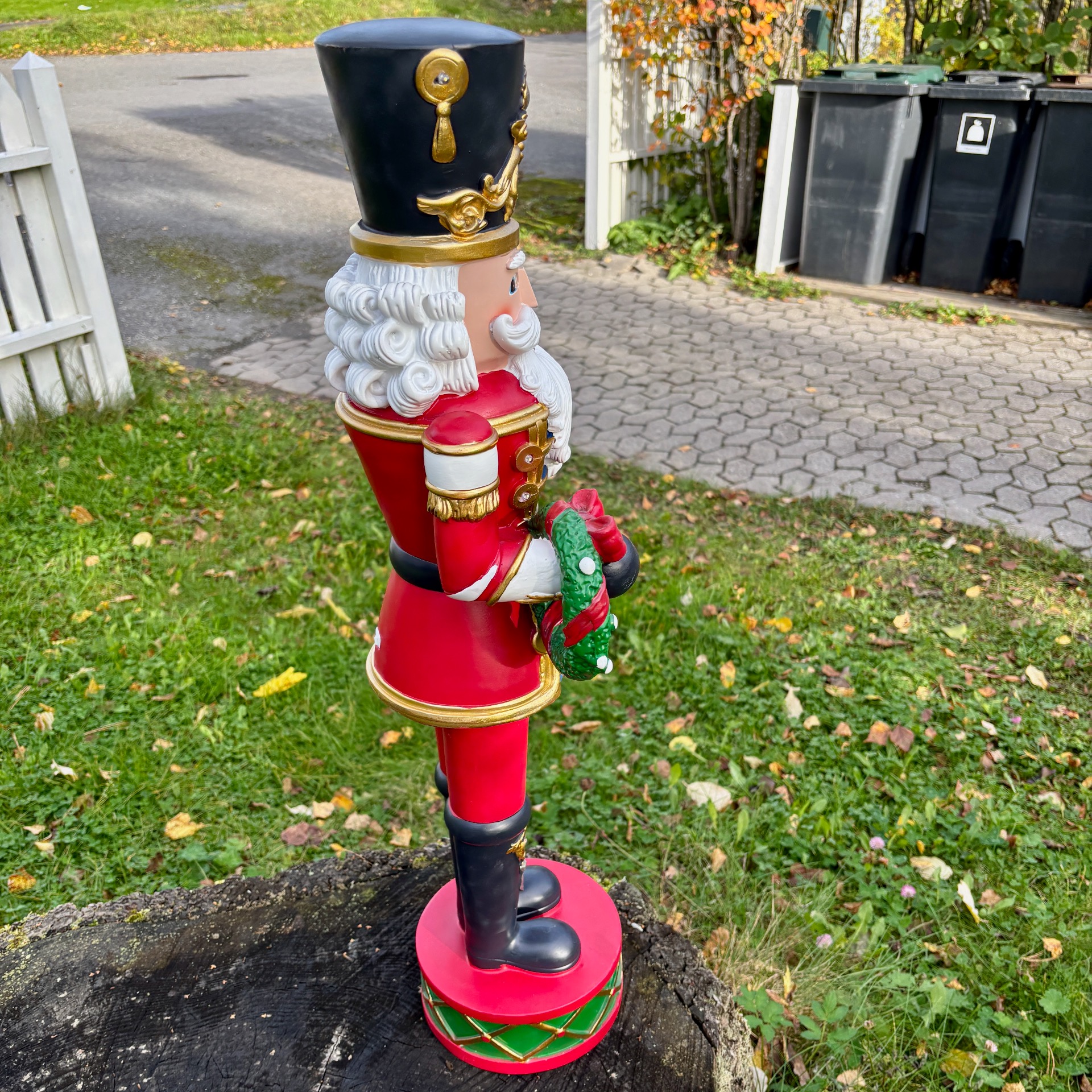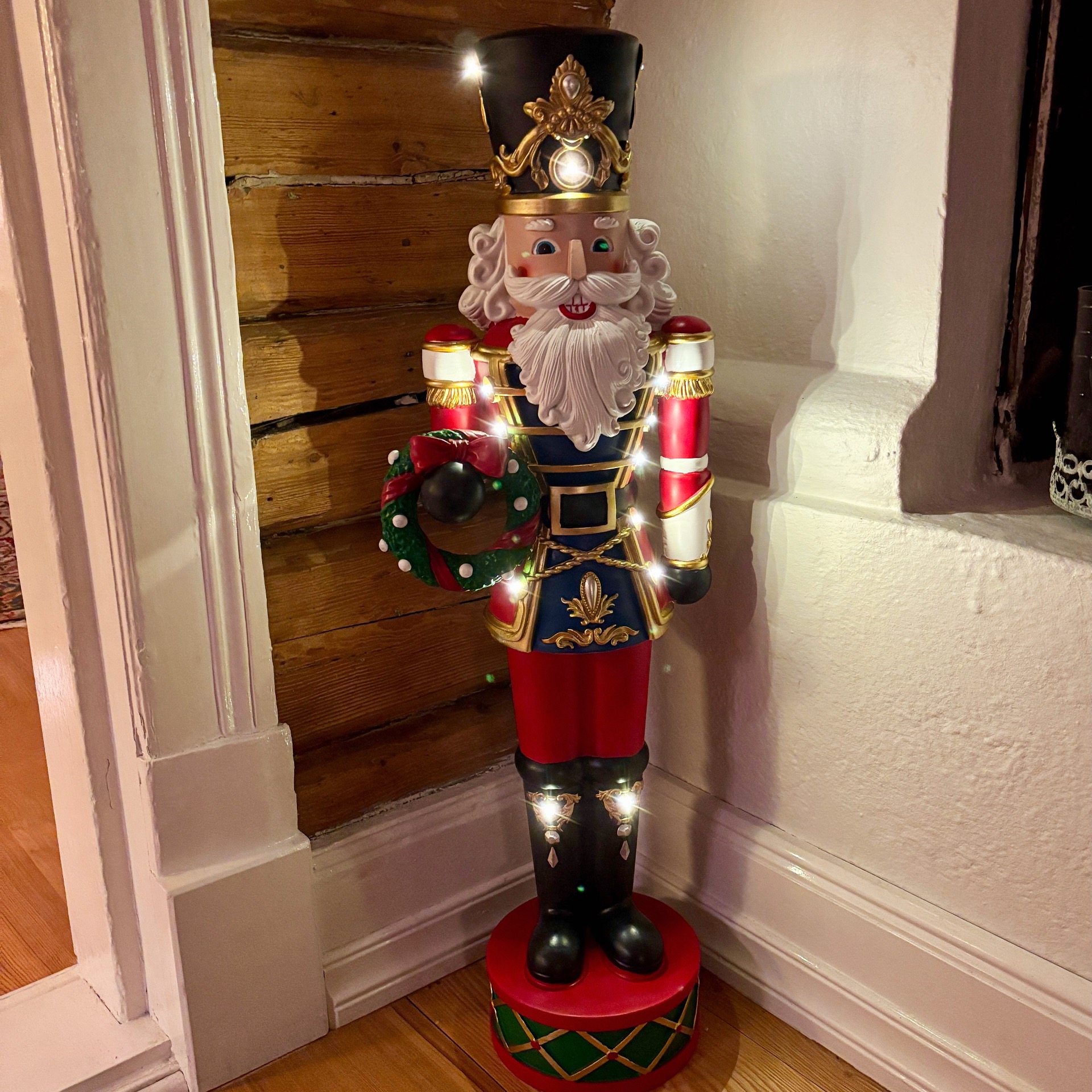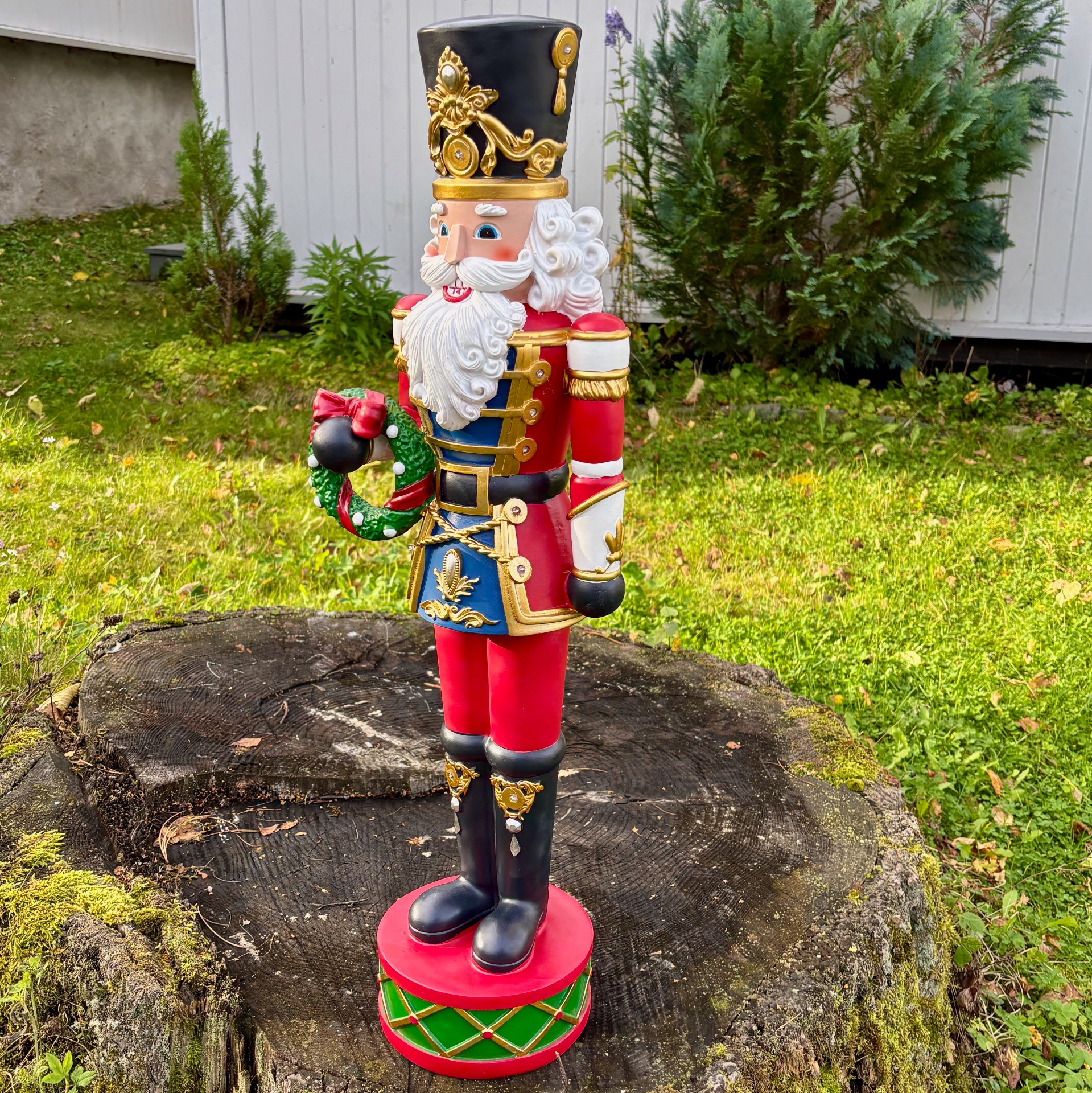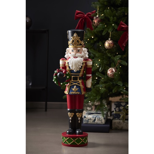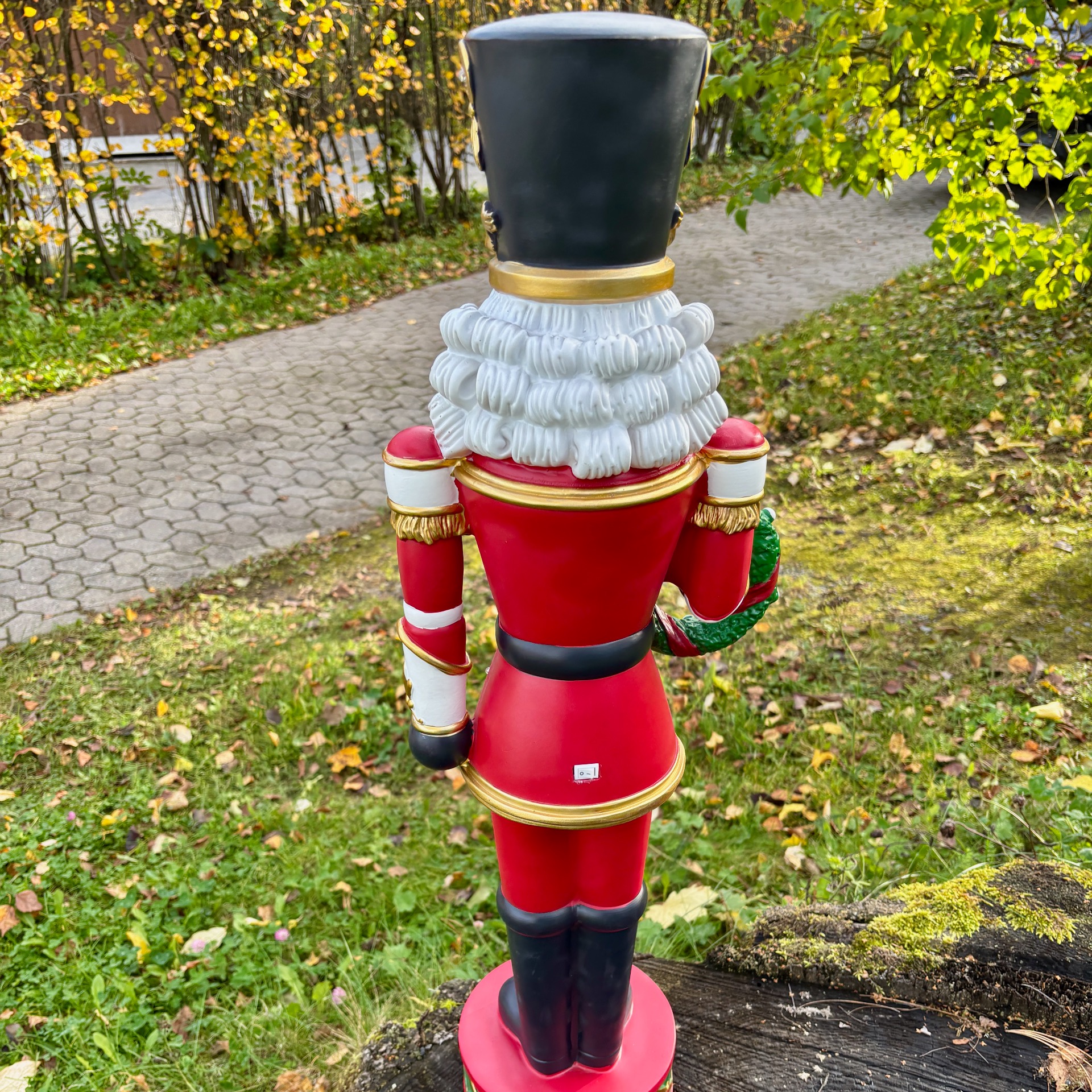 En høy og stor julete nøtteknekker i polyresin. Høyden er hele 80 cm og bunn 26,7x21 cm. LED-lys som går på tre batterier. Enkel på-slåing: knapp (hvit) i ryggen. Batteri følger med.
