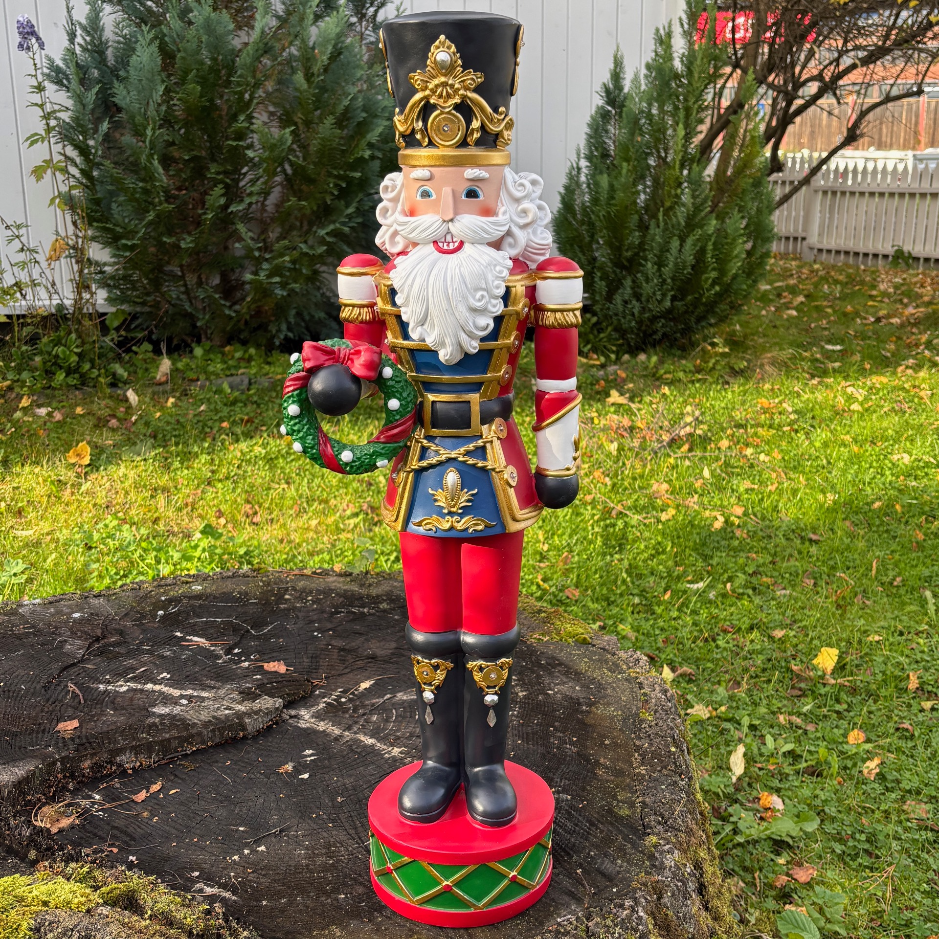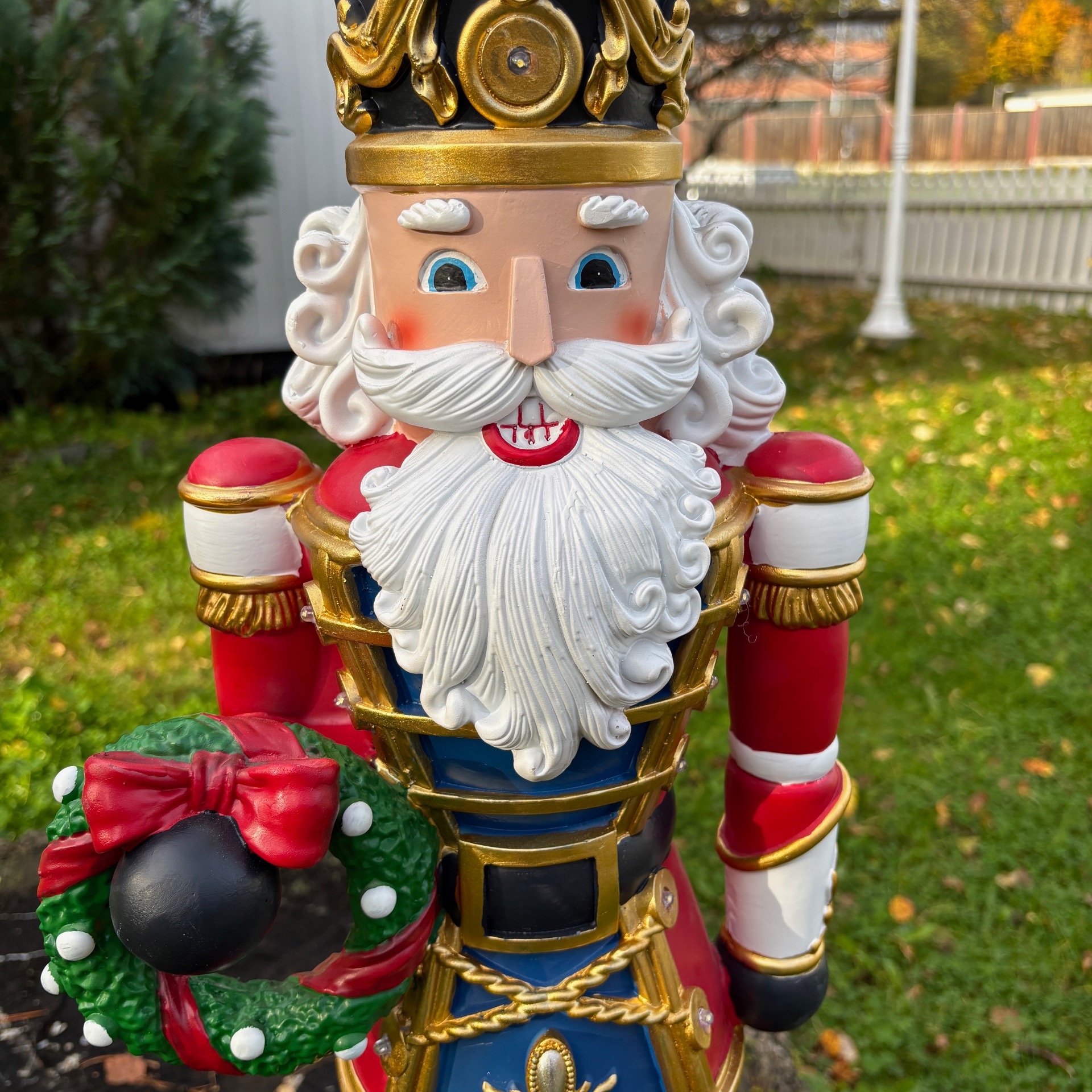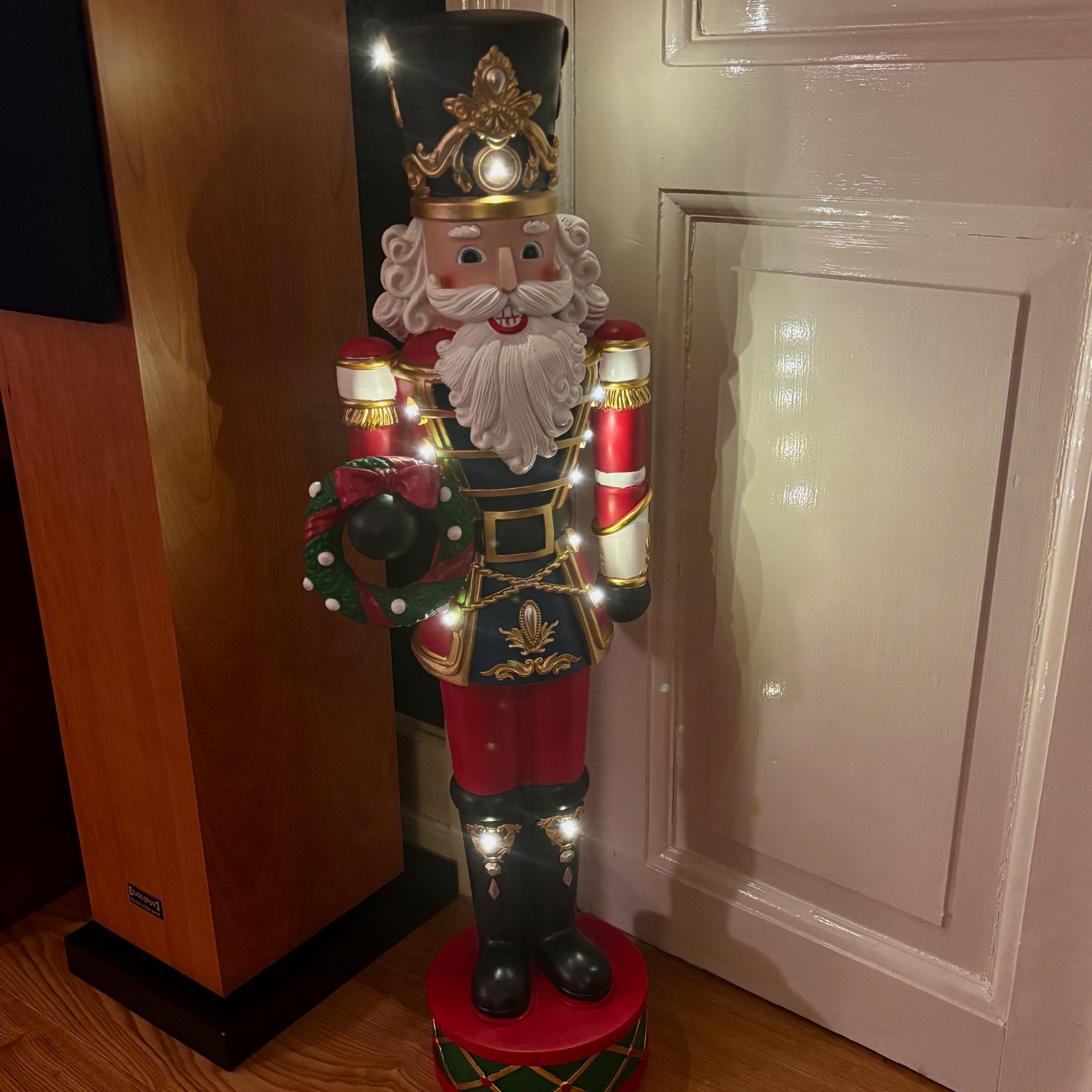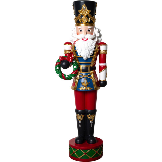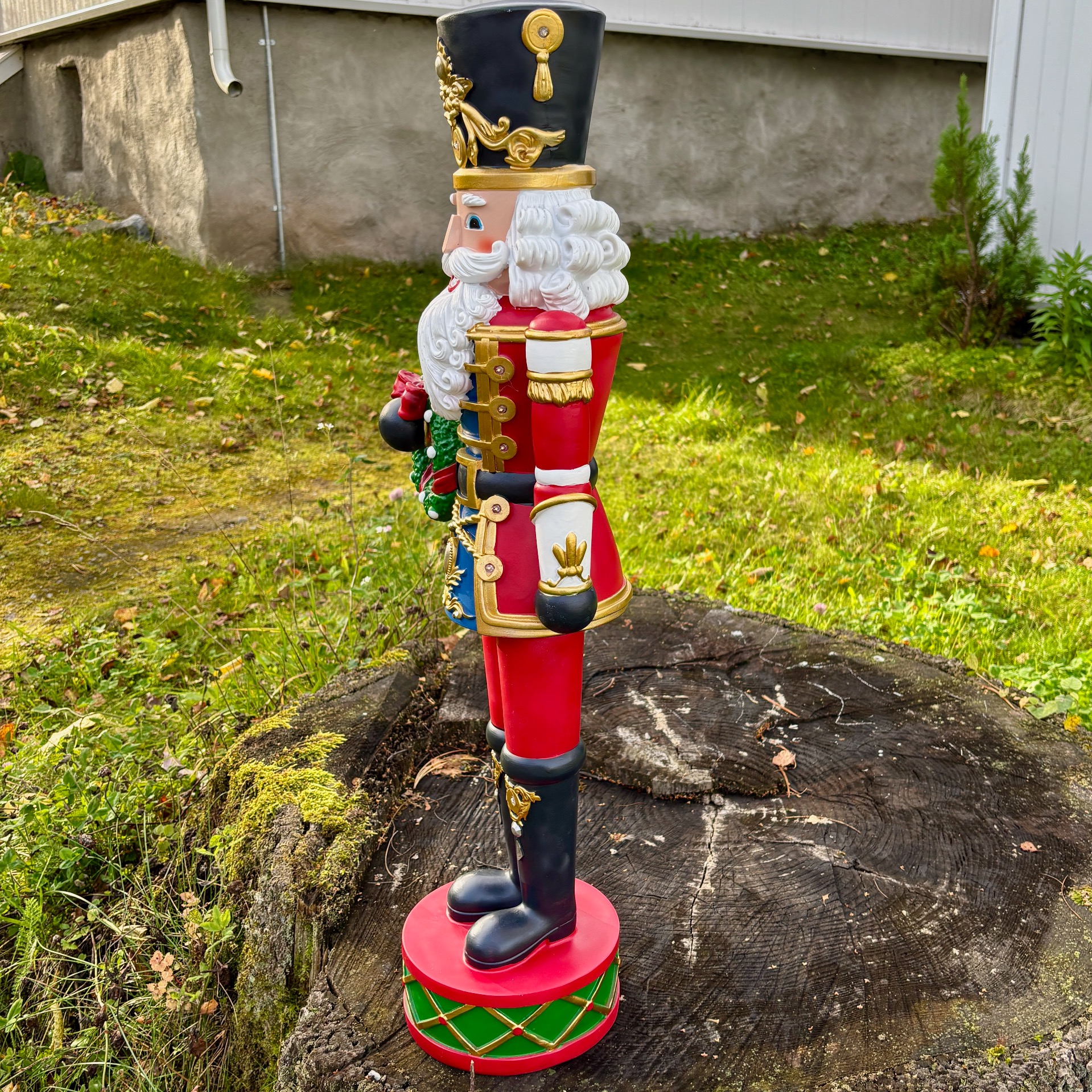 En høy og stor julete nøtteknekker i polyresin. Høyden er hele 80 cm og bunn 26,7x21 cm. LED-lys som går på tre batterier. Enkel på-slåing: knapp (hvit) i ryggen. Batteri følger med.