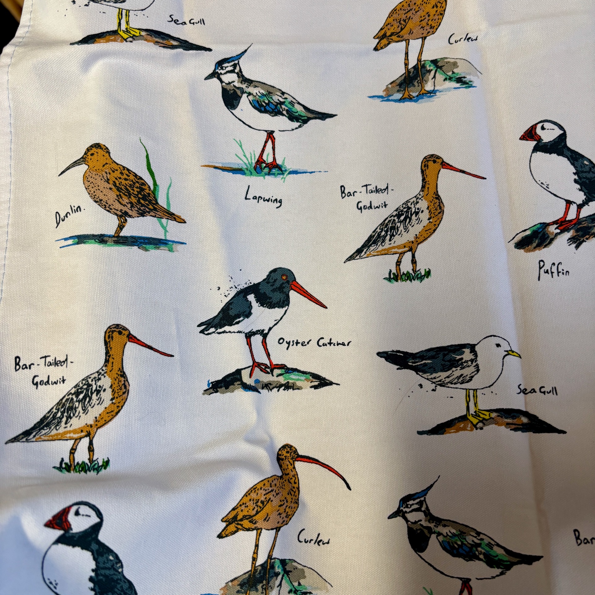 Irske Ulsters Weavers har produsert kjøkkenhåndkleet, som har en mengde fugler som motiv. Lys blå kant oppe og nede og på ene hjørnet oppe/bak er det hempe. 100% bomull. Str: 47x76 cm.