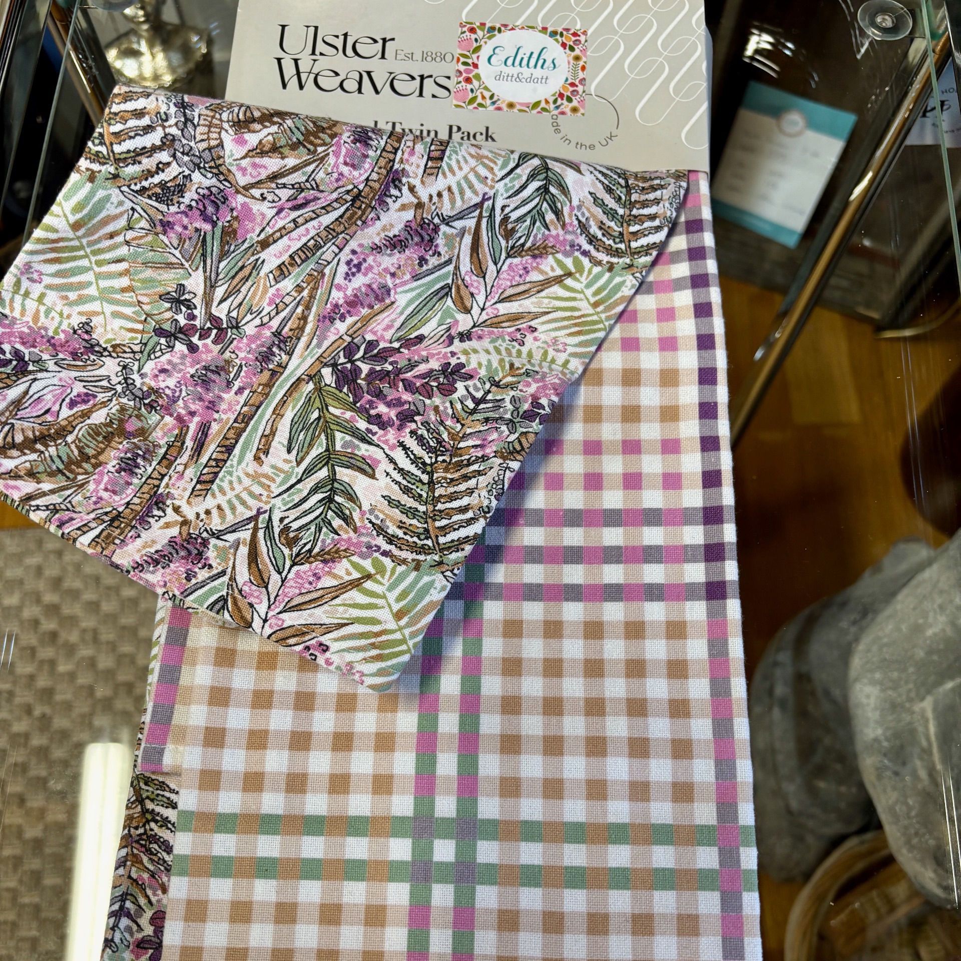 Irske Ulsters Weavers har produsert dette settet med to bomullshåndklær til kjøkkenet. Det ene er rutet, det andre er blader og grener - alt i lilla-tone. God kvalitet - i kjent Ulsters Weavers-stil :-)