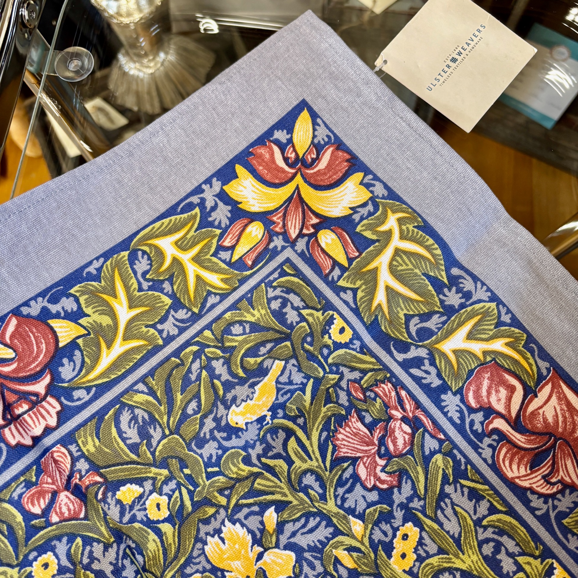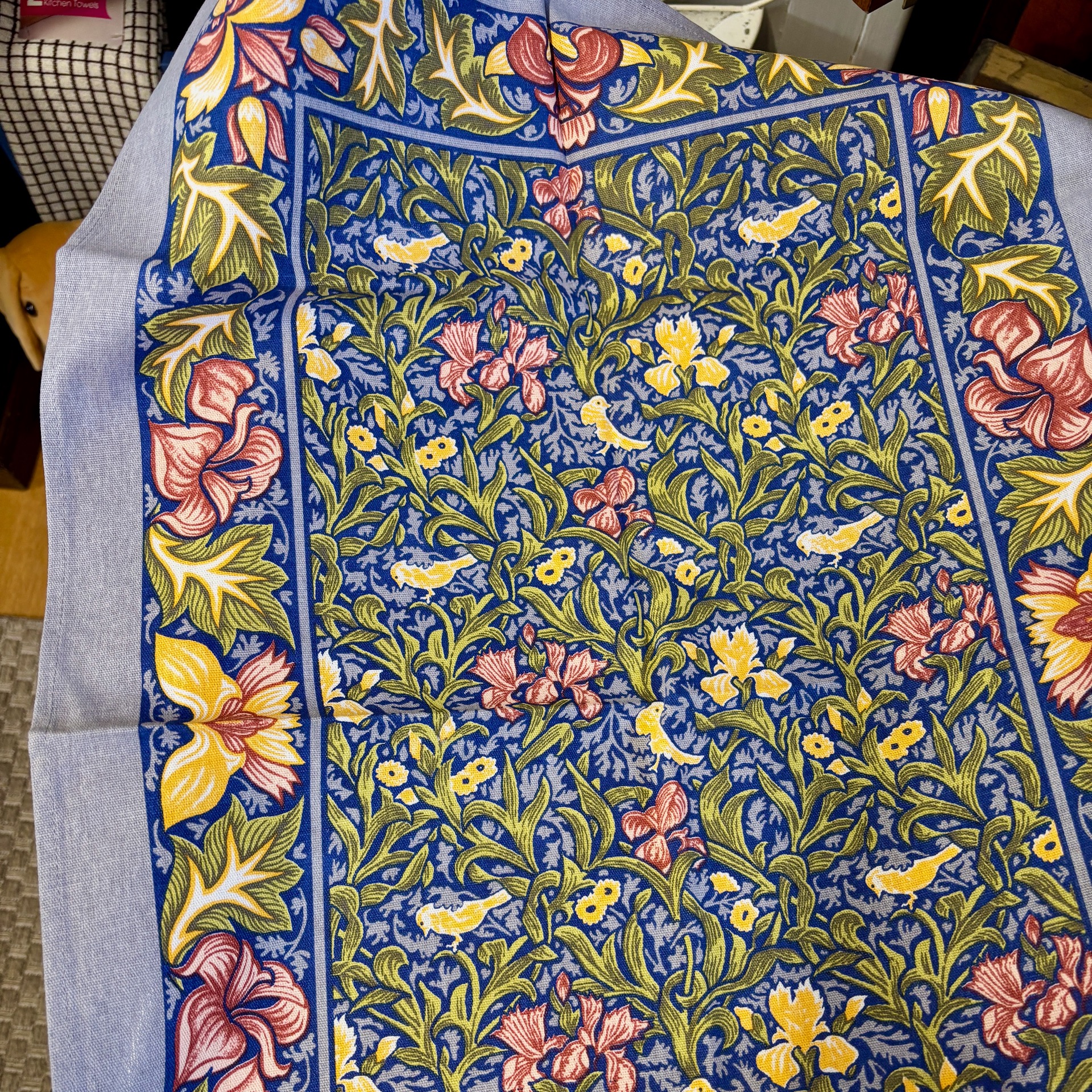 Et klassisk motiv med blader og gule fugler - tett i tett og lyseblå/dempet blå kanting. Det er i 100% bomull og produsert av irske Ulsters Weavers - de produserer kun kvalitet. :-)
