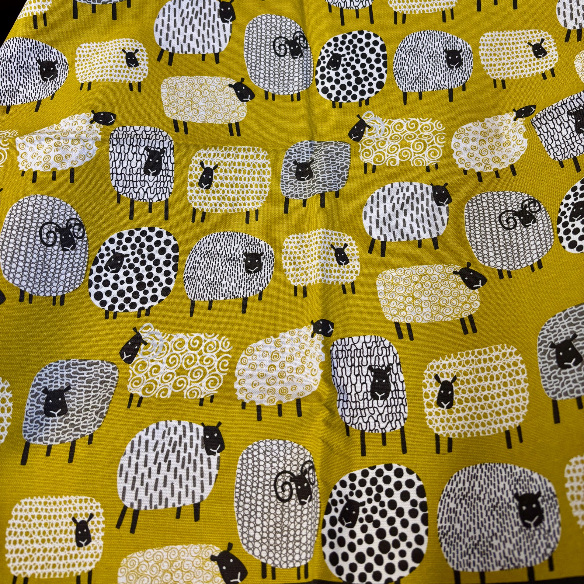 Det er sennepsfarget bakgrunn og sauene er i gult, grått og hvitt med mønster. For et festlig kjøkken/oppvaskhåndkle. :-)