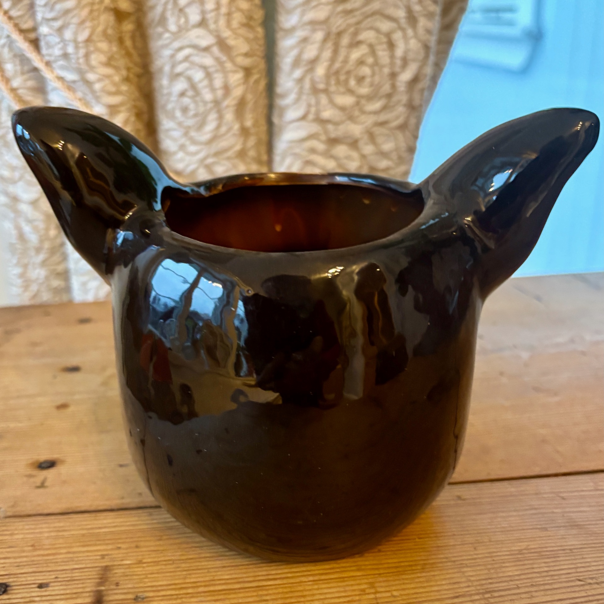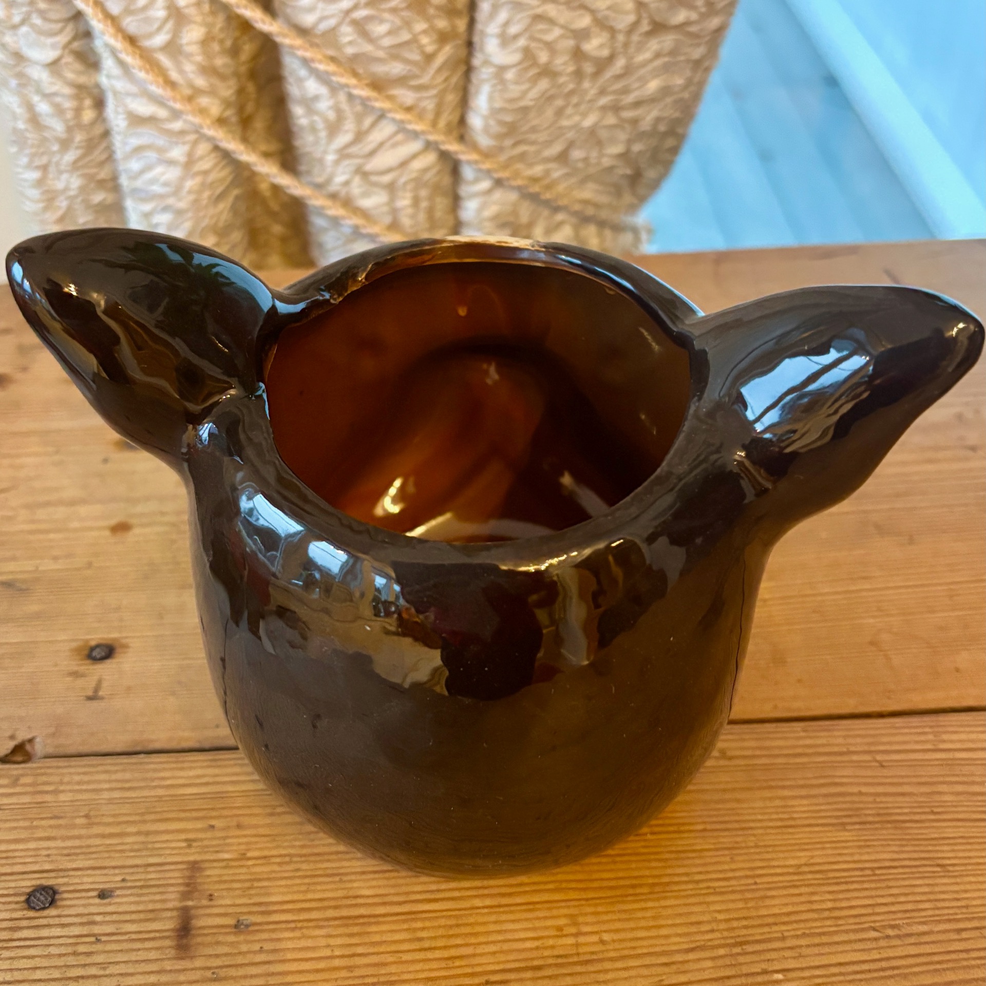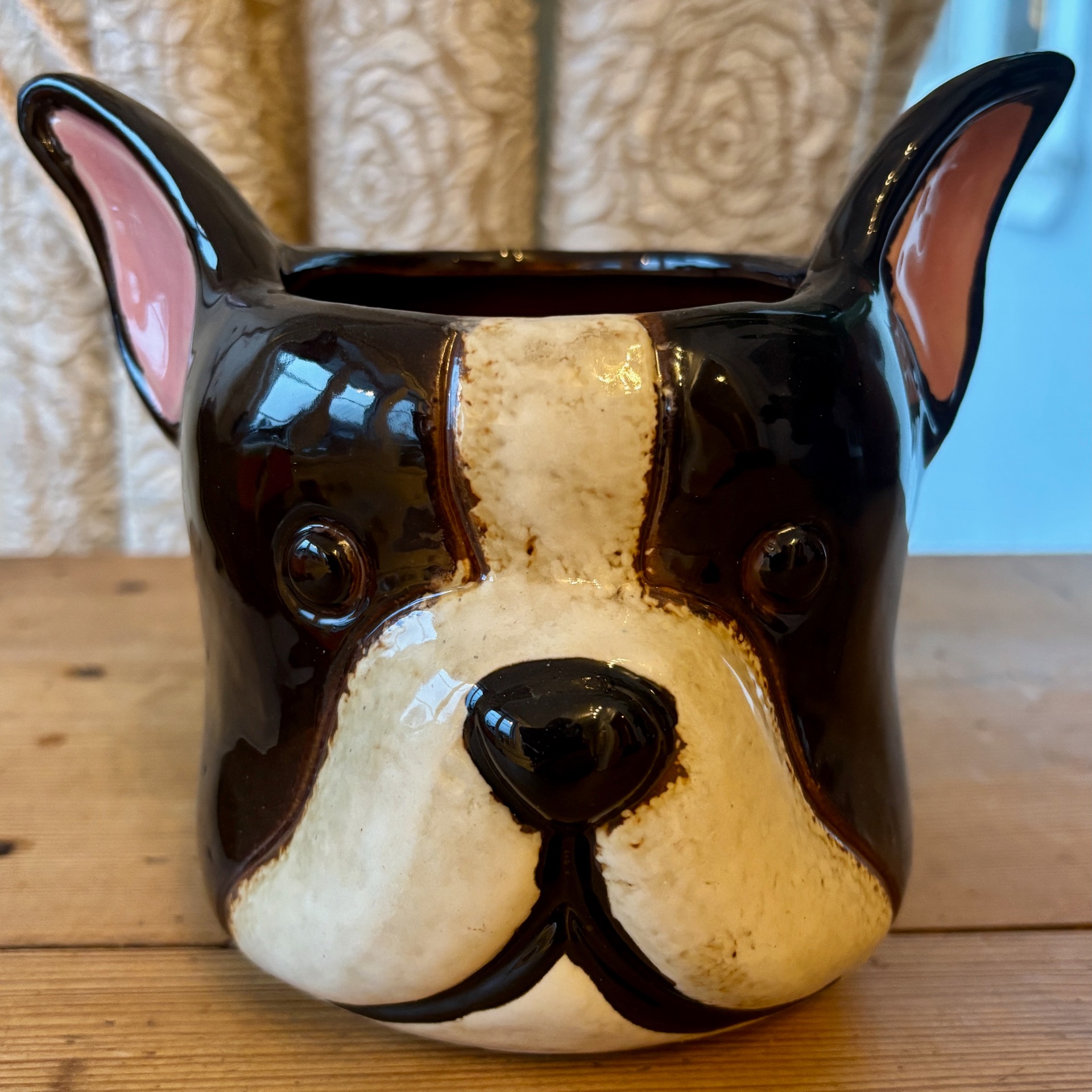Herlig, glasert blomsterpotte eller blomstervase med et fransk bulldog-fjes. Den er laget i keramikk og glasert.