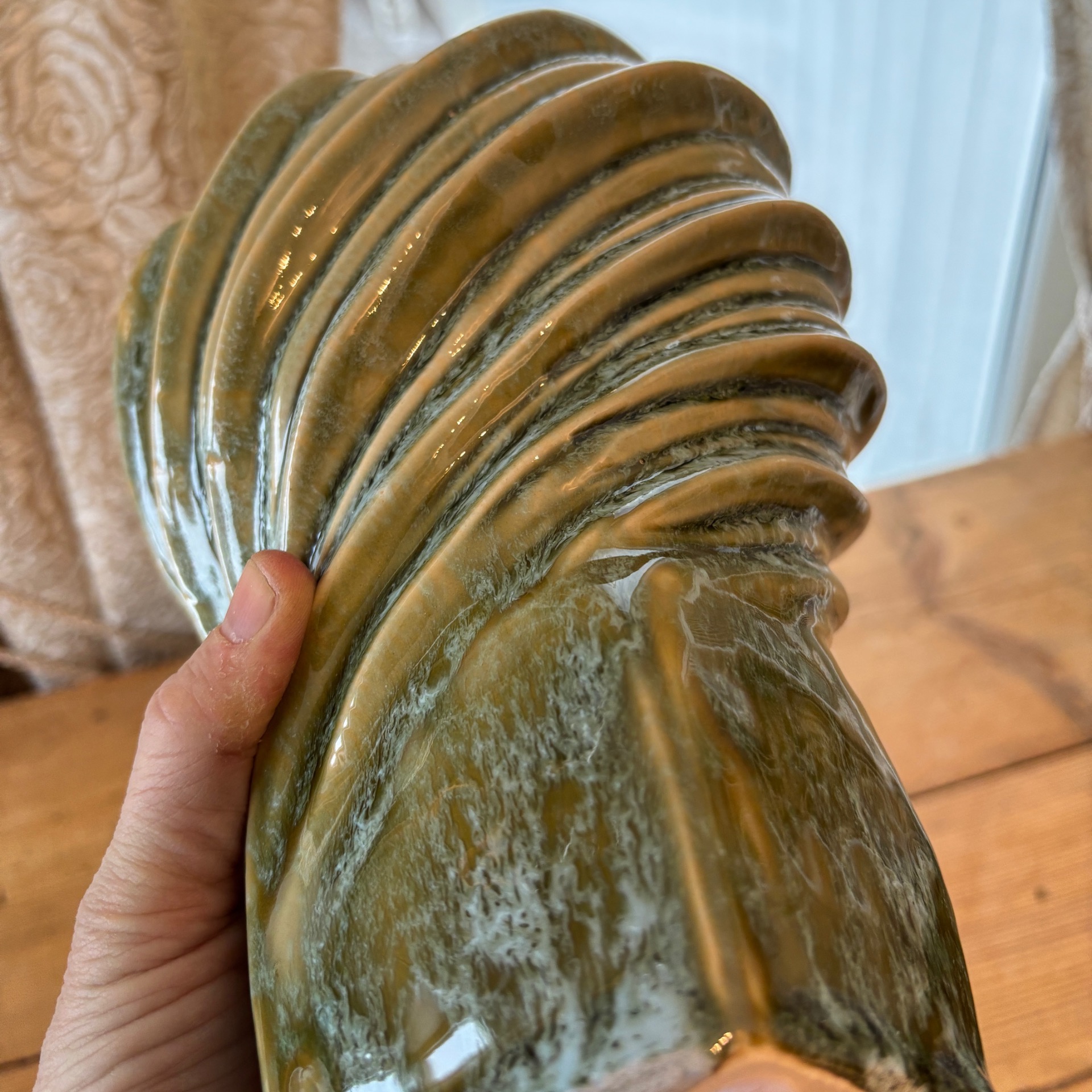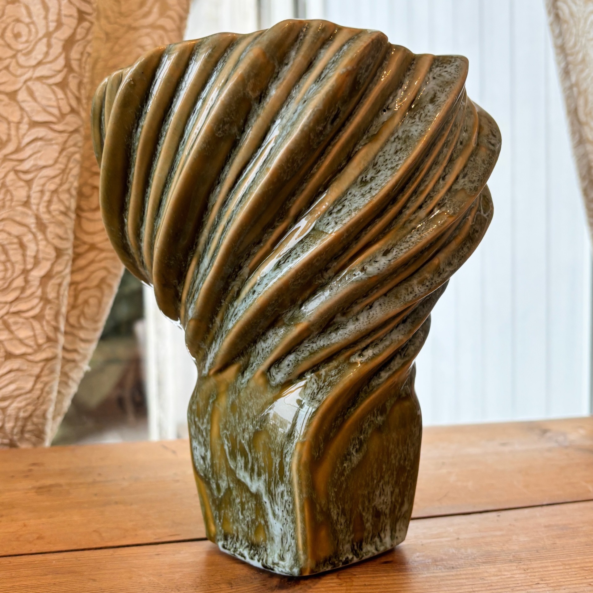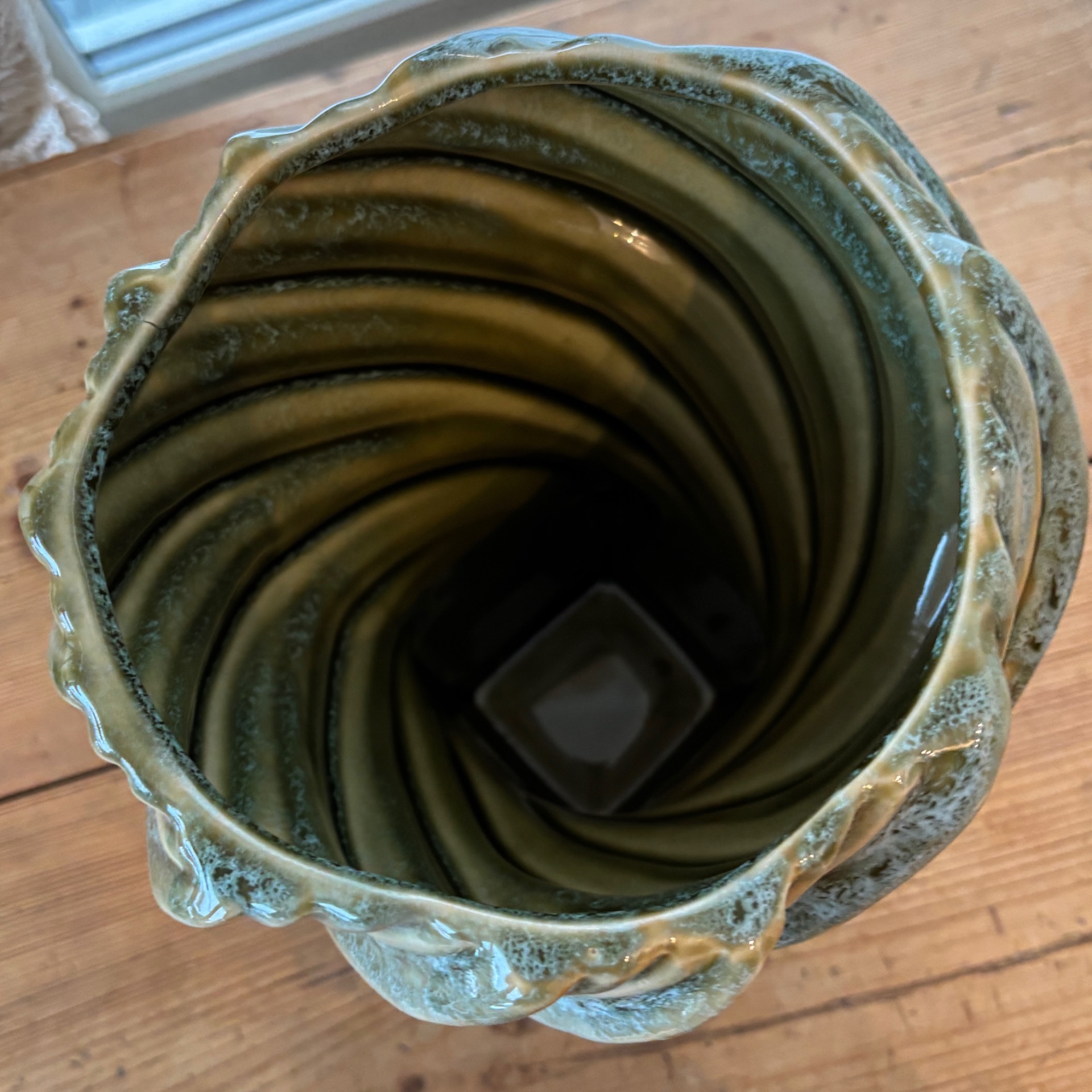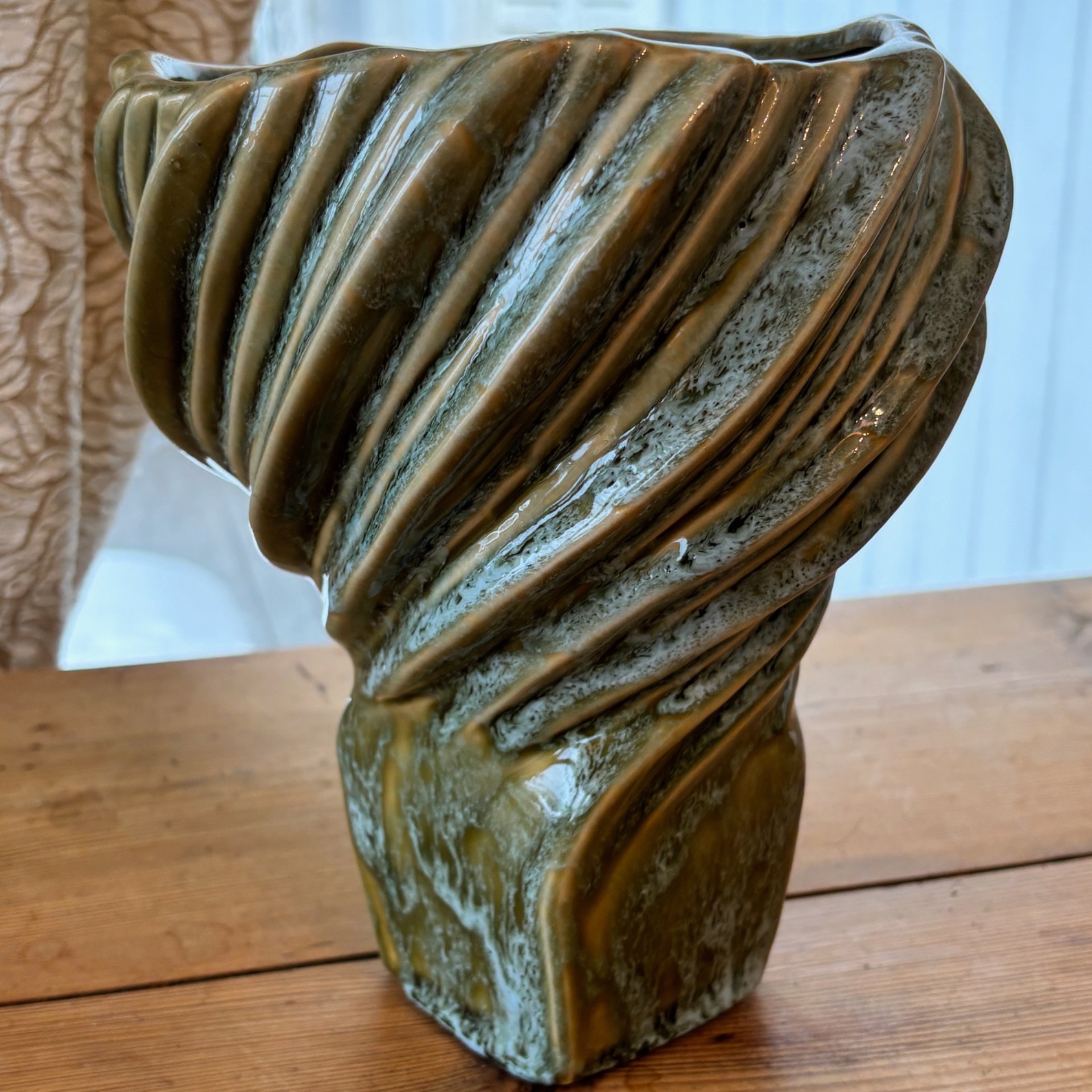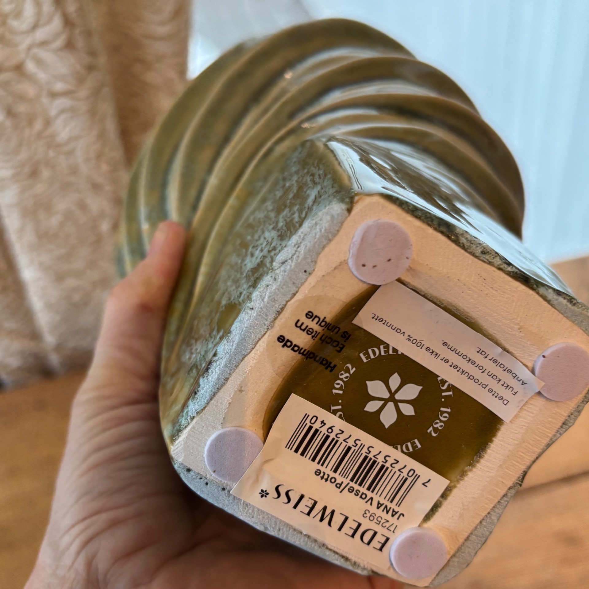 Virkelig sjarmerende og vakker vase/potte! Den er laget i keramikk og er håndlaget i Østen. Produsent er Edelweiss. Høyde er 22 cm og diameter er 17 cm. Nydelige, duse grønnfarger og det ser jo ut som den er vridd.