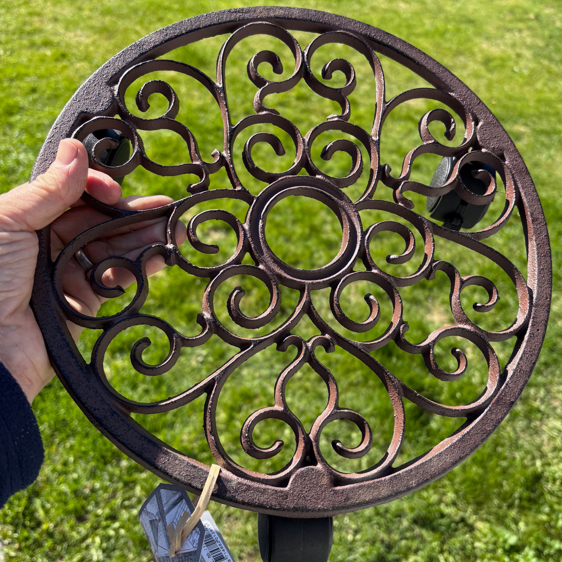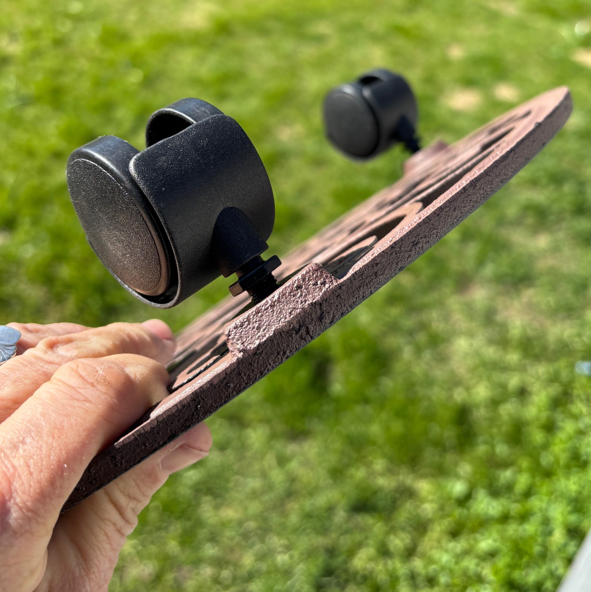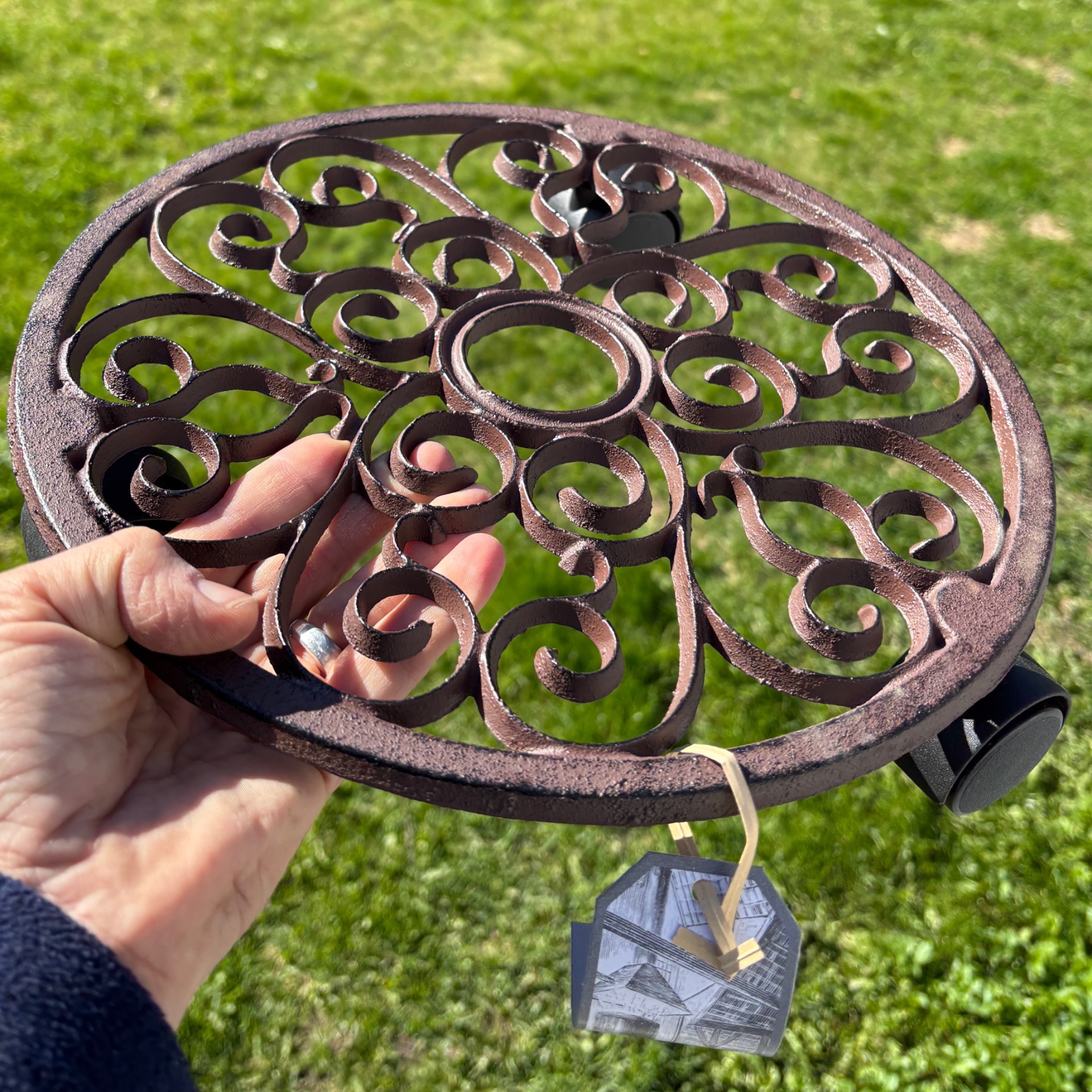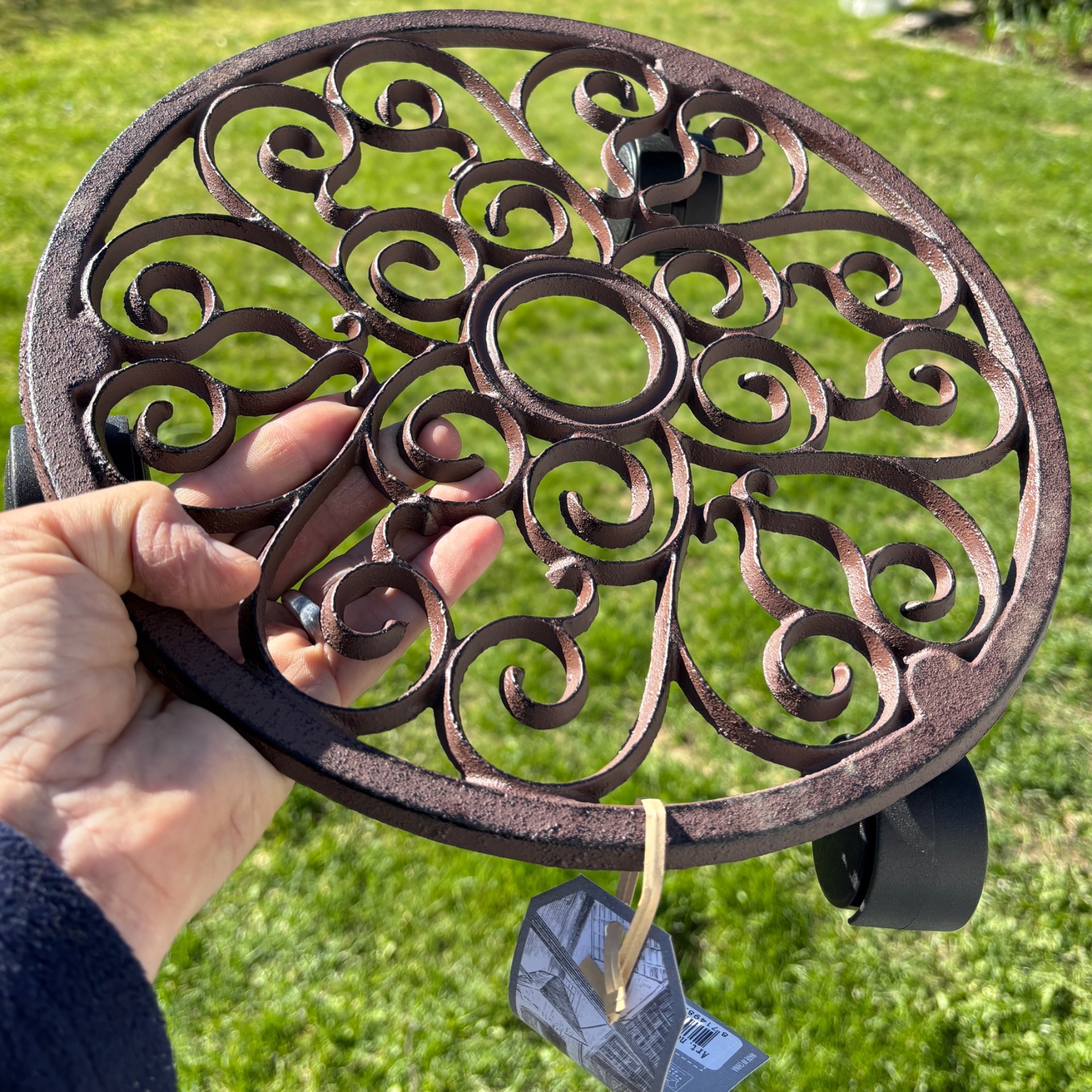 Praktisk og nyttig plantetralle i støpejern på tre hjul. Trallen tåler opptil 30 kg. Diameter er 29 cm og høyde er 6,6 cm. Den veier 1,3 kg. Det er vel unødvendig å fortelle at det er smart med sånne løsninger når pottene er tunge og må flyttes på :-)