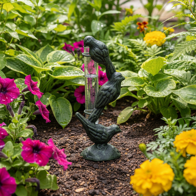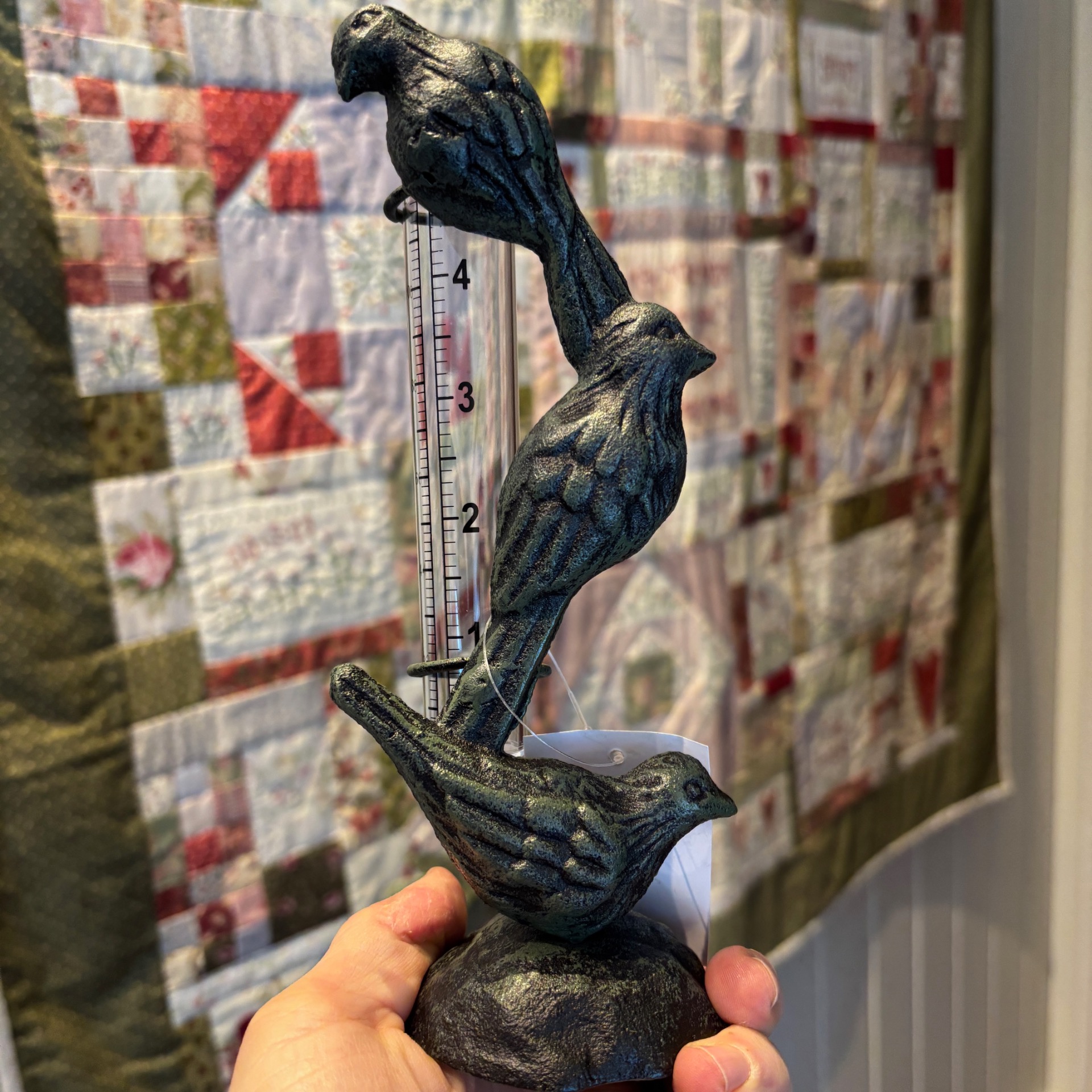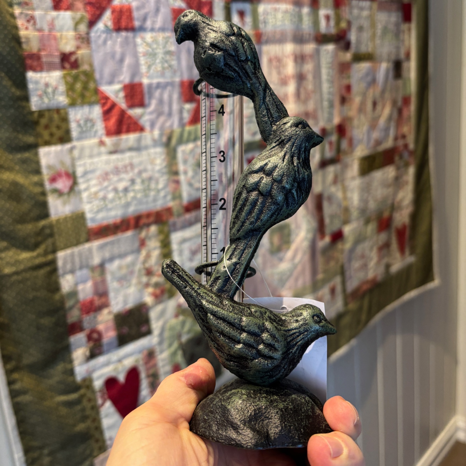 Tre fine fugler som måler nedbøren! Den er ikke allverdens stor - høyde er 20,5 cm og den er laget i jern. Grønn/sort i farge - fargen kalles antique green. Beholderen er lett å ta ut for å tømme vannet. Fin regnmåler for deg som ikke har hage, men allikevel har lyst til å ha regnmåler :-)