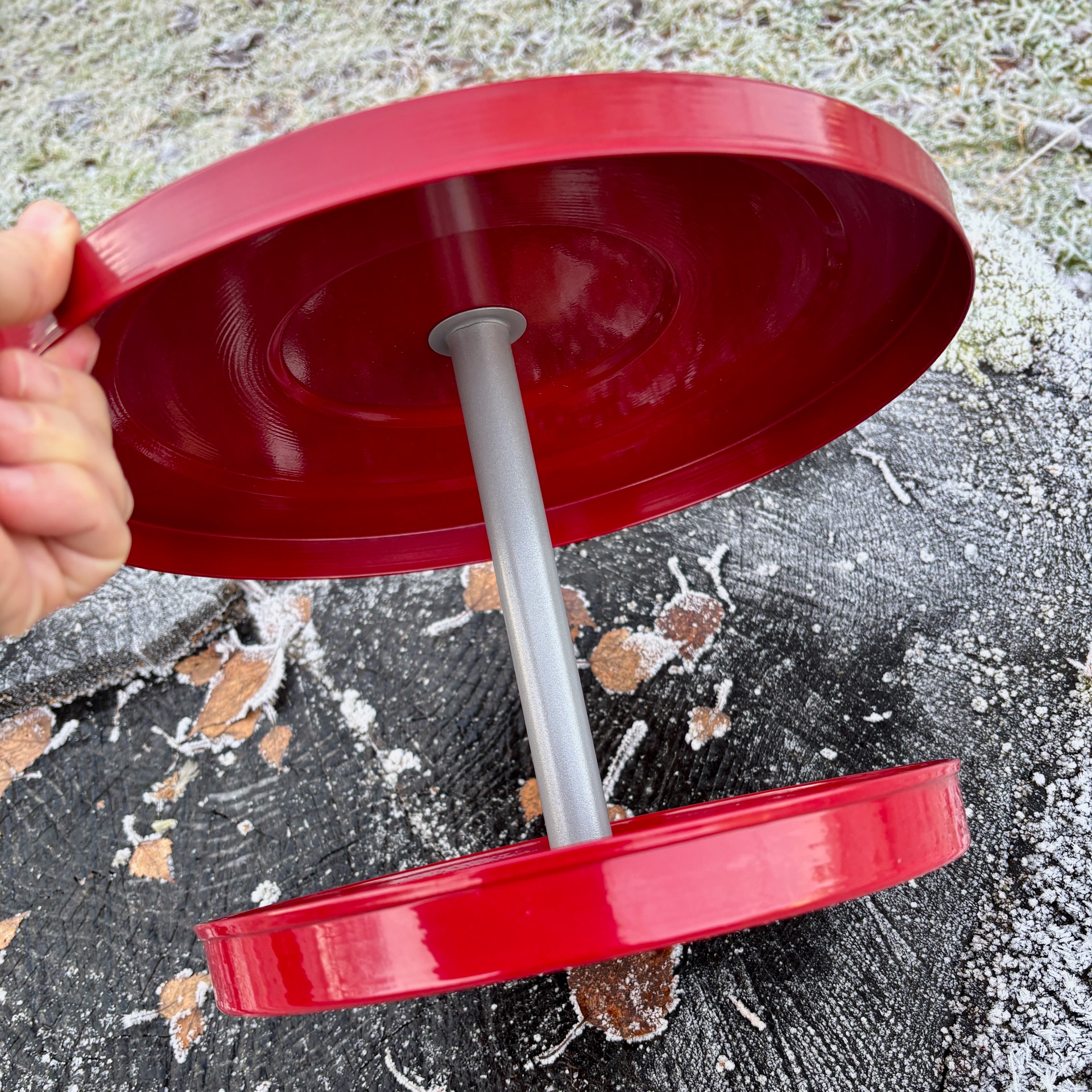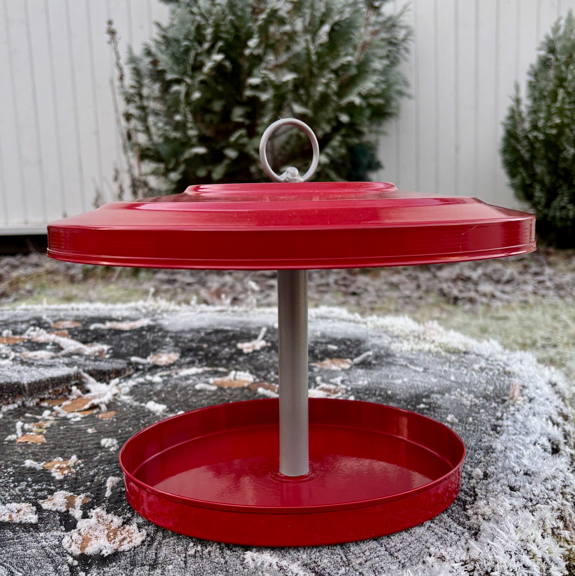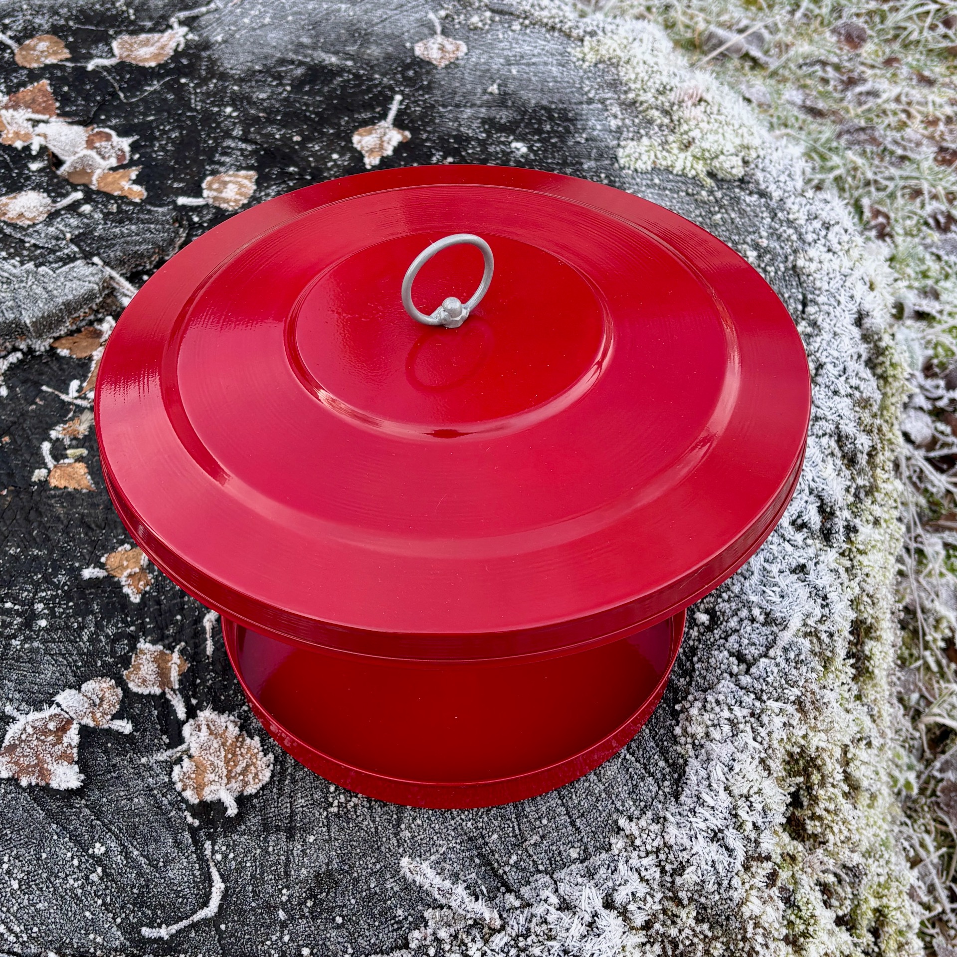 Fuglemateren i metall med stort, raust "tak" gjør at maten til de små ikke blir våt av regn (hvis regnet ikke kommer sidelengs da). Fargen er rød, diameter er hele 32 cm og høyde 25 cm. Krok til oppheng. Denne er sammenleggbar og blir levert i flat eske. Produsent er danske Lauvring.
