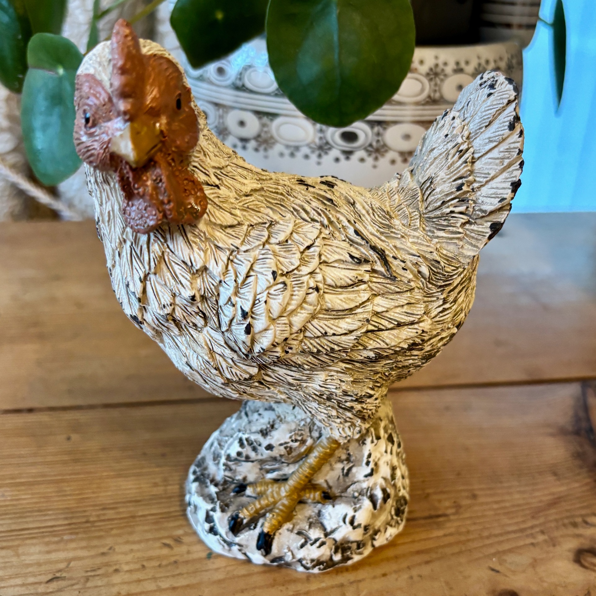 Rustikk høne-pøne i polyresin - litt spettet farge i sort og hvitt og resten er som høner skal være :-)