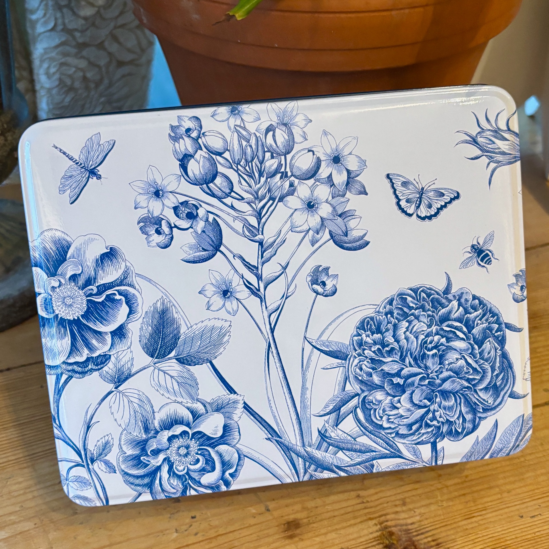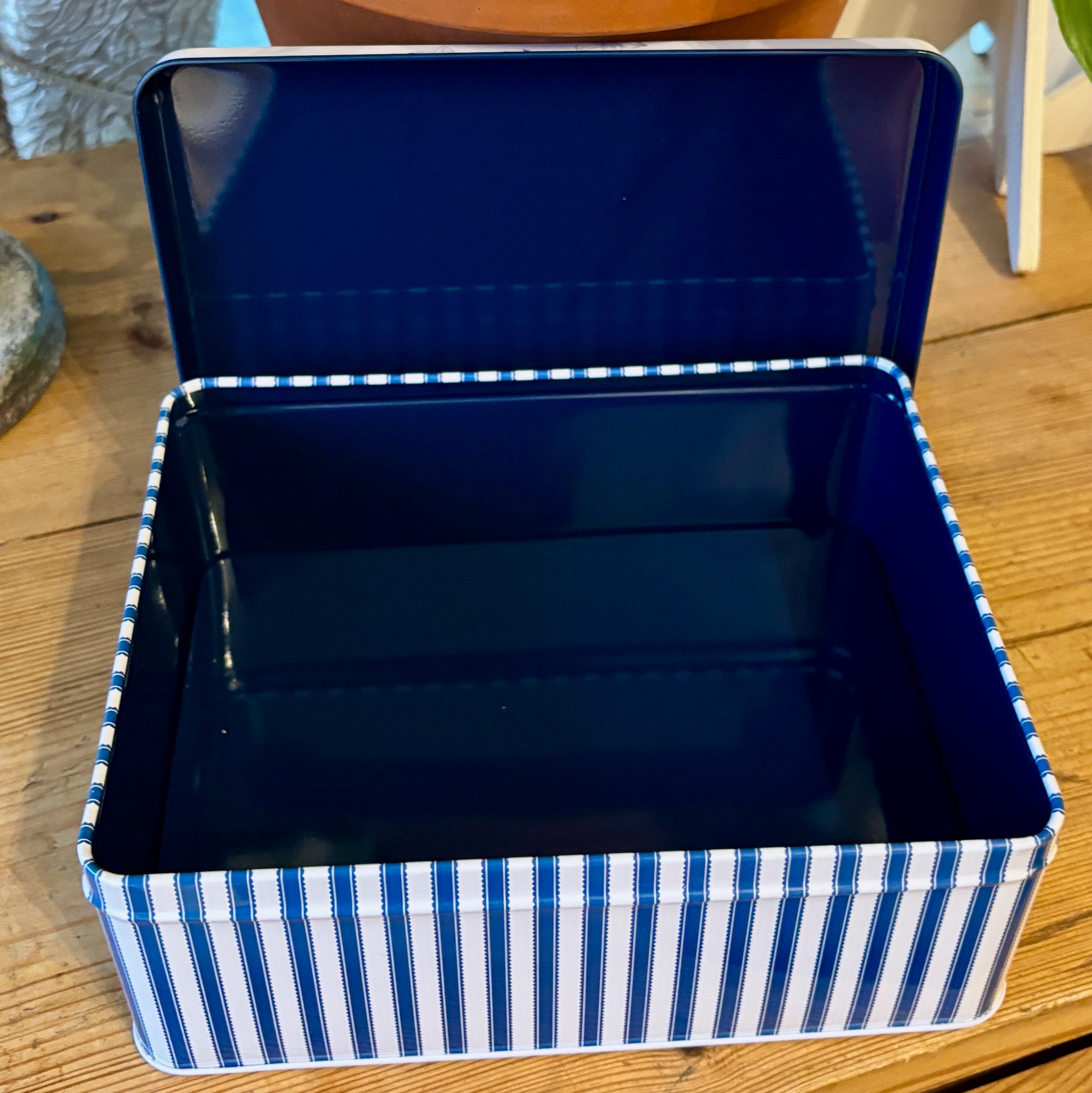 Denne vakre boksen med striper på utsiden av boksen og blomster på lokket og helblå innside. Laget i metall selvsagt og lokket sitter godt.