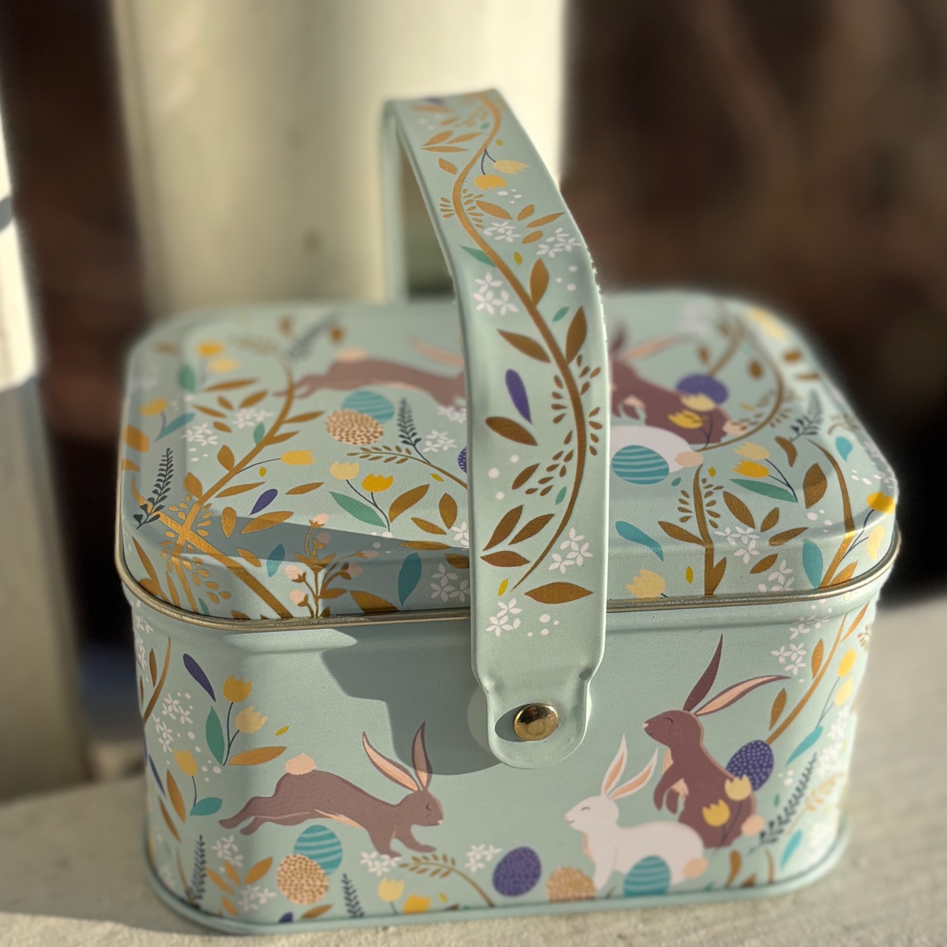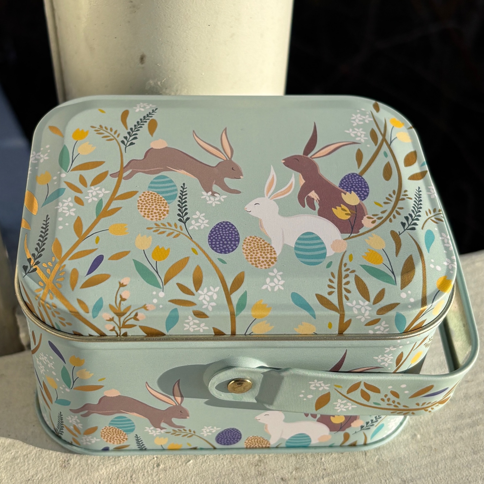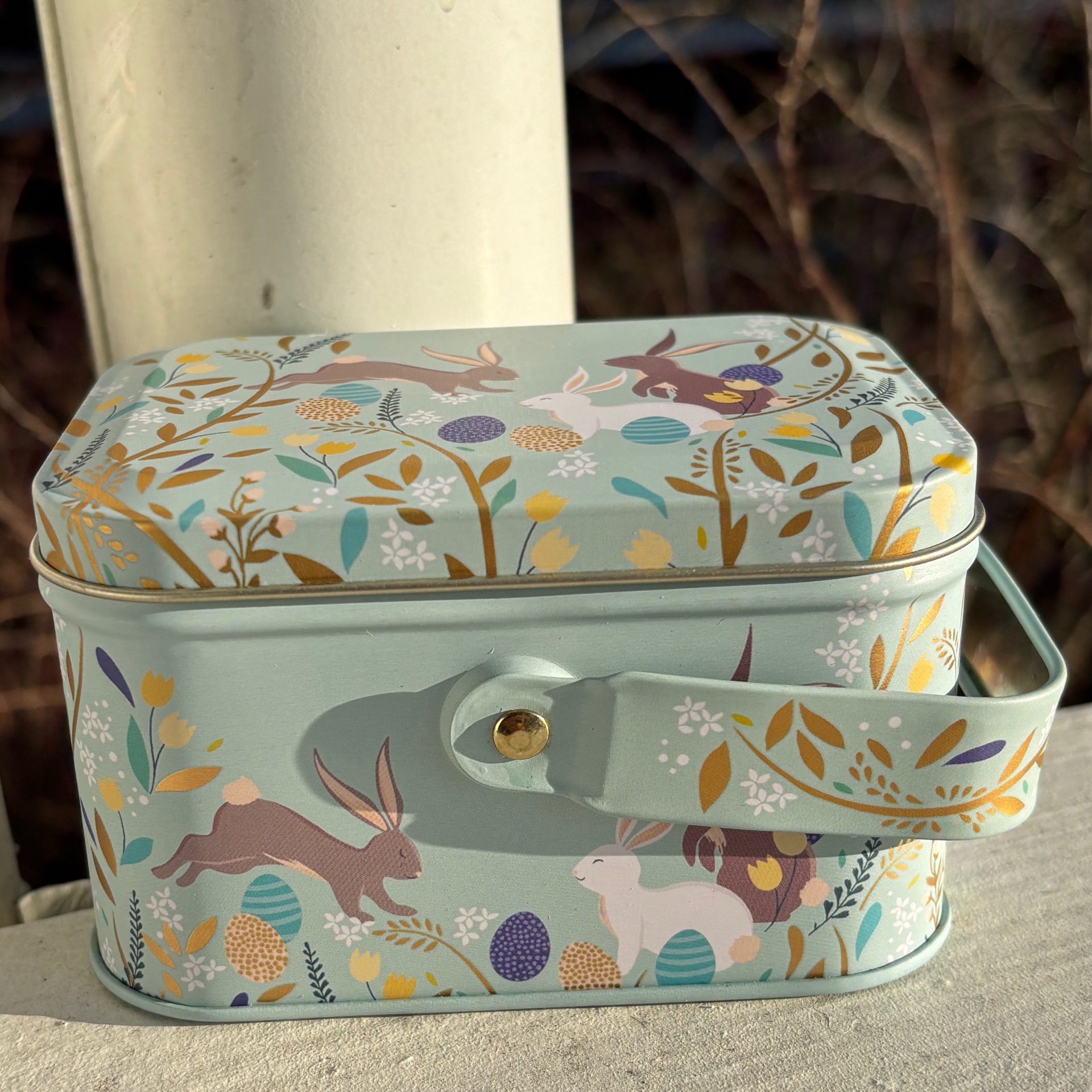 Motivet er smp harepuser som spretter rundt omkring. Grunnfargen er mint og det er innslag av gullfarge i motivet. Størrelse: høyde 6 cm (da er ikke håndtaket regnet med) og bunn er 10,5x8 cm. Produsent er Elitetins, UK.