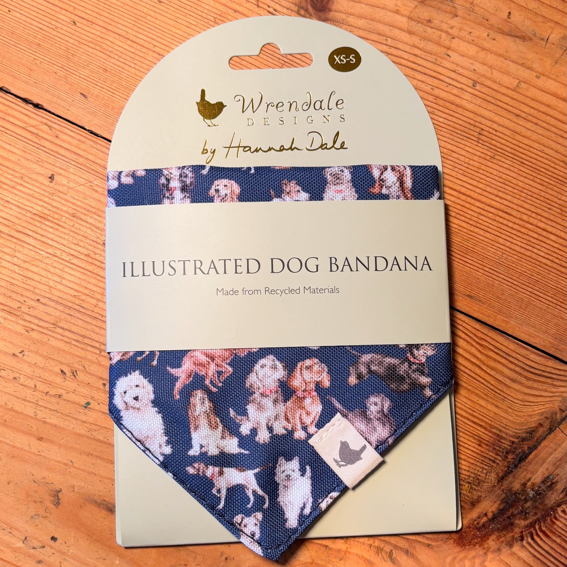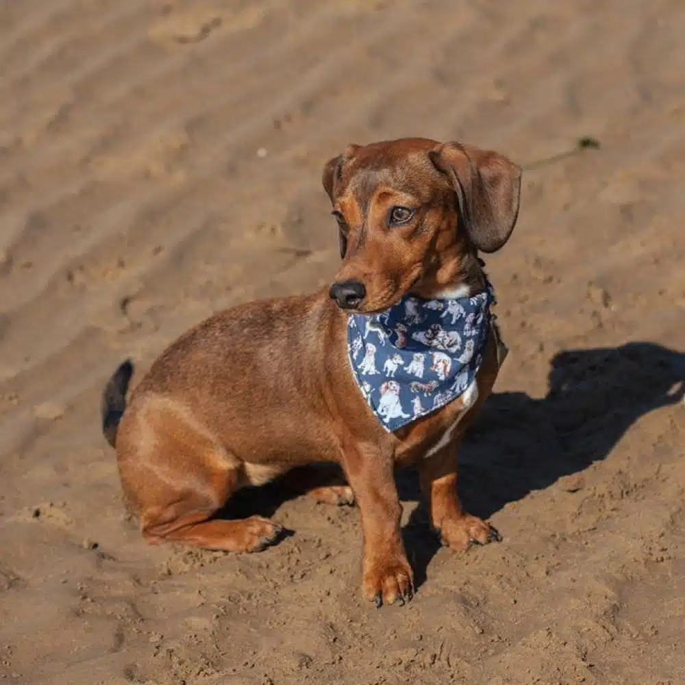 Str er 20x12 cm, laget i resirkulert 100% polyester. Bunnfargen er mørk blå med flere ulike hunder som motiv. Festes enkelt på halsbåndet.