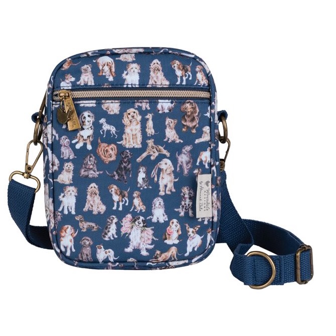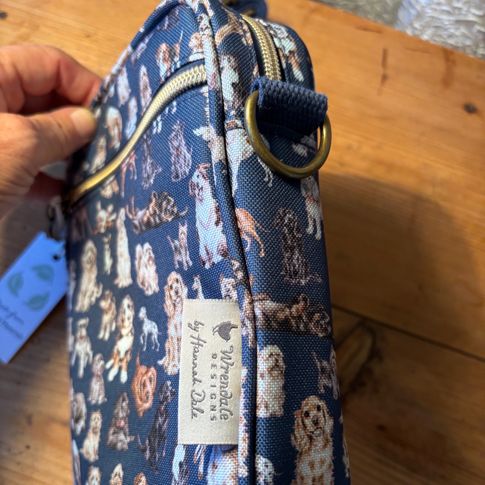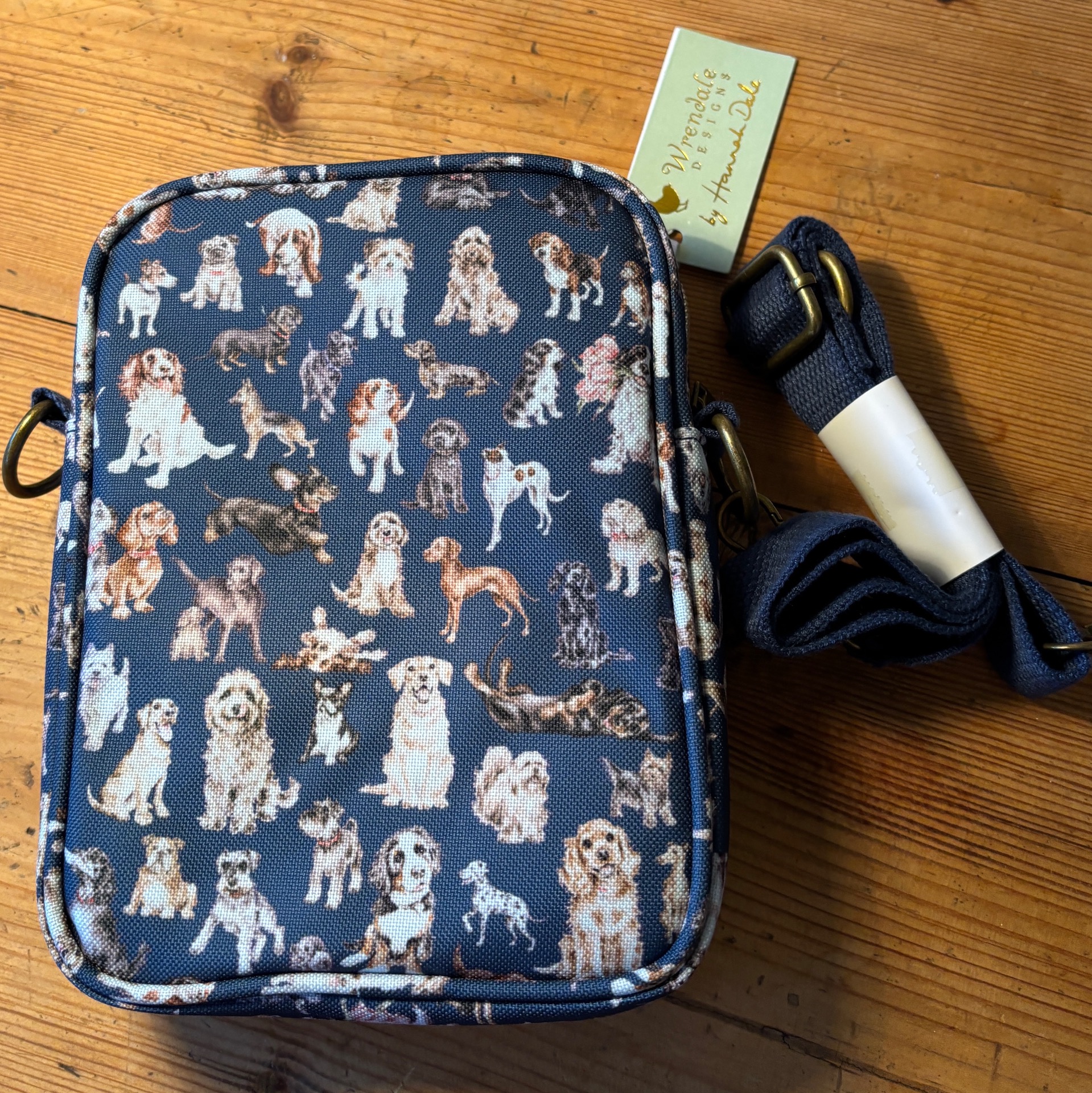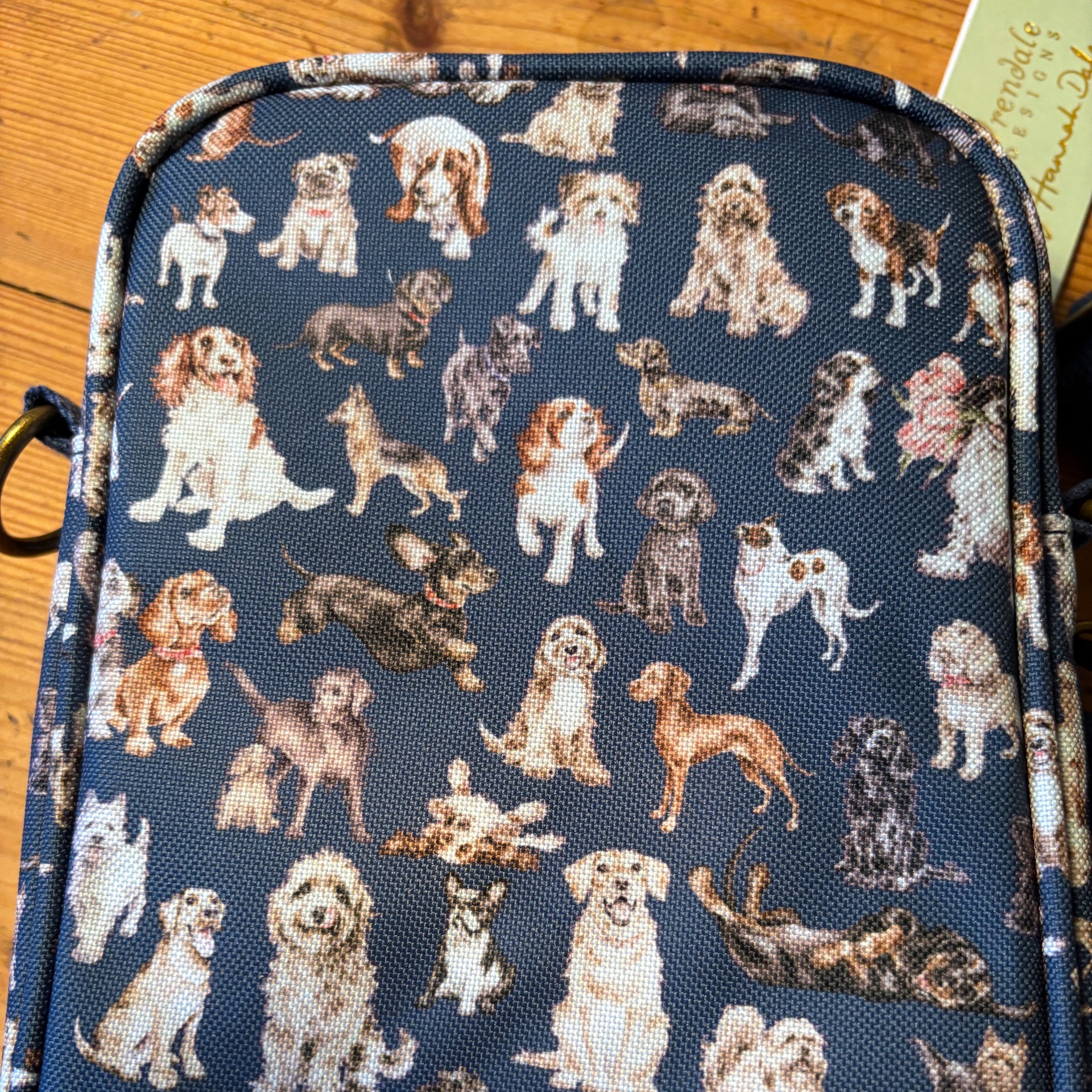 Bakgrunnsfargen er mørk blå med ulike hunder som motiv. Innvendig er det glatt, mørkeblått stoff.