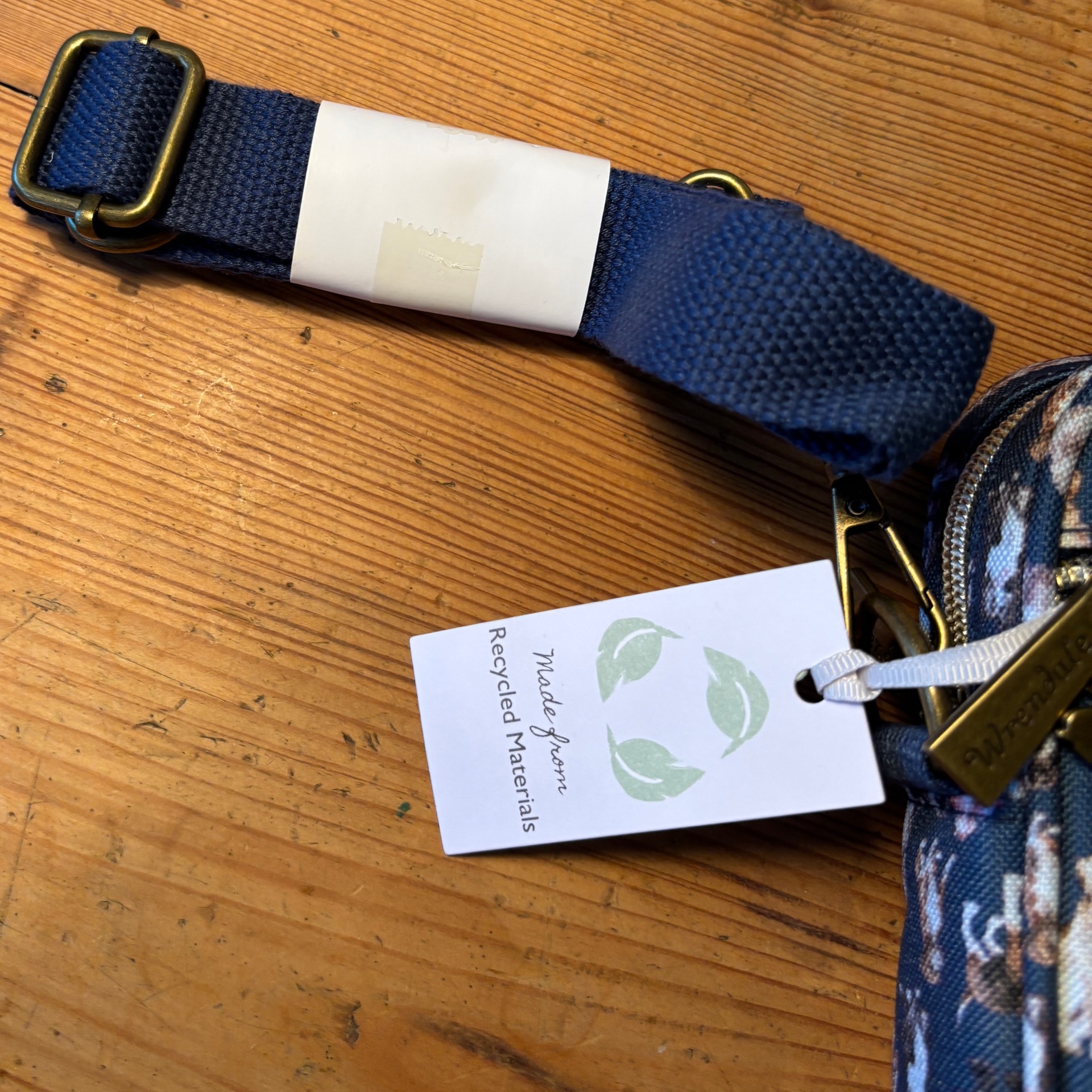 Den er produsert av engelske Wrendals Designs, som har kvalitetsvarer. Vesken er laget i 100% resirkulert polyester, det er en ekstra lomme i front med glidelåslukking, skulderstroppen er bred og god og selvsagt justerbar.