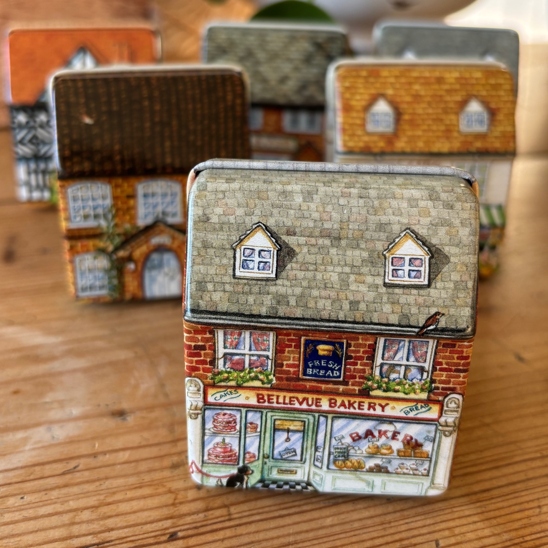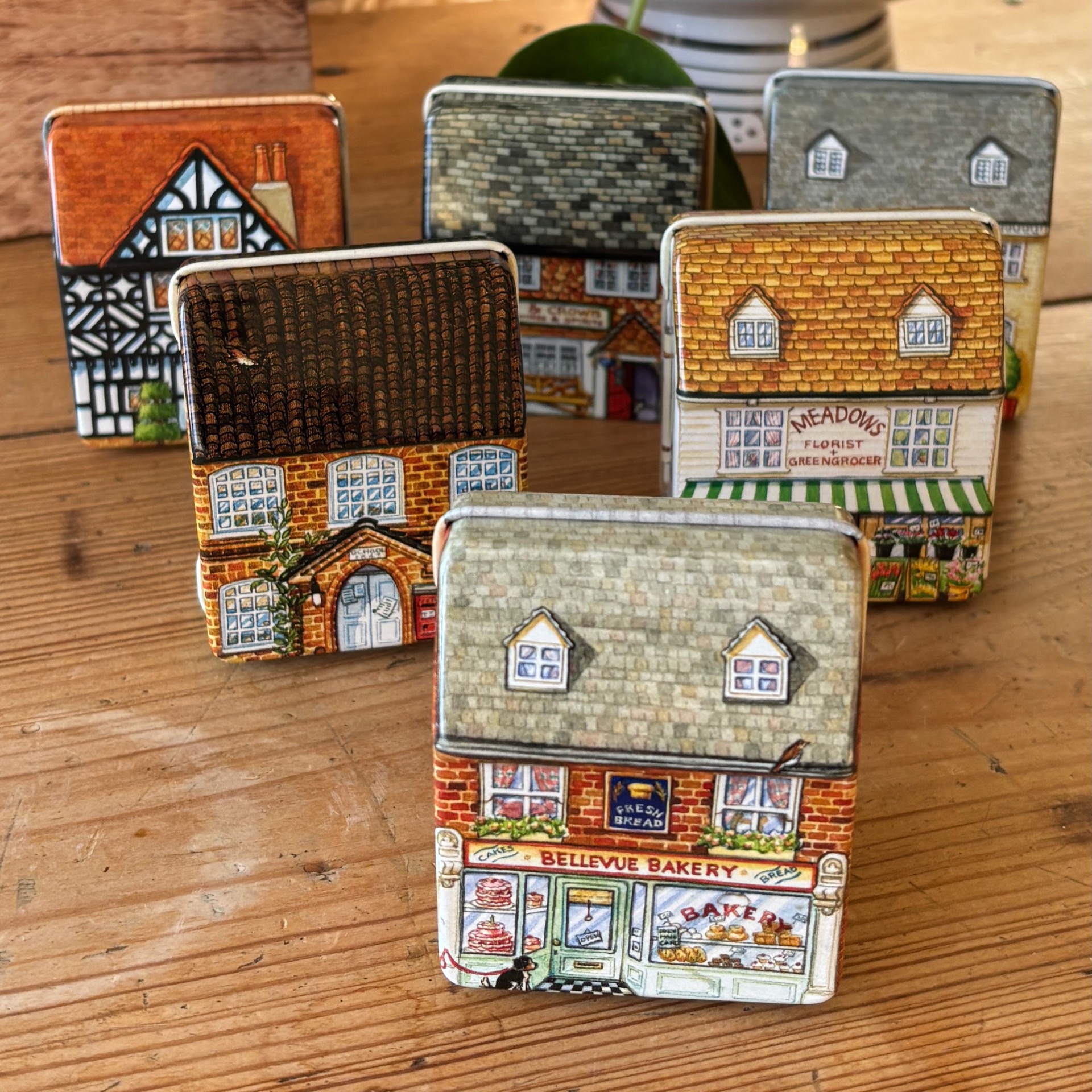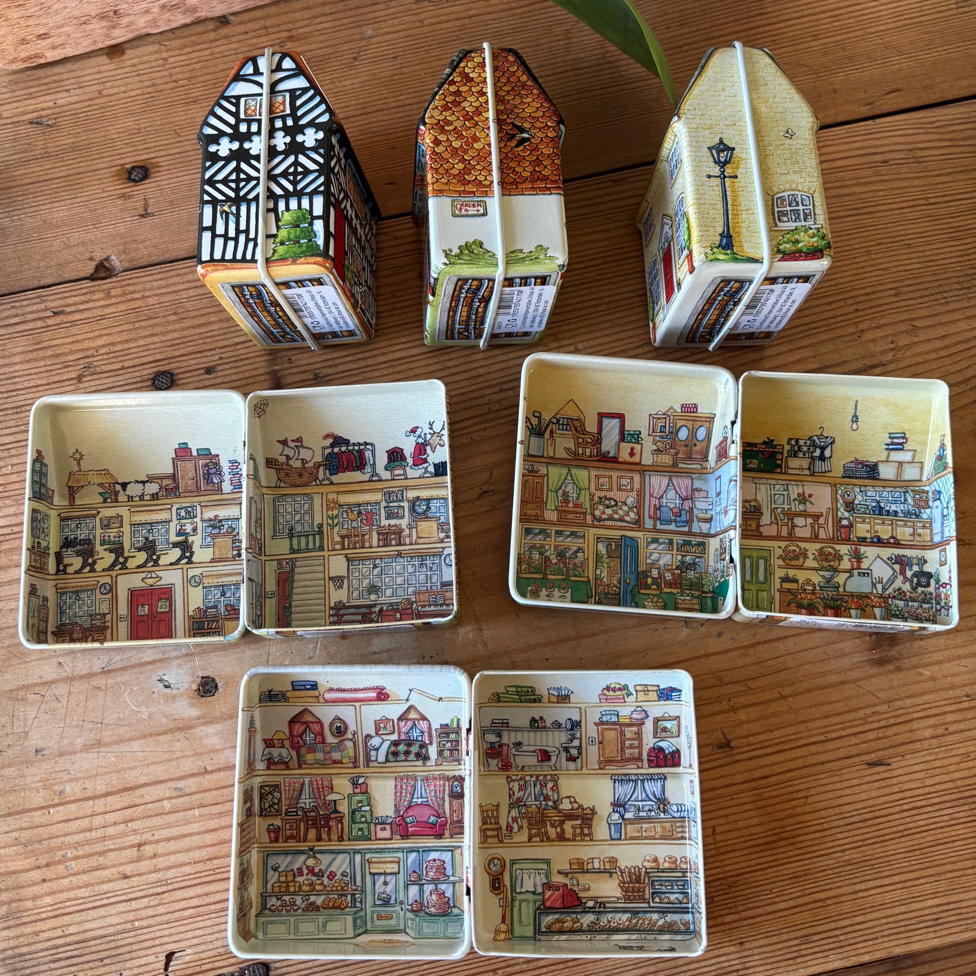 Skjønne små bokser (hengslet i ene kortsiden) formet som små hus med spisse tak. Se bildene - de er jo like fine på innsiden som på utsiden!
