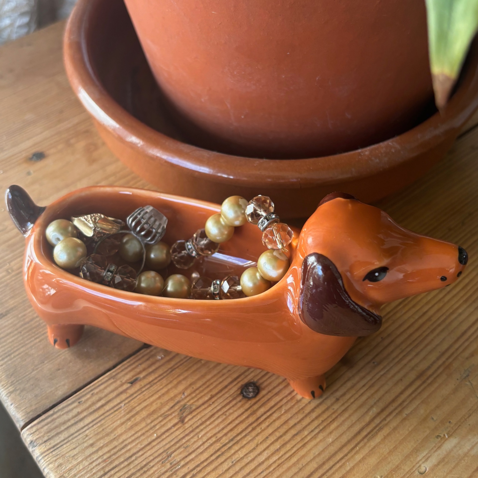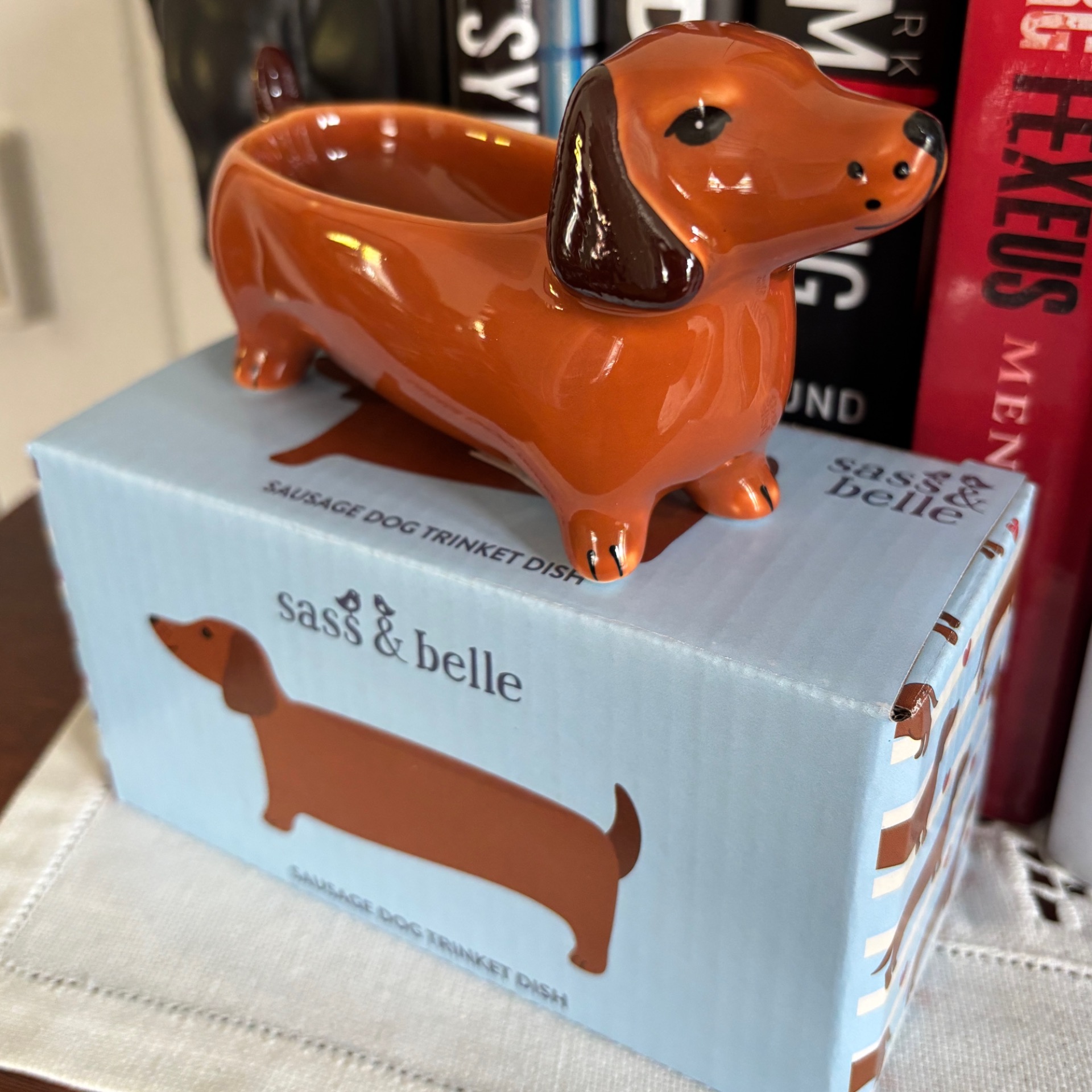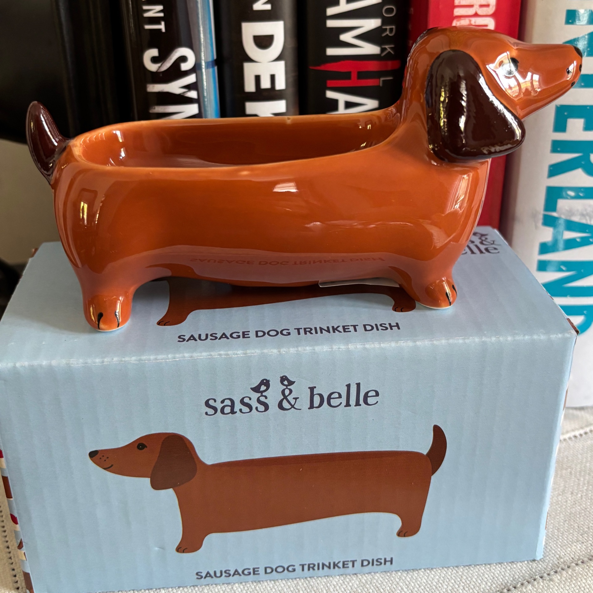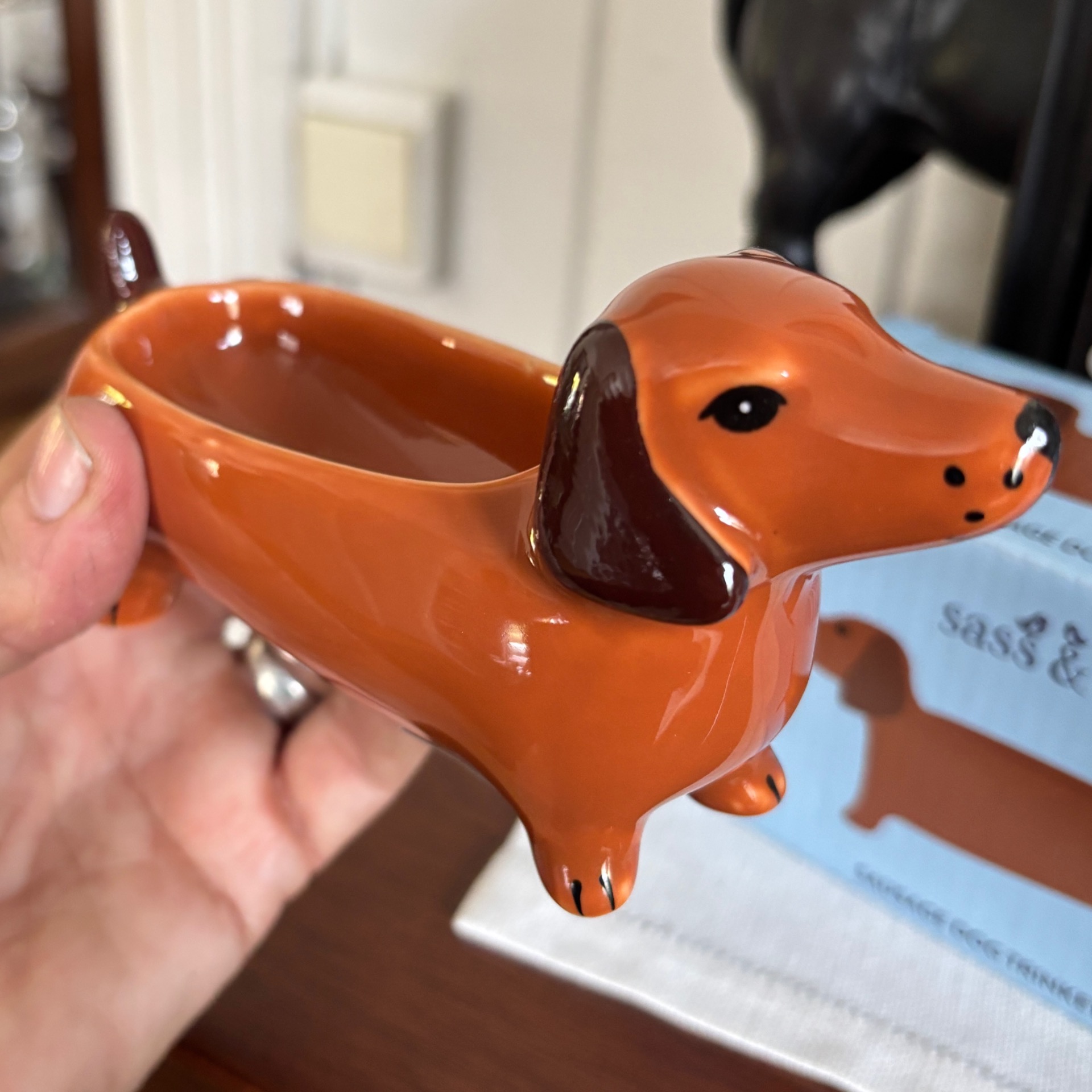 Morsom liten skål formet som dachs - ypperlig å ha på badet feks å legge fra seg smykker i. Laget i porselen. Lengde er 15 cm, høyde 8 cm og bredde 5 cm.