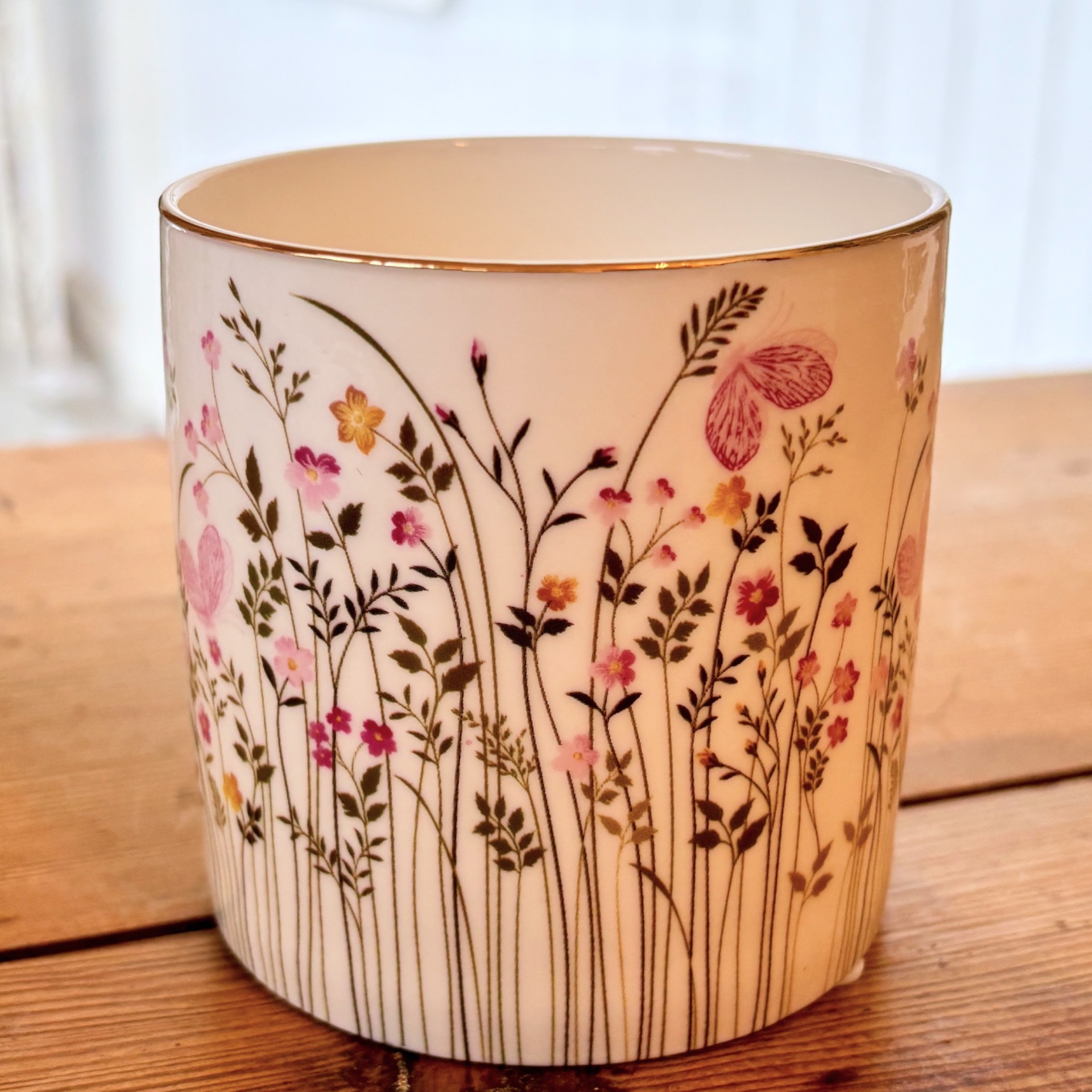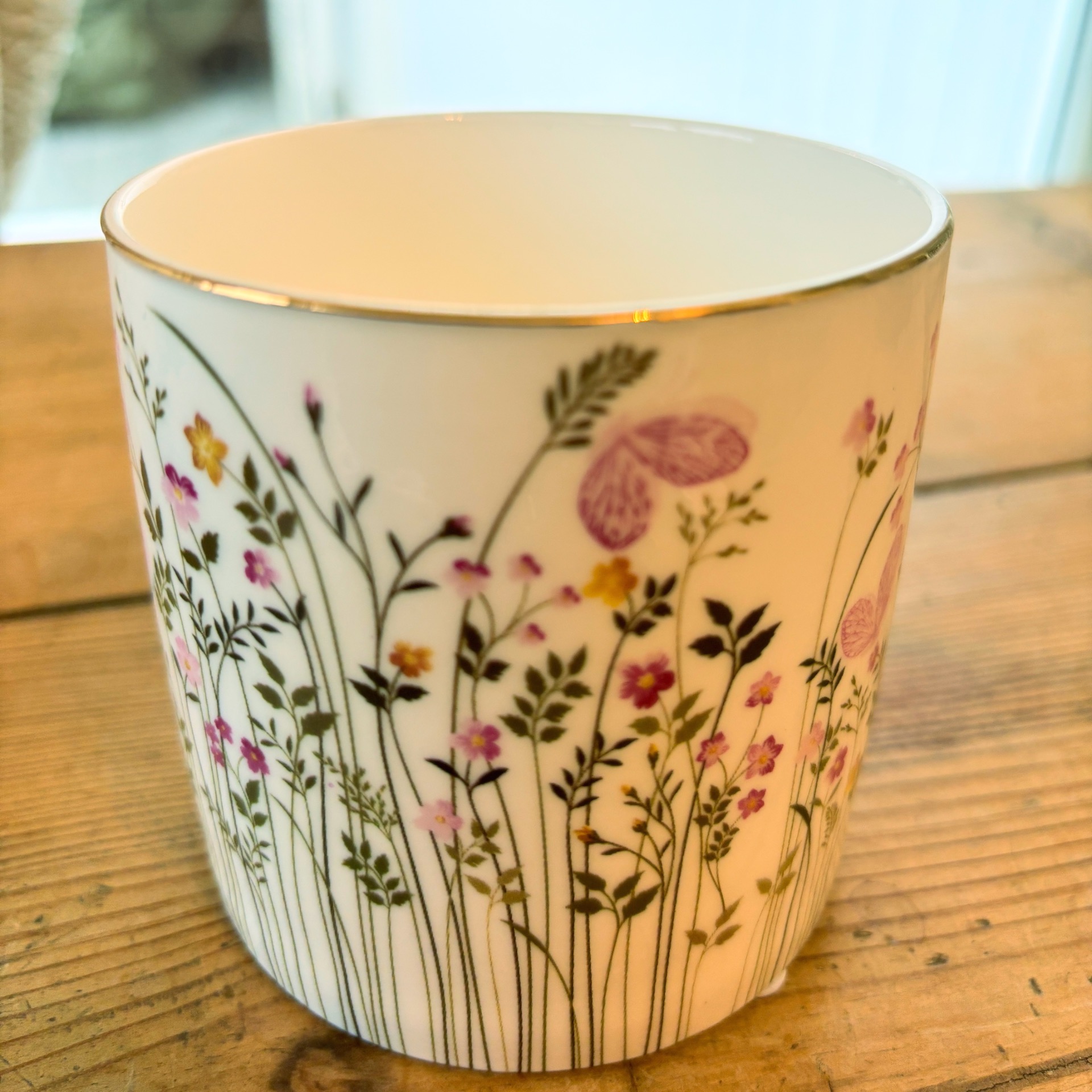 Vakreste, lille potten i hvit porselen med gullkant oppe og vakkert, sommerlig motiv rundt det hele. Sommerfuglen er også med :-) Potten er 9 cm høy og diameter er 8,5 cm. Produsent er Edelweiss.