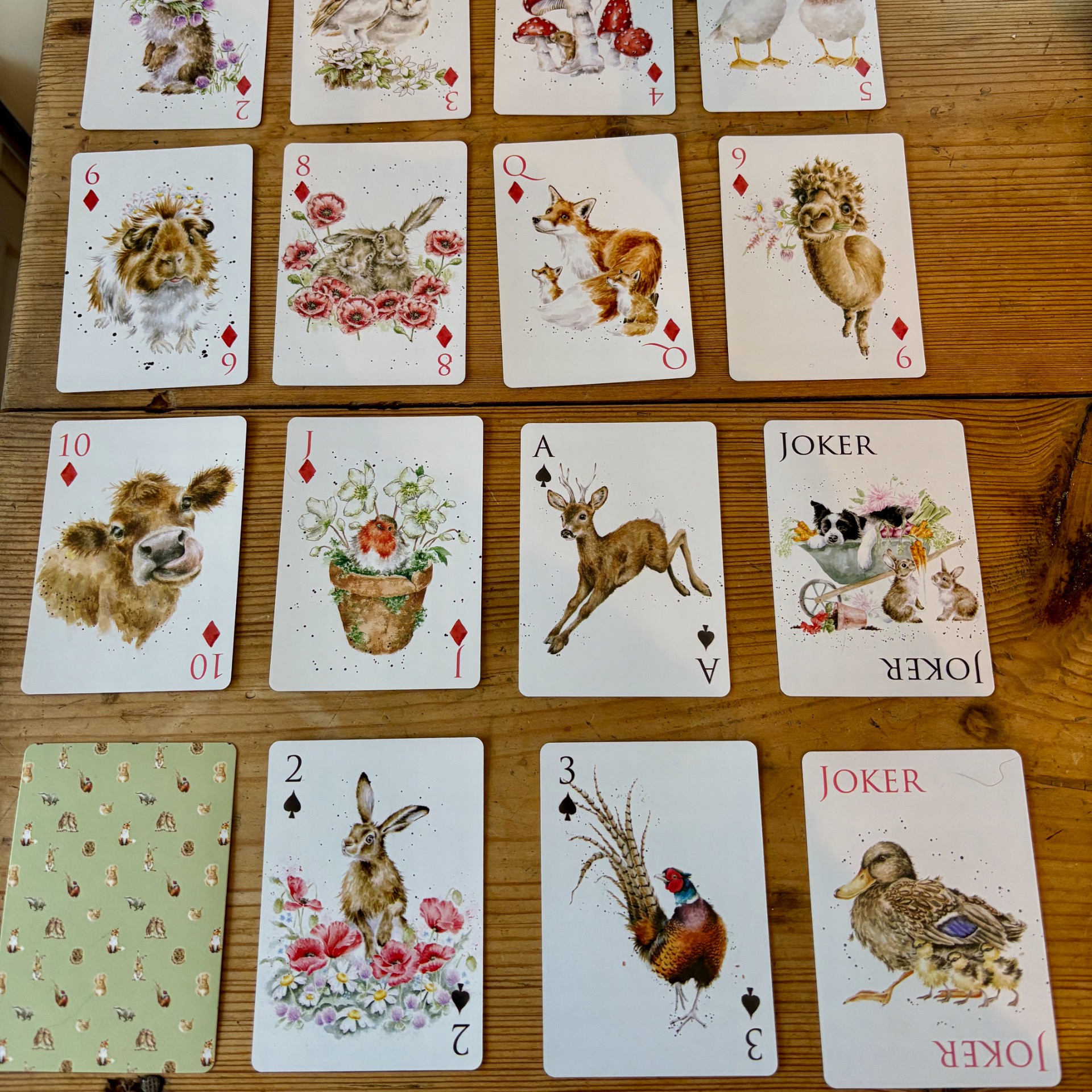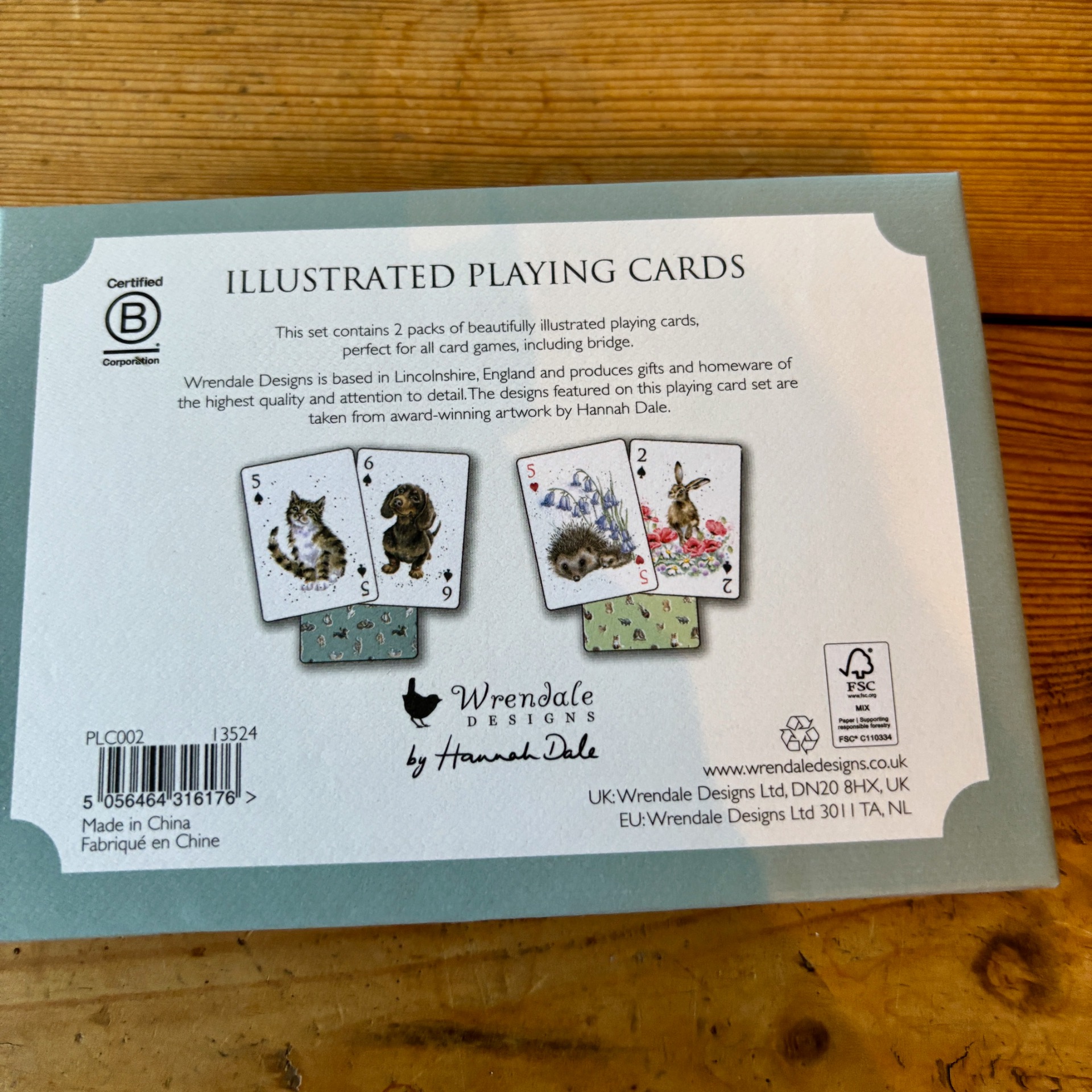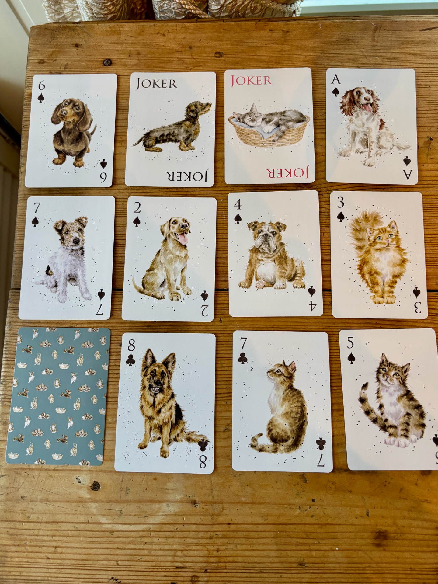 Wrendale Designs har produsert dette herlige settet med to bokser med standard spill-kort - plassert i en papp gave-eske. På spillkortene med blå bakside - er det en mengde ulike tegninger med katter og hunder. Blant annet dachs - som er på boksen.