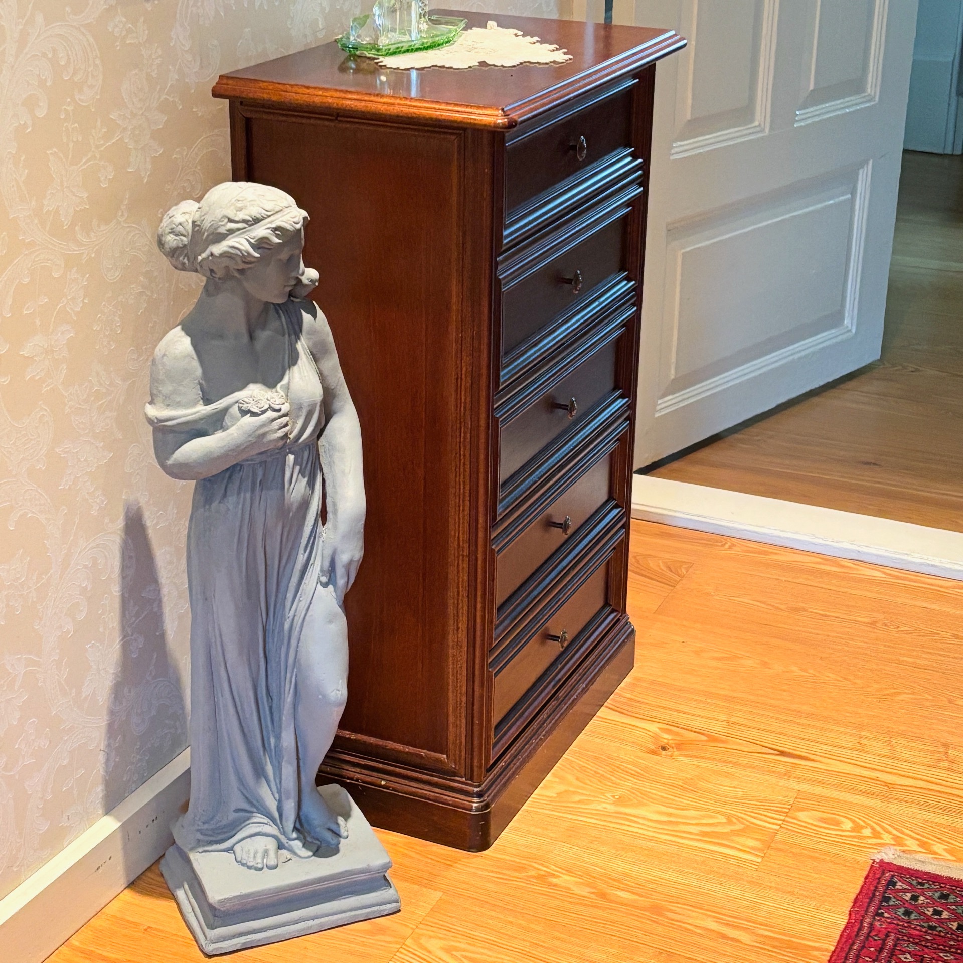 Nostalgisk - vakkker hage-statue, som har fått navnet Lady Grey av produsenten Lauvring. Dette er INGEN Temu-vare. :-) Hun kan utmerket godt stå inne som et skjønt interiør-element - se bilder! Planen er å svøpe henne inn i dekorlys. :-)