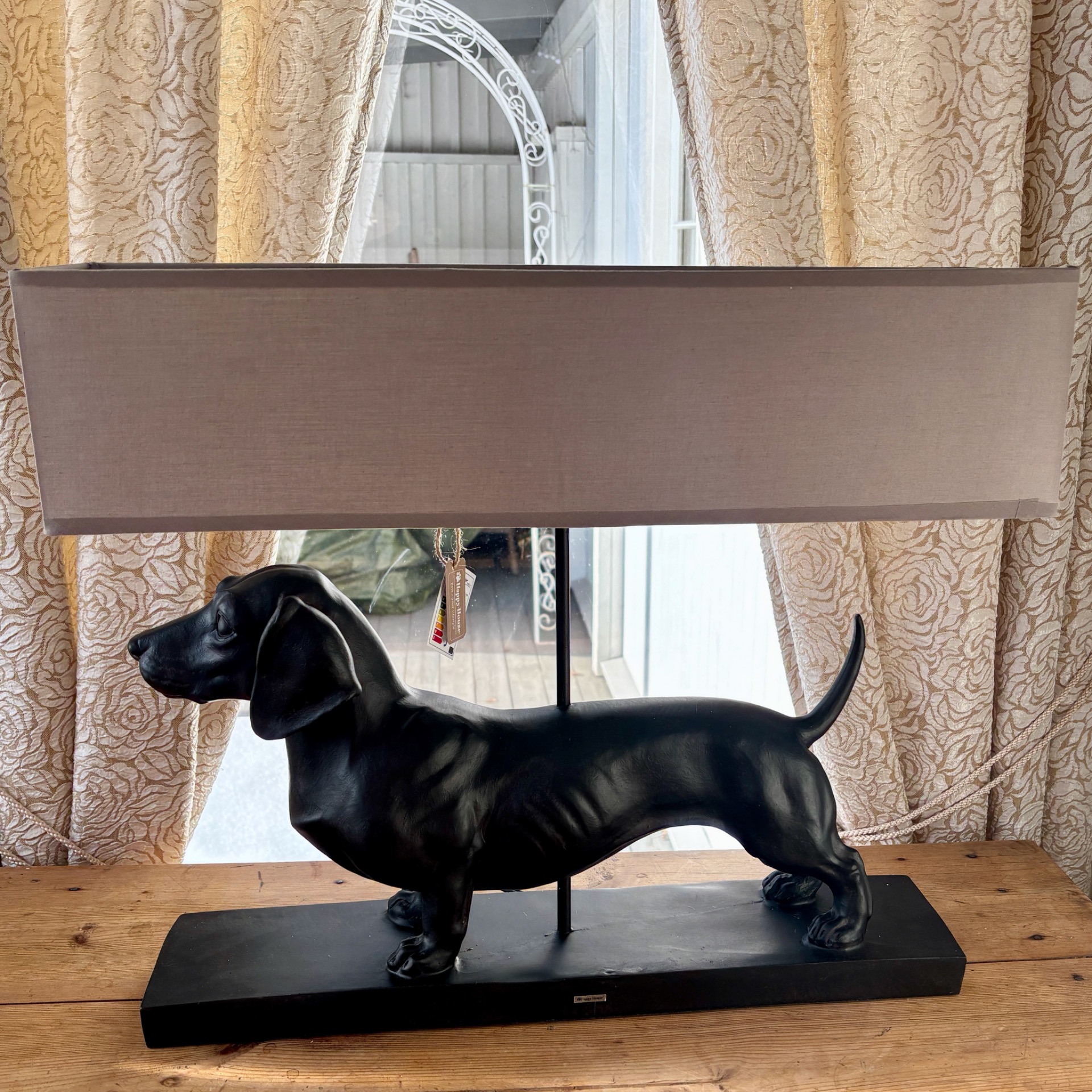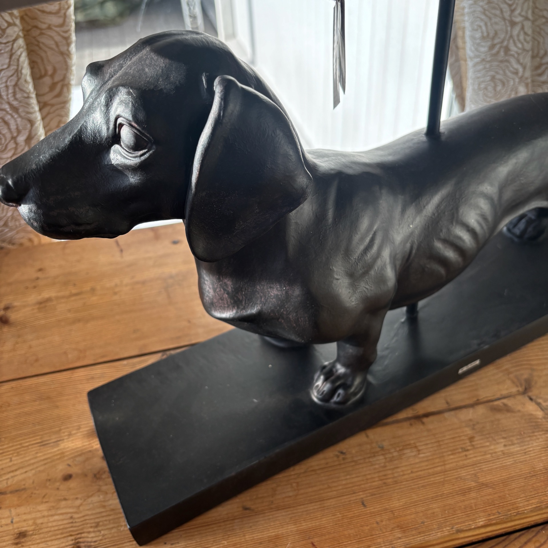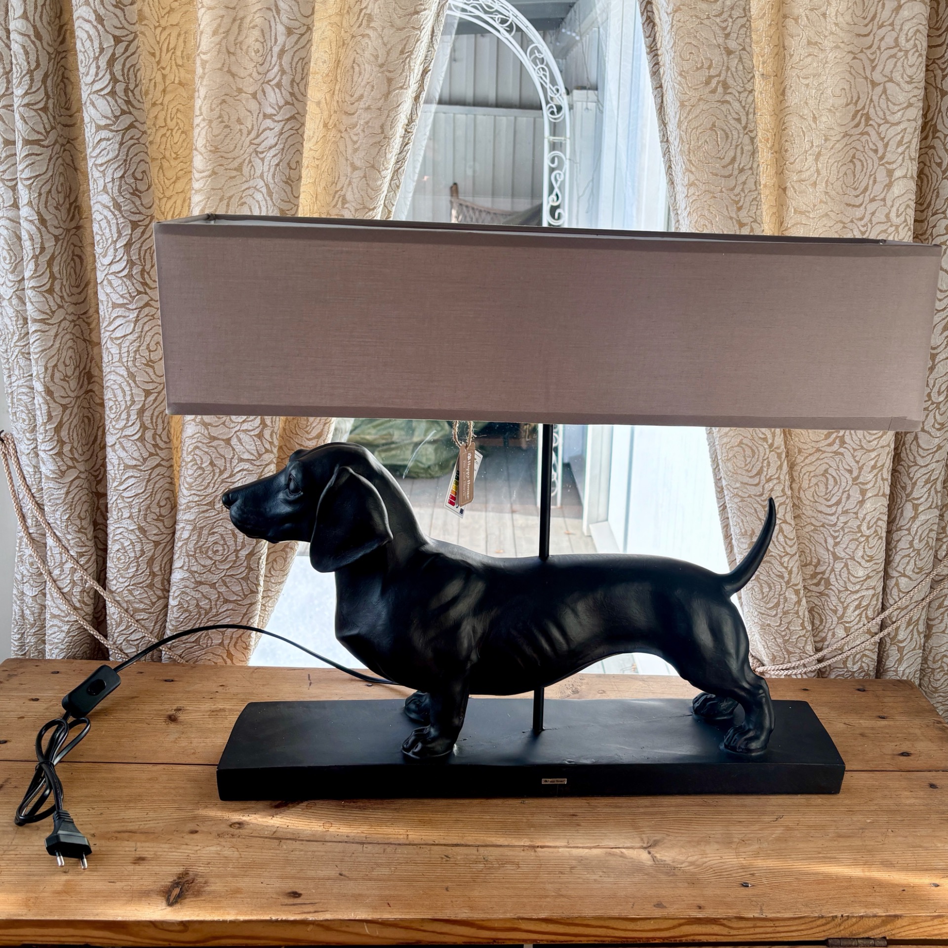 Virkelig staselig og flott bordlampe med helsort dachs, som står på en sort plate og med en rektangulær, grå skjerm. Lampen har sort ledning med standard støpsel og av/på-knapp. Dachsen og platen er i polyresin.