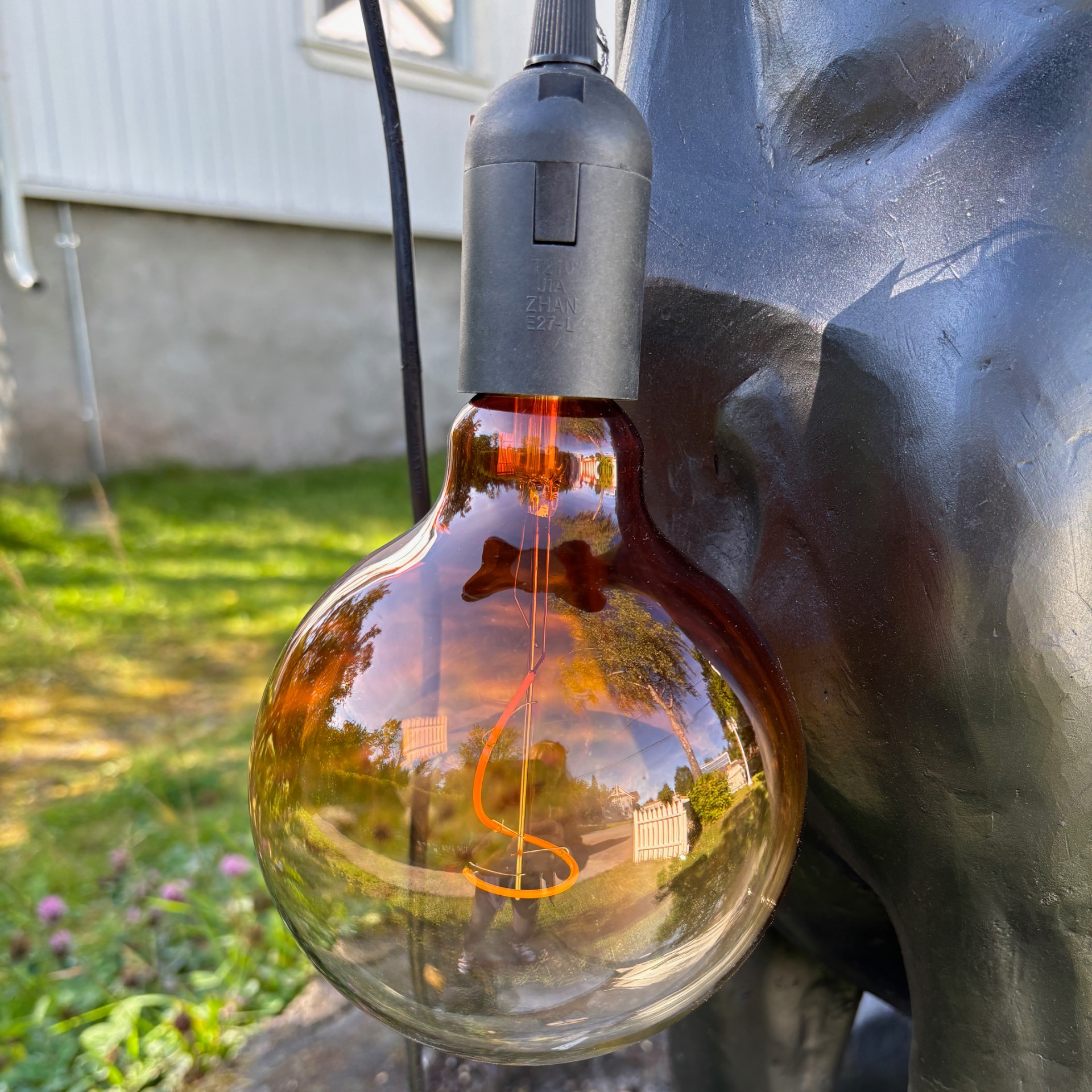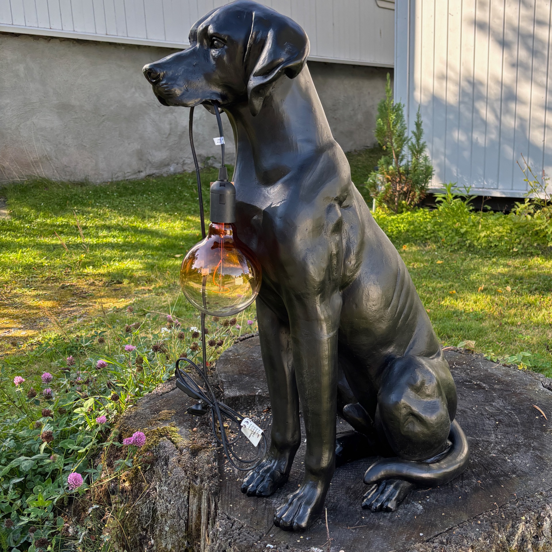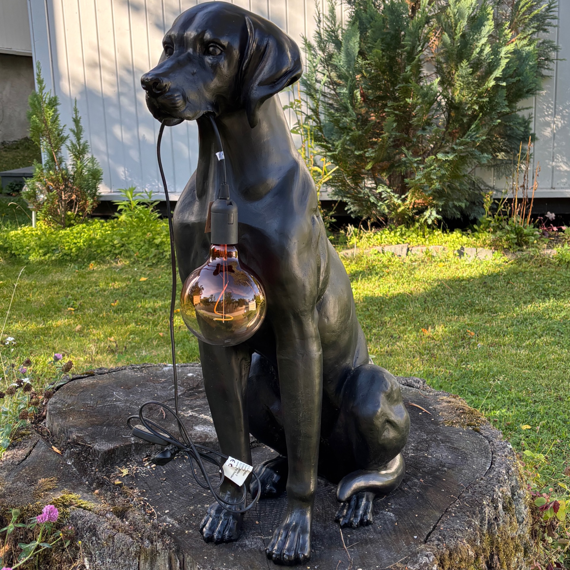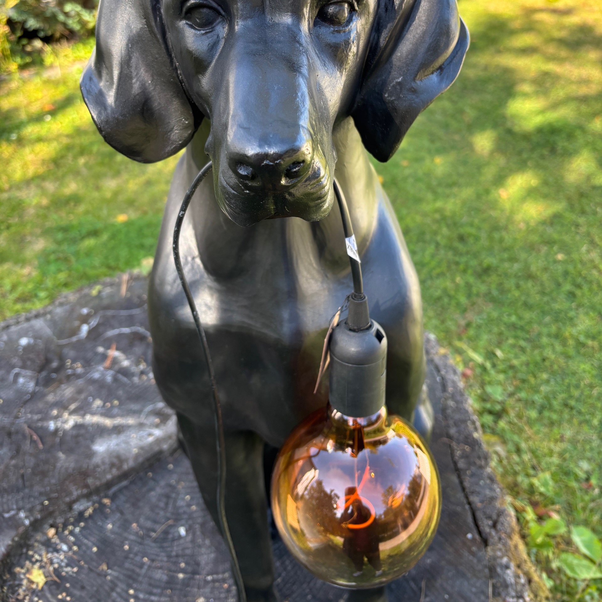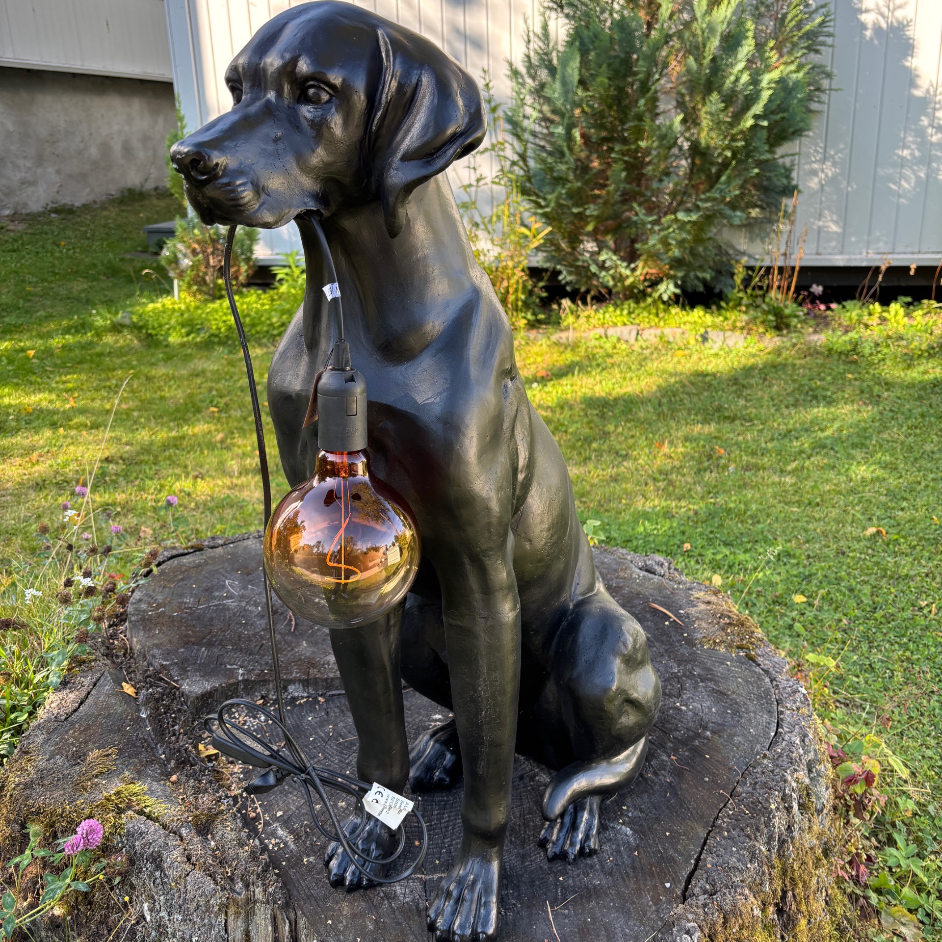 Herlig, stor lampe som viser en sittende hund med ledningen i munnen. Det er flott med en stor, lysebrun pære i holderen. Standard støpel og av/på-knapp. Det følger ikke med pære.