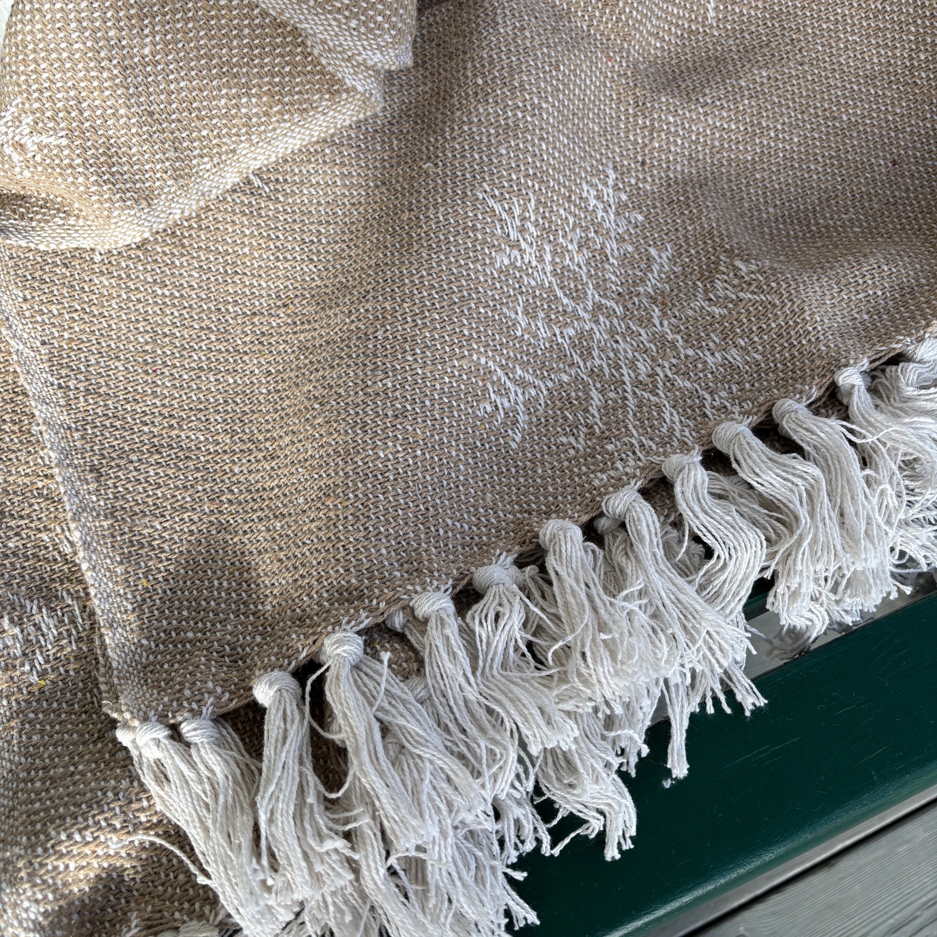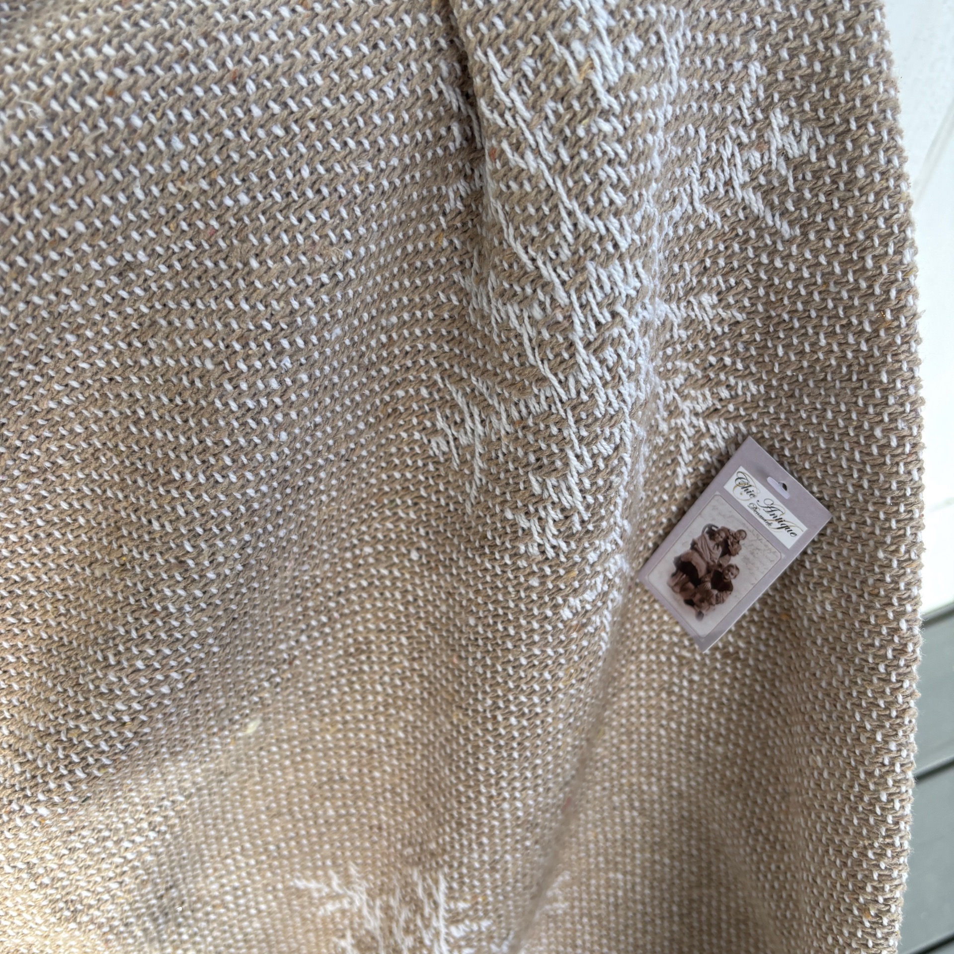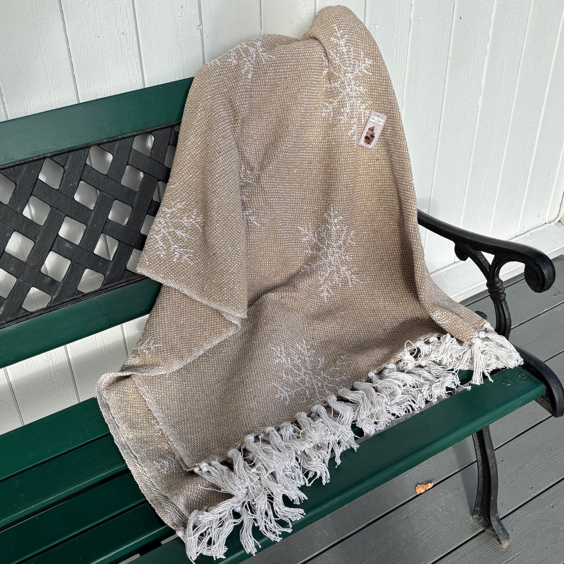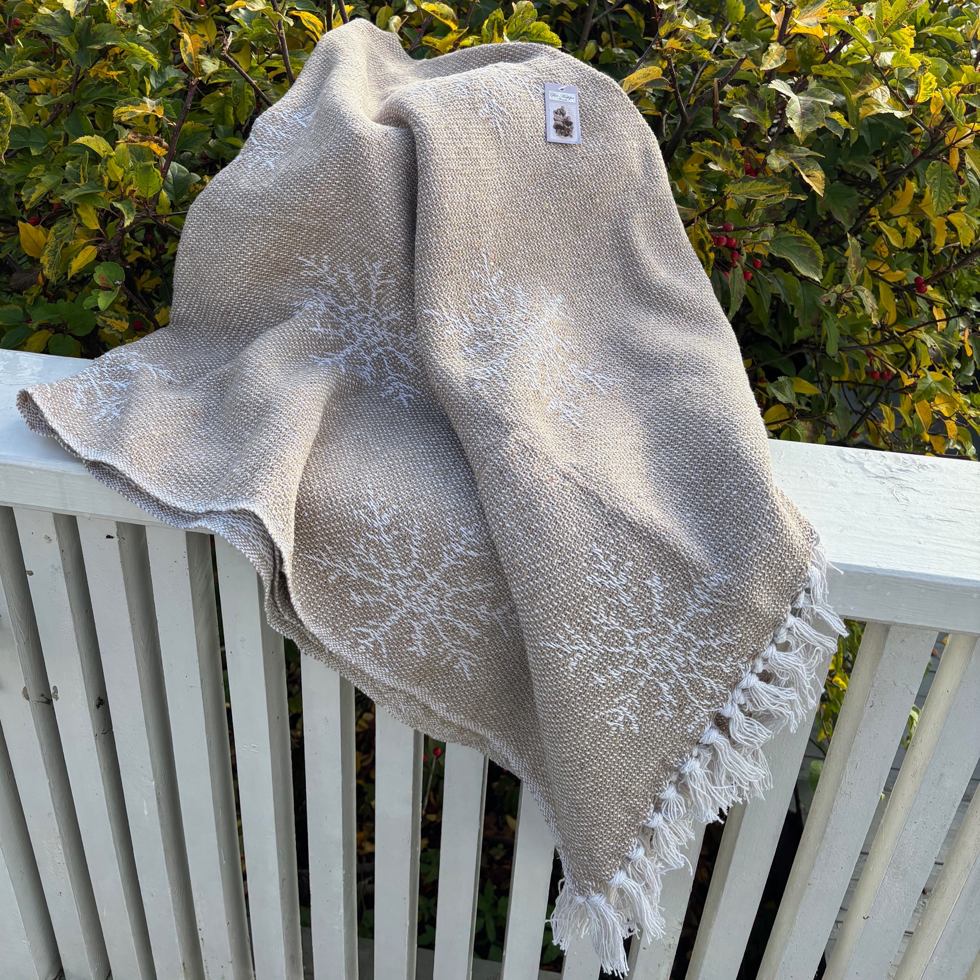 Deilig og mykt vevd teppe i lys, lys brun bunnfarge med beige iskrystaller som motiv. Frynser i hver ende.