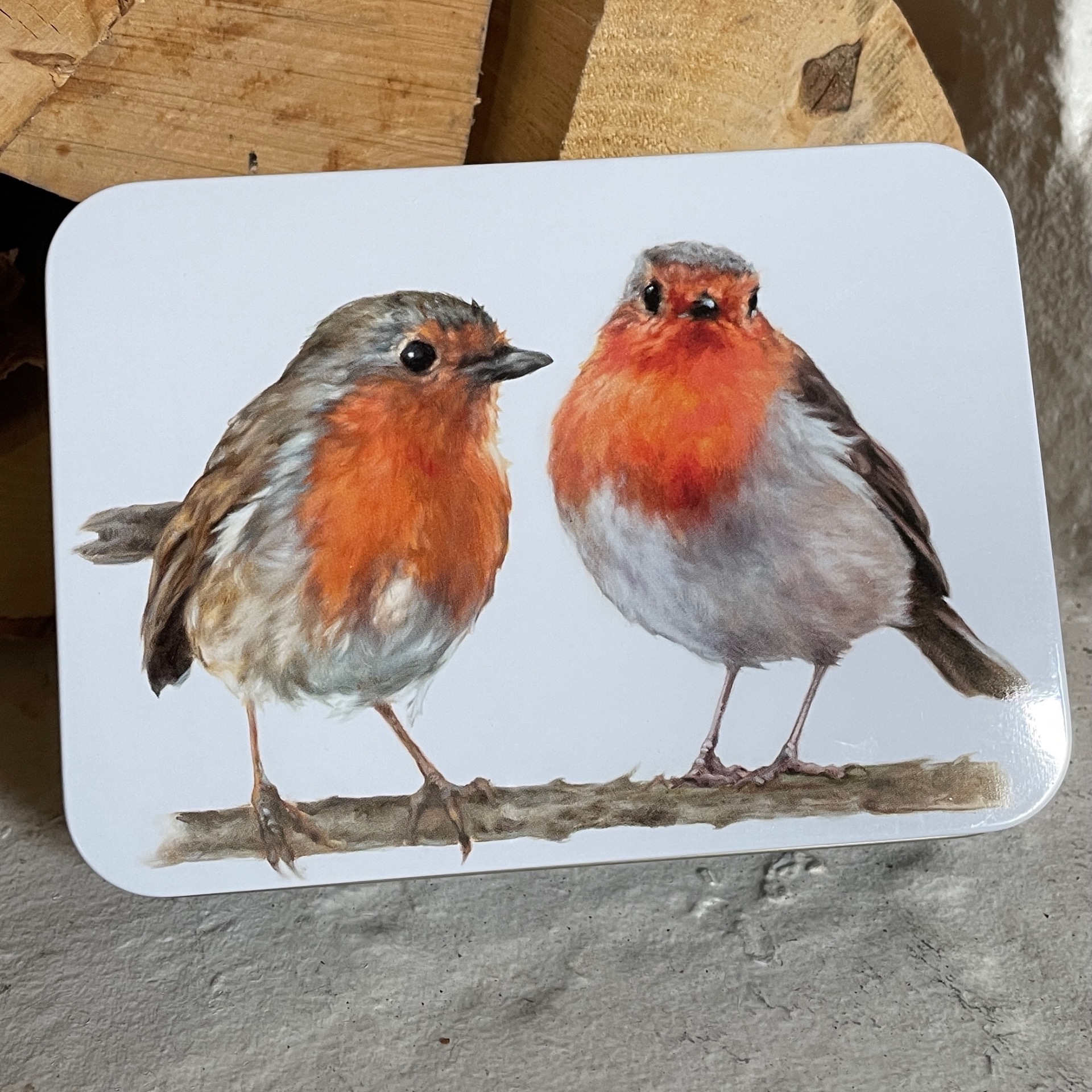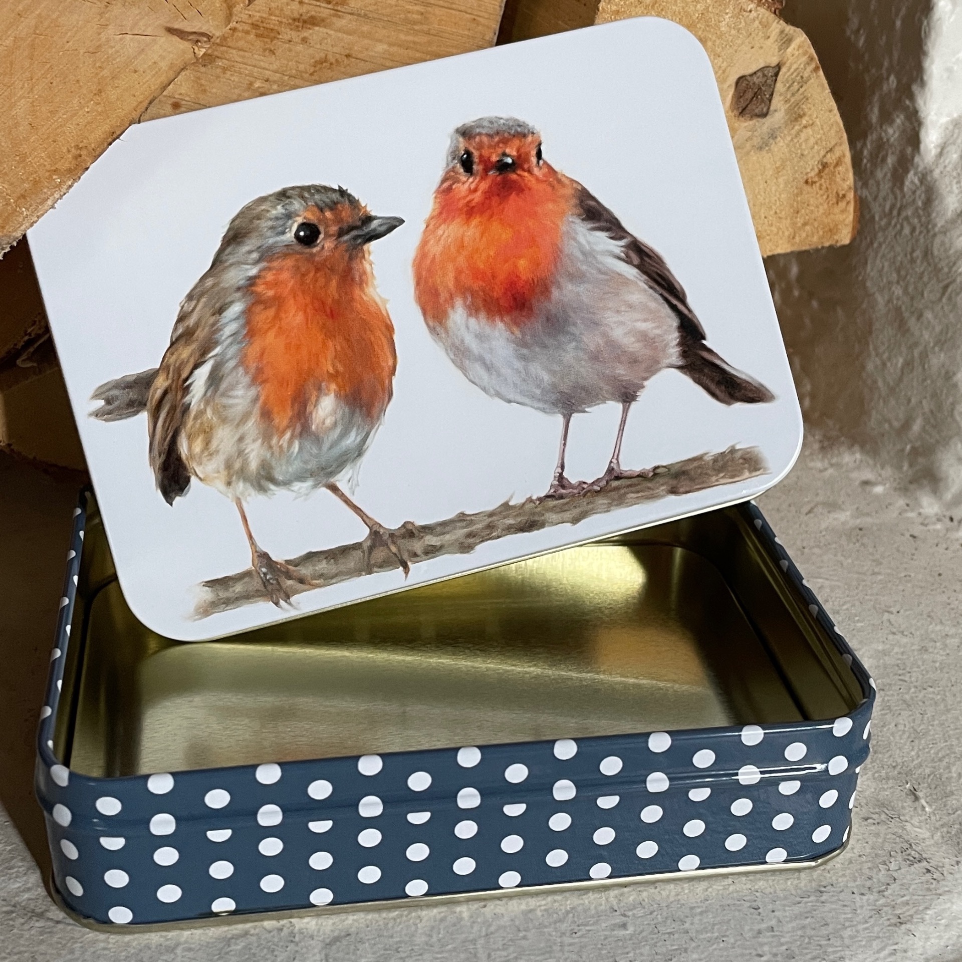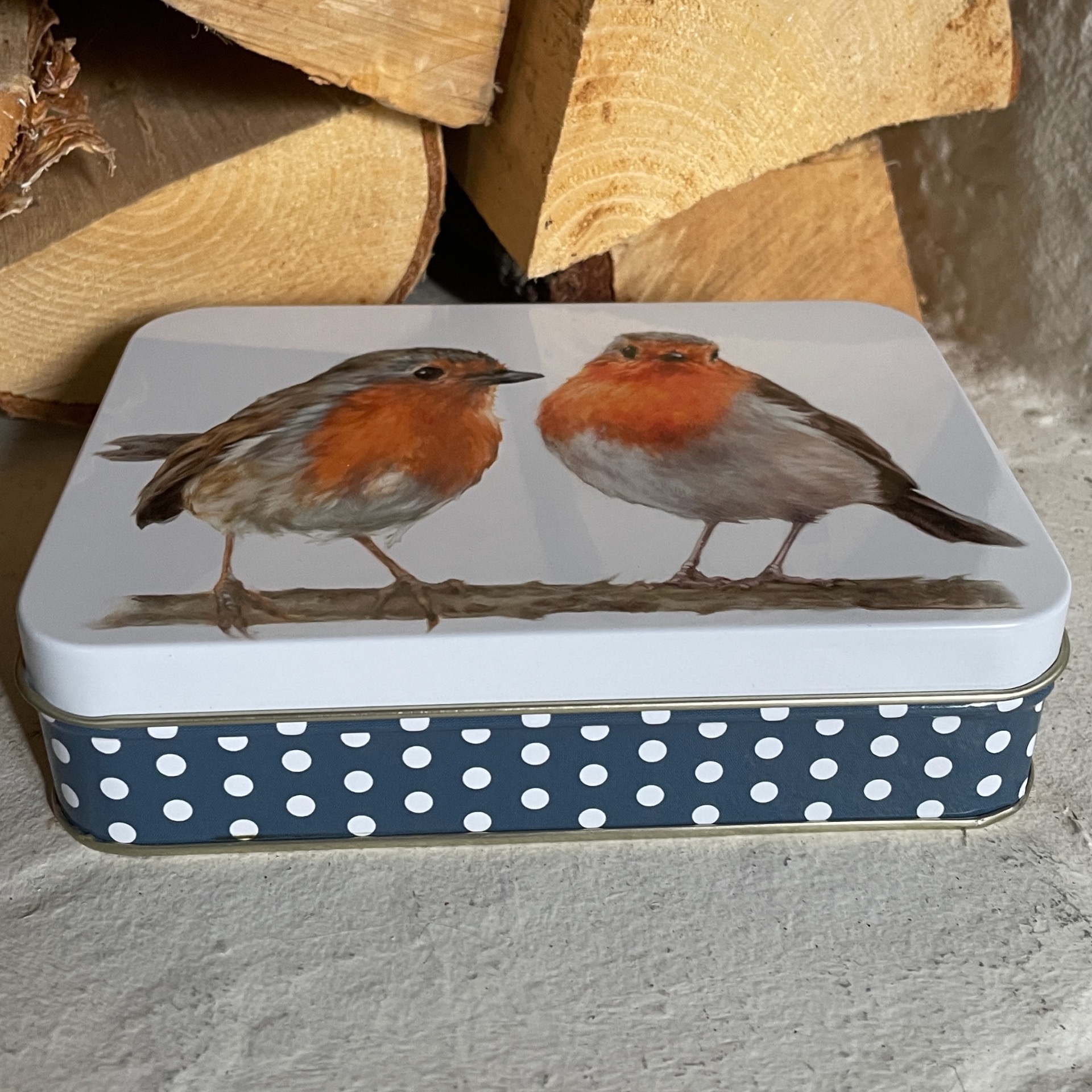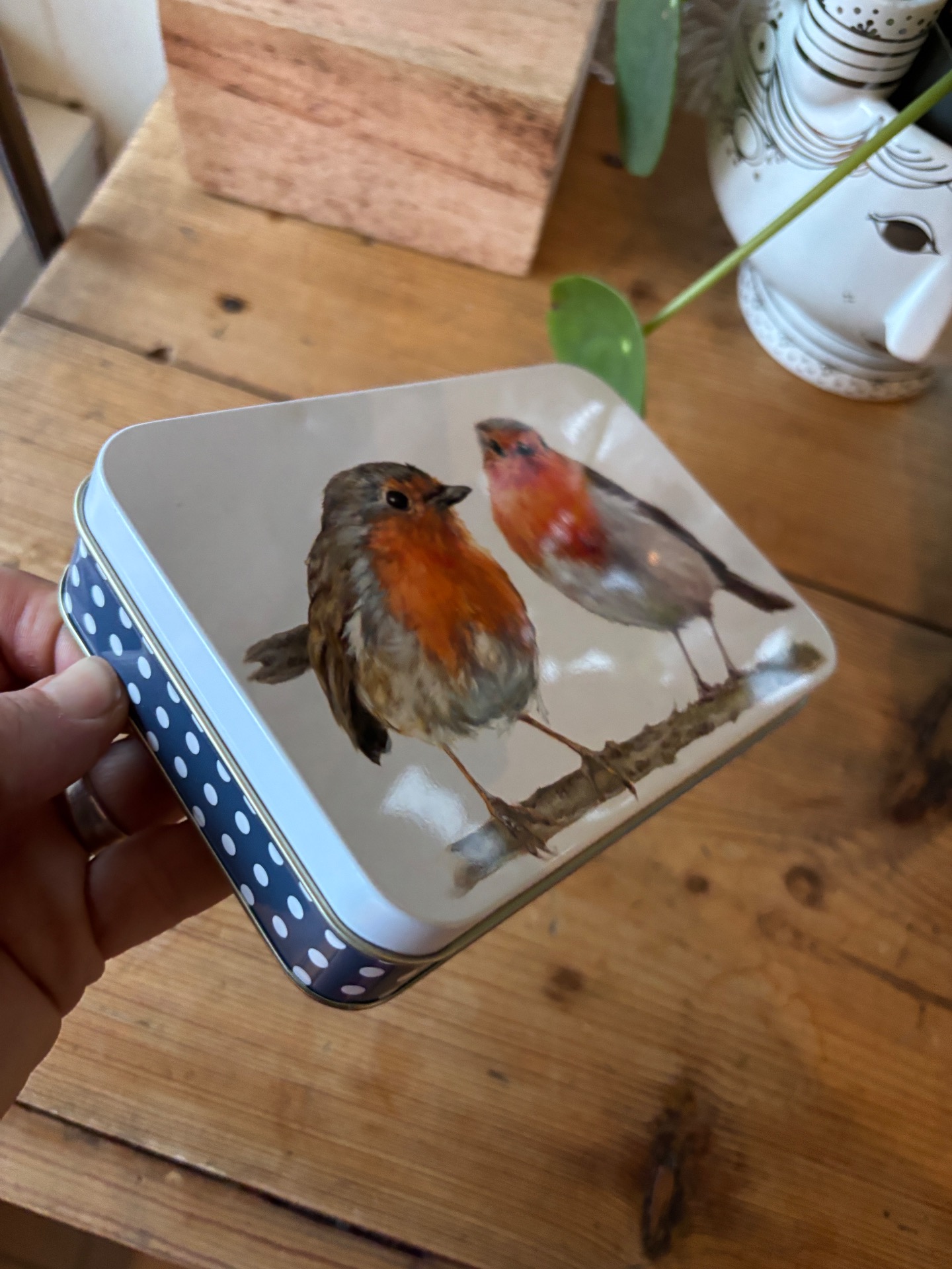 - En skjønn boks med to lubne fugler på lokket og kantene er blå med hvite prikker. Dessverre er det en ørliten bulk (størrelse prikk) over venstre fugls hode - derfor selges denne for 50,- kroner og ikke 99,-, som er vanlig. Du ser ikke akkurat prikken godt, hvis du ikke vet det.