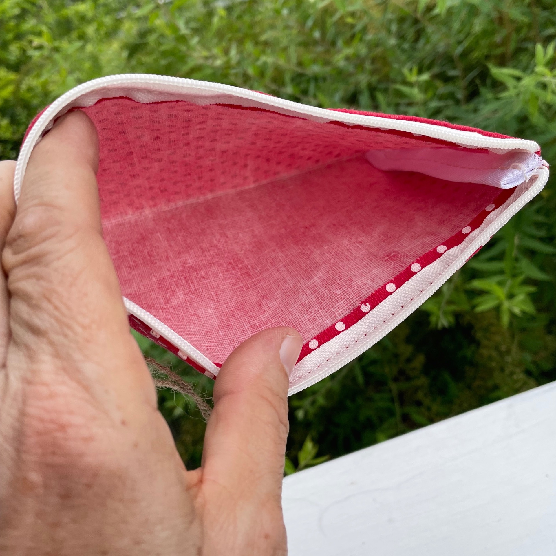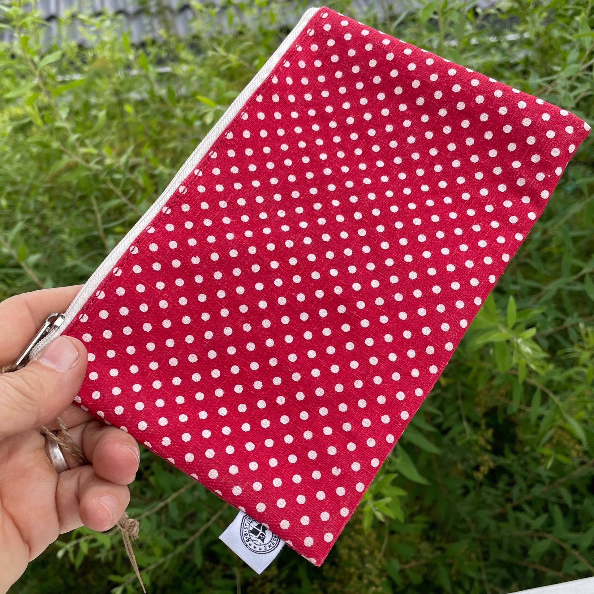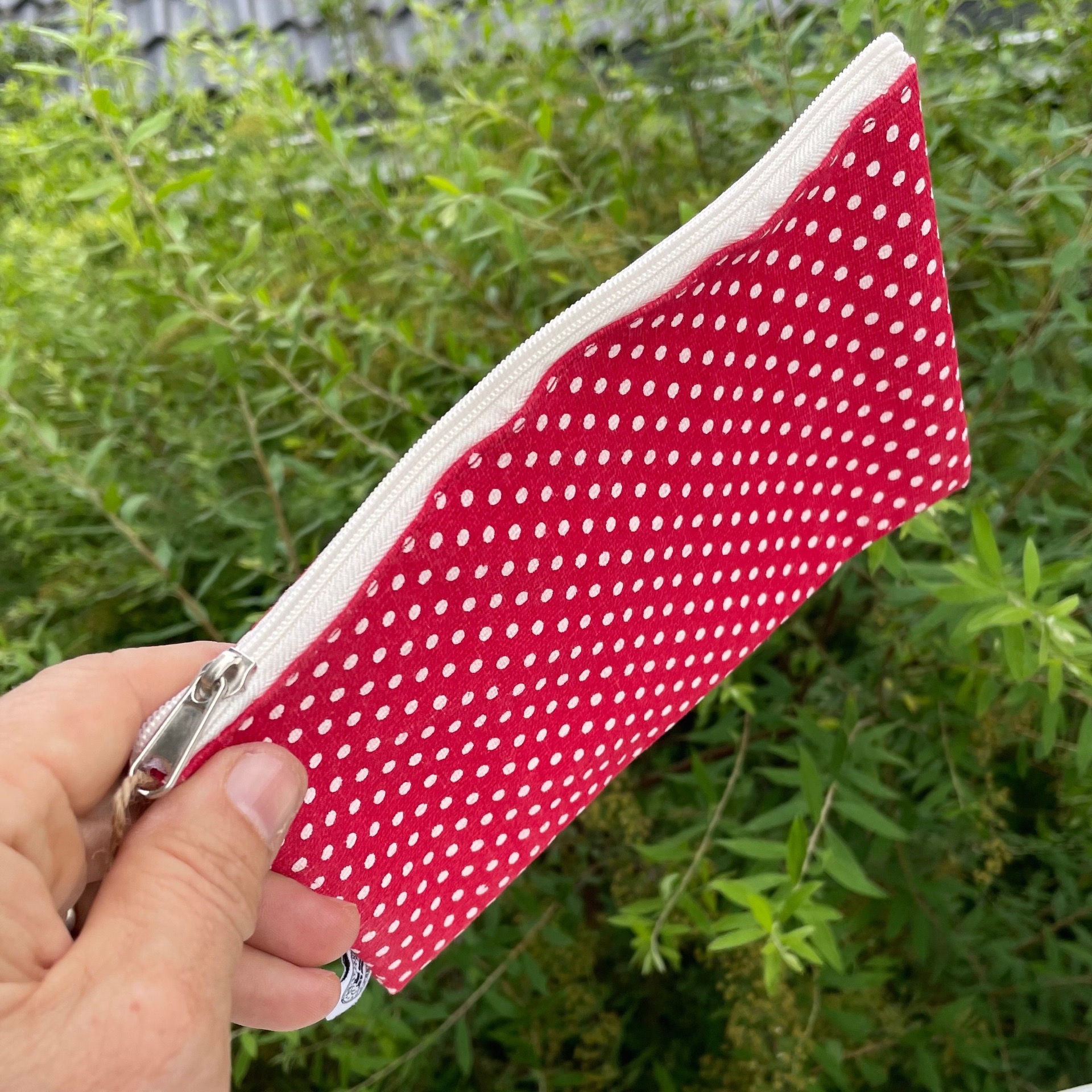 Praktisk pung i rød canvas med hvite prikker, hvit glidelås og label i ene kortsiden. Produsent er svenske Strømshaga.