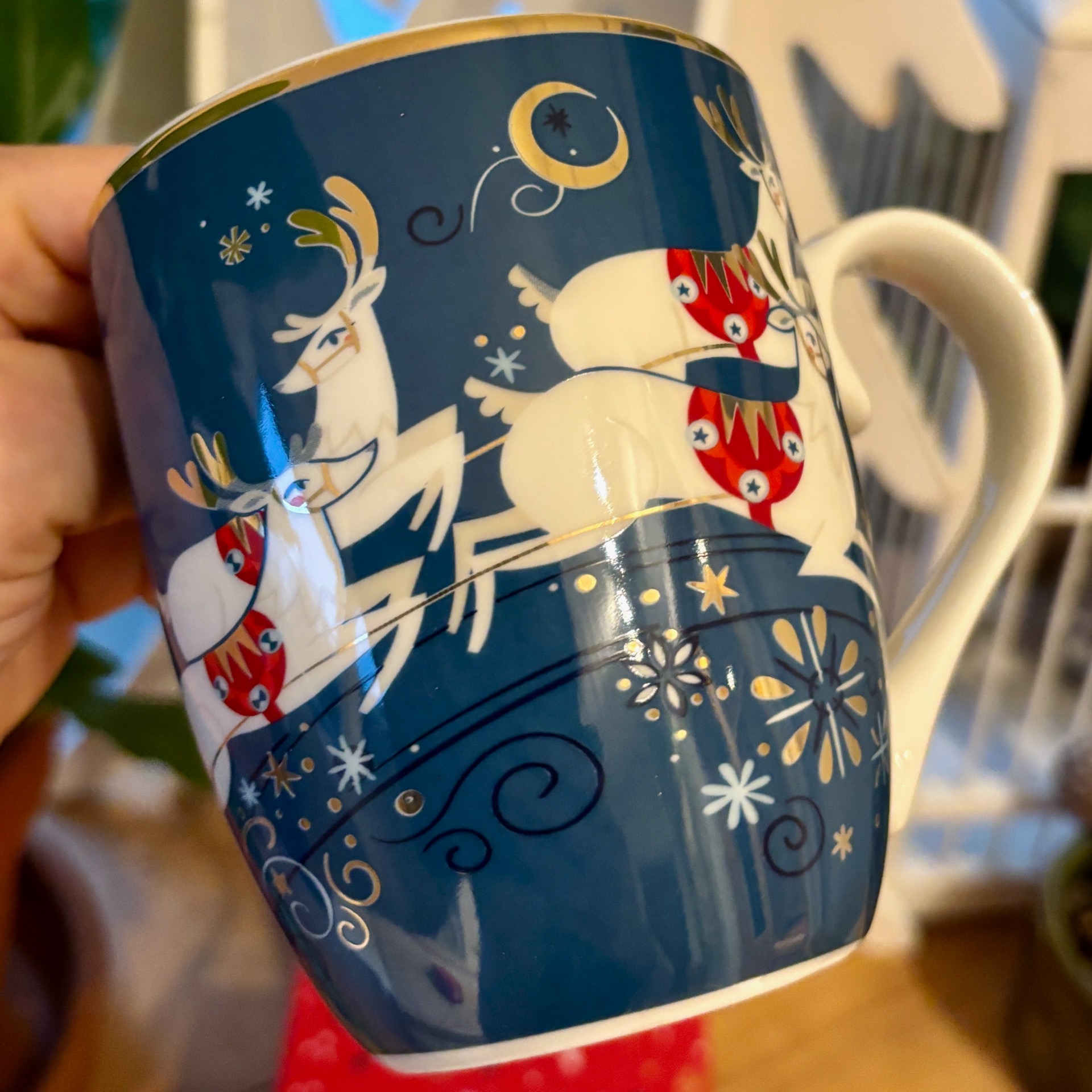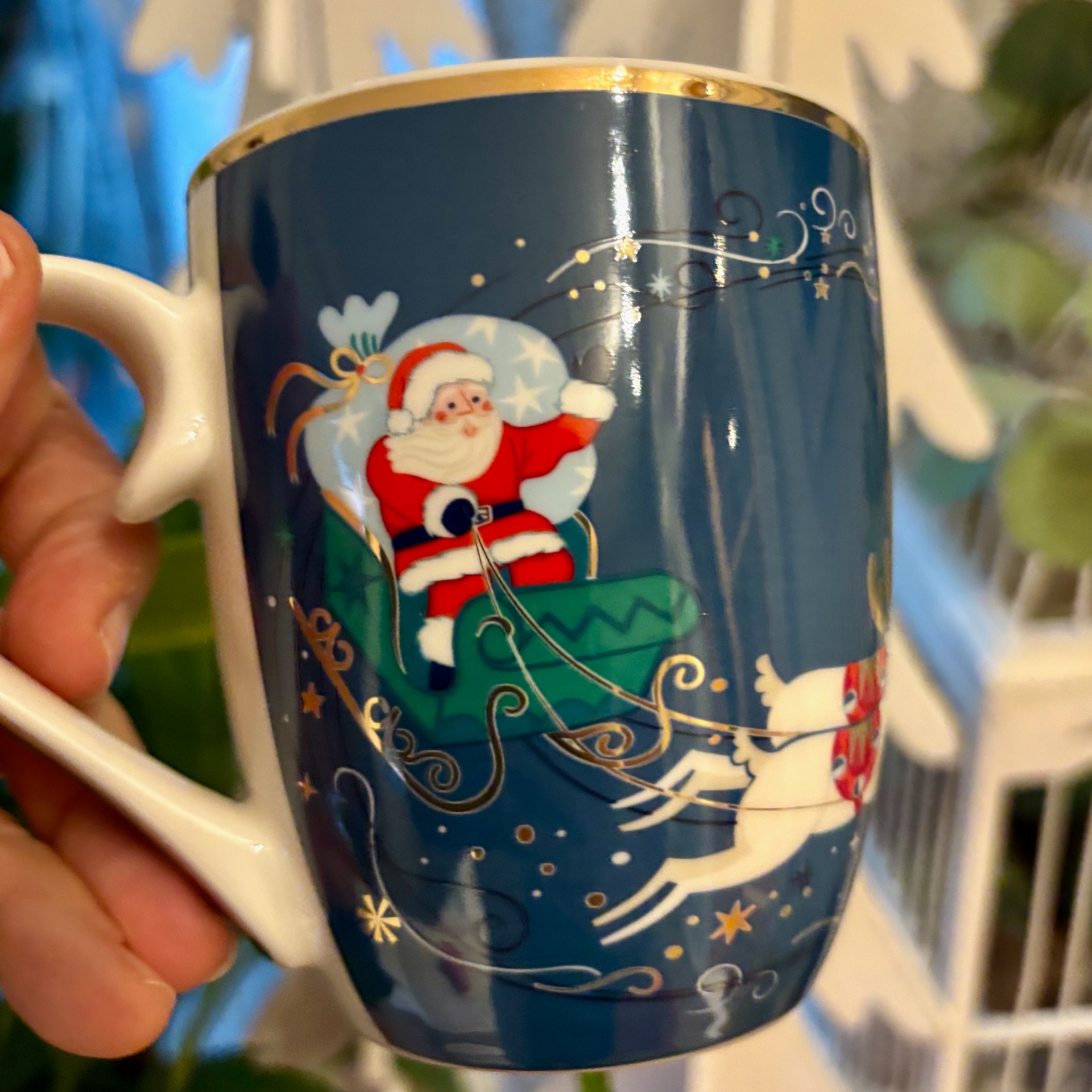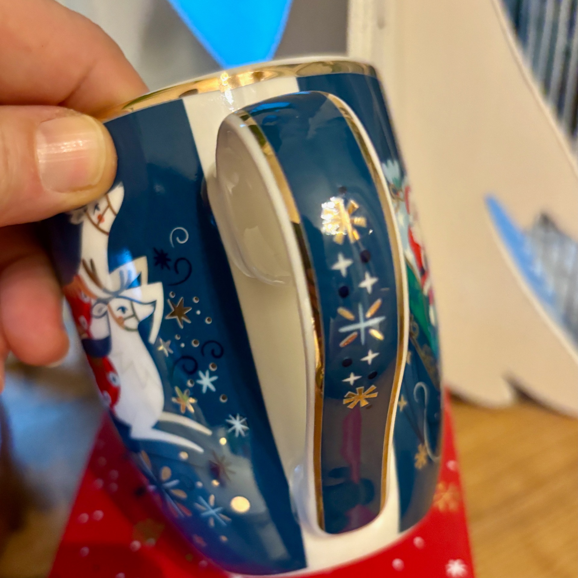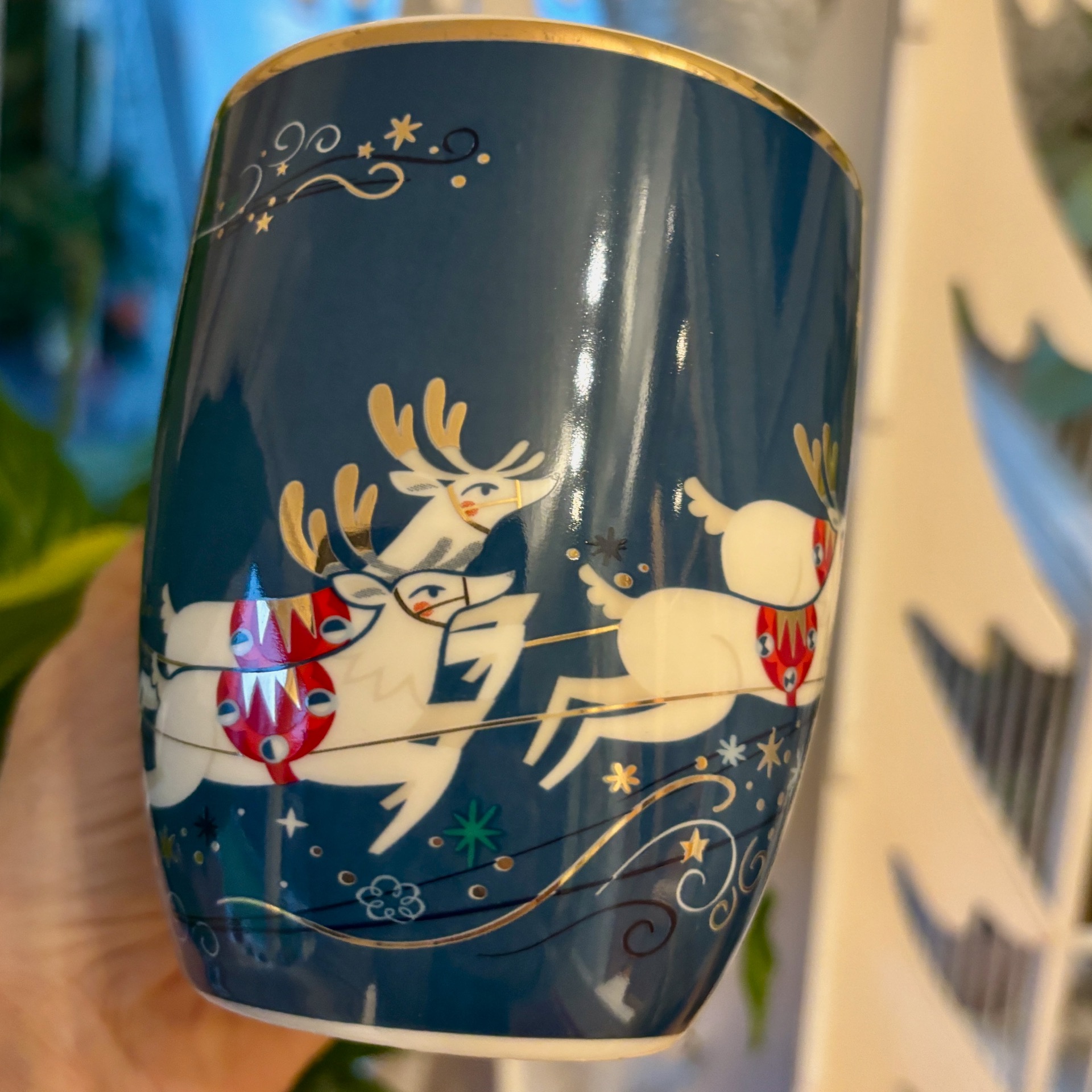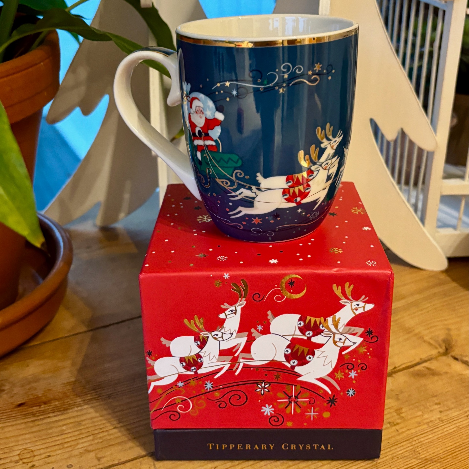 Raust og godt julekrus i porselen fra irske Tipperary Crystal. Det rommer 3,5 cl og har en julenisse og hans hjelpere som motiv rundt koppen. Pent mønster på håndtaket. Leveres i flott gave-eske.