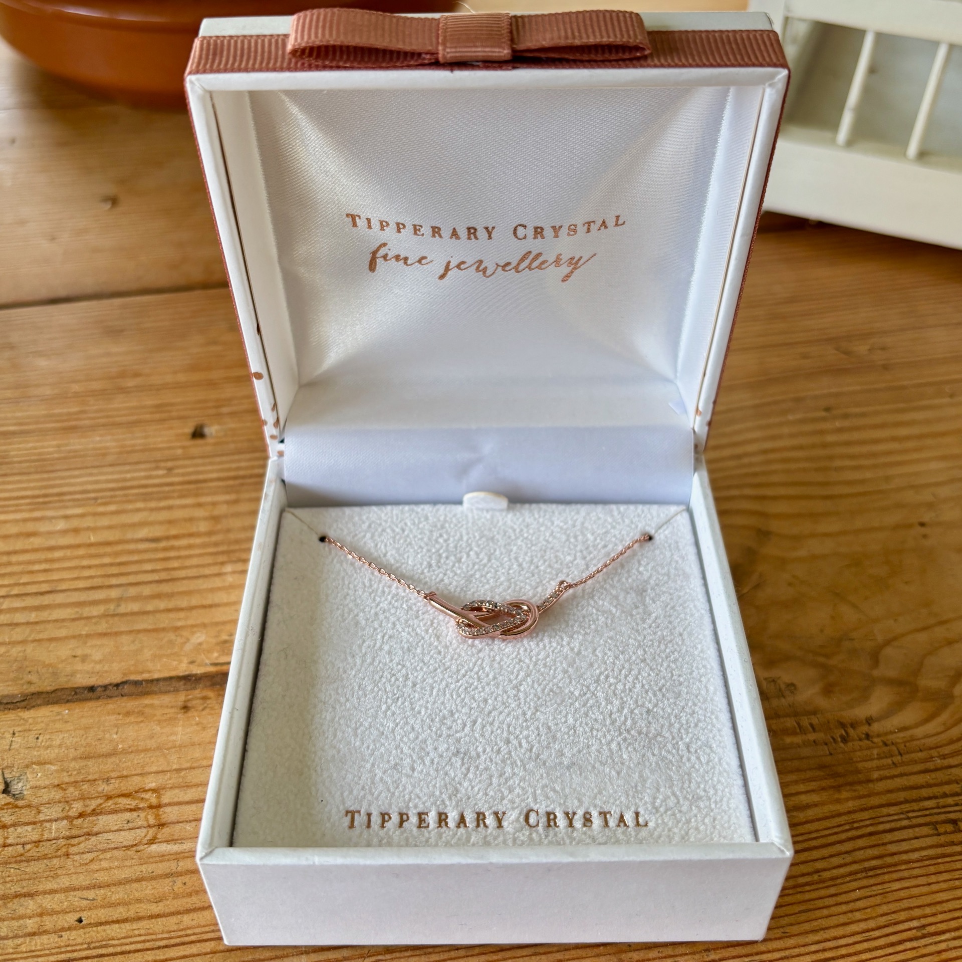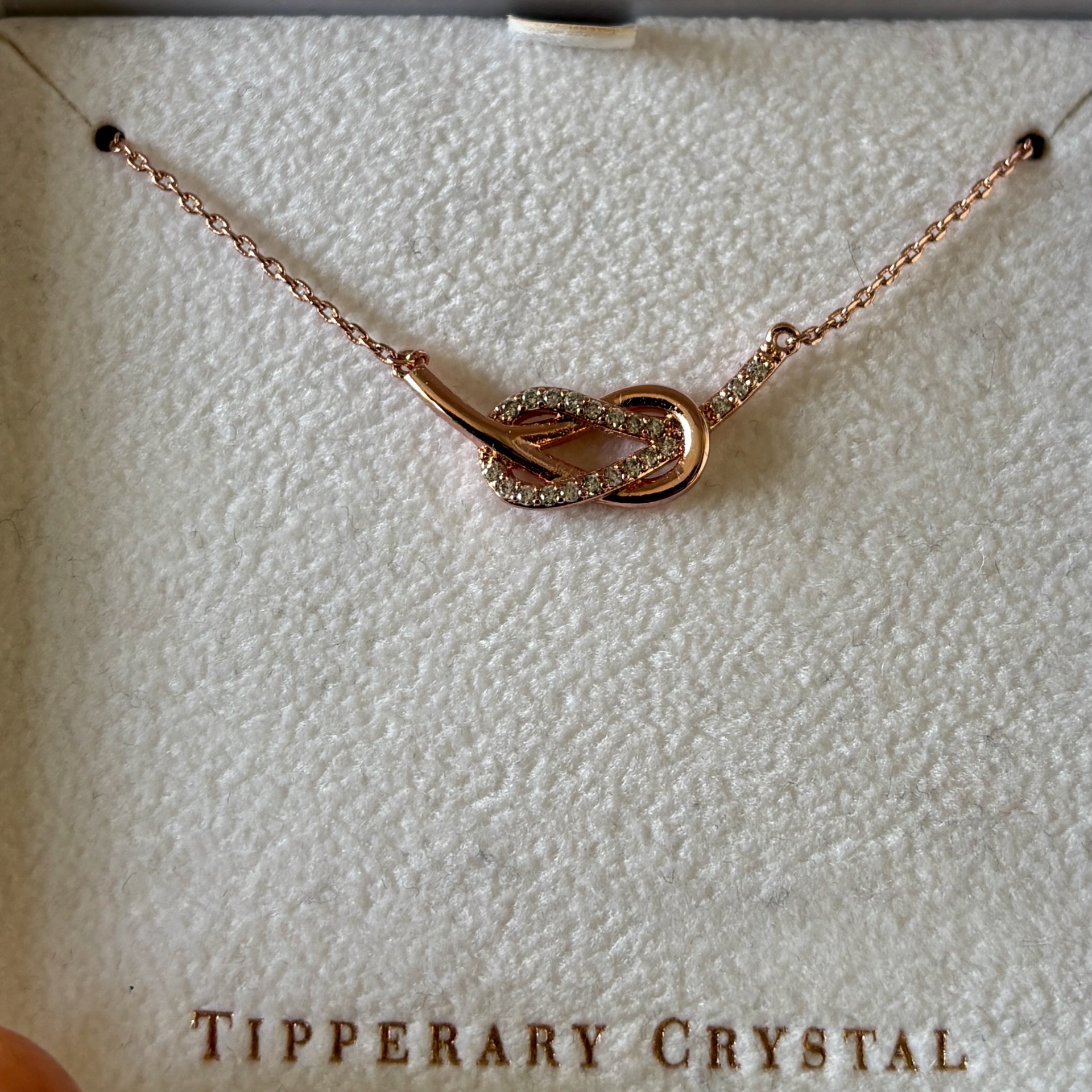 Irske Tipperary Crystal er produsenten bak anhenget i klassisk utførelse, i rosegull. Anhenget er 2,5 cm bredt og kjedet er totalt 40 cm.