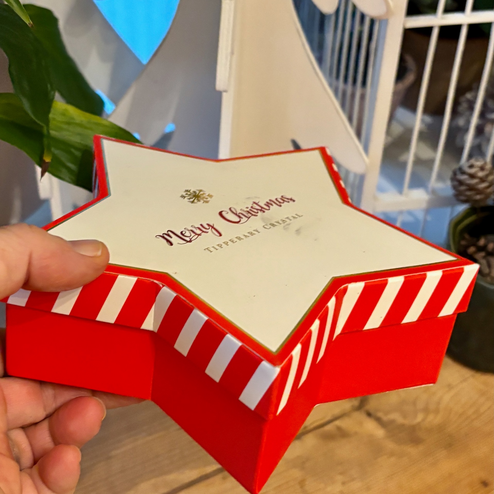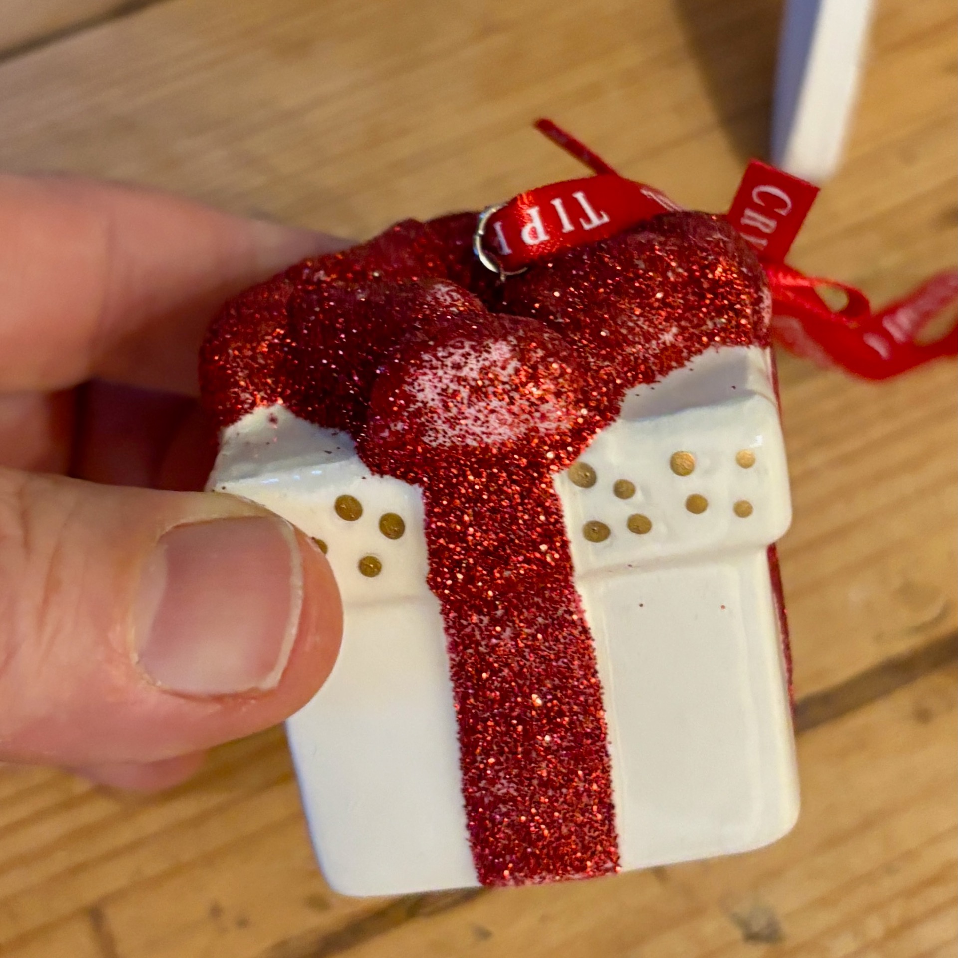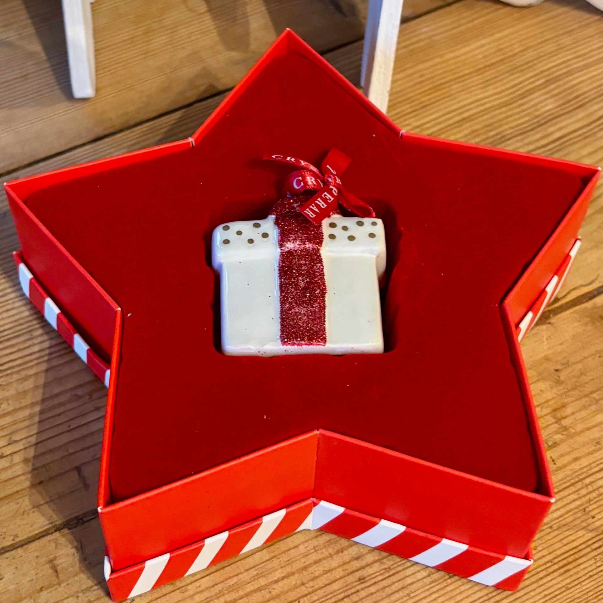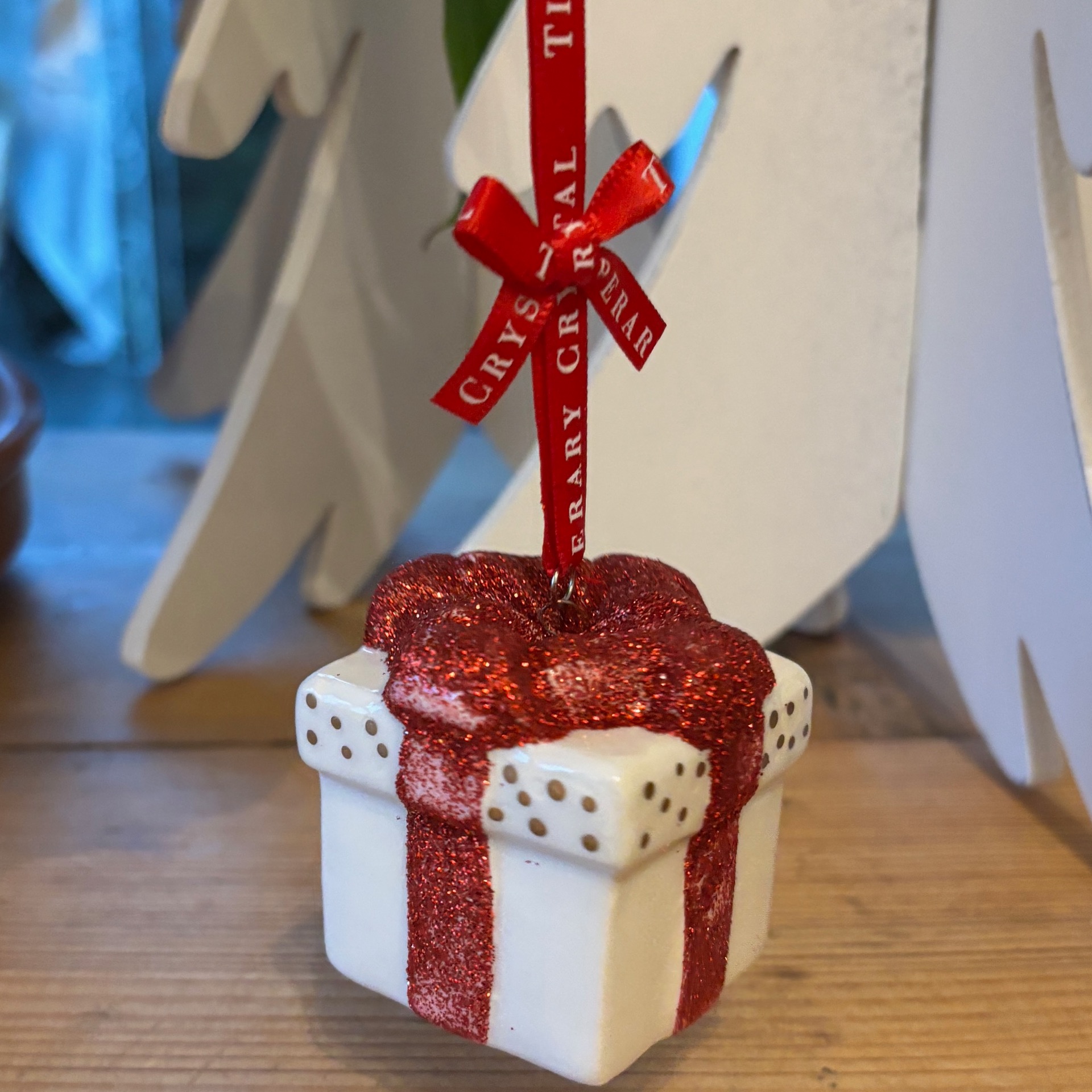 Liten gave med rødt, glitrende bånd - alt i porselen :-) Denne juletrepynten er laget av irske Tipperary Crystal og er i porselen. Bunn er 4x4 cm og høyde 5 cm. I tillegg til målene kommer et rødt bånd til oppheng - her er det trykket på i hvitt: Tipperary Crystal.