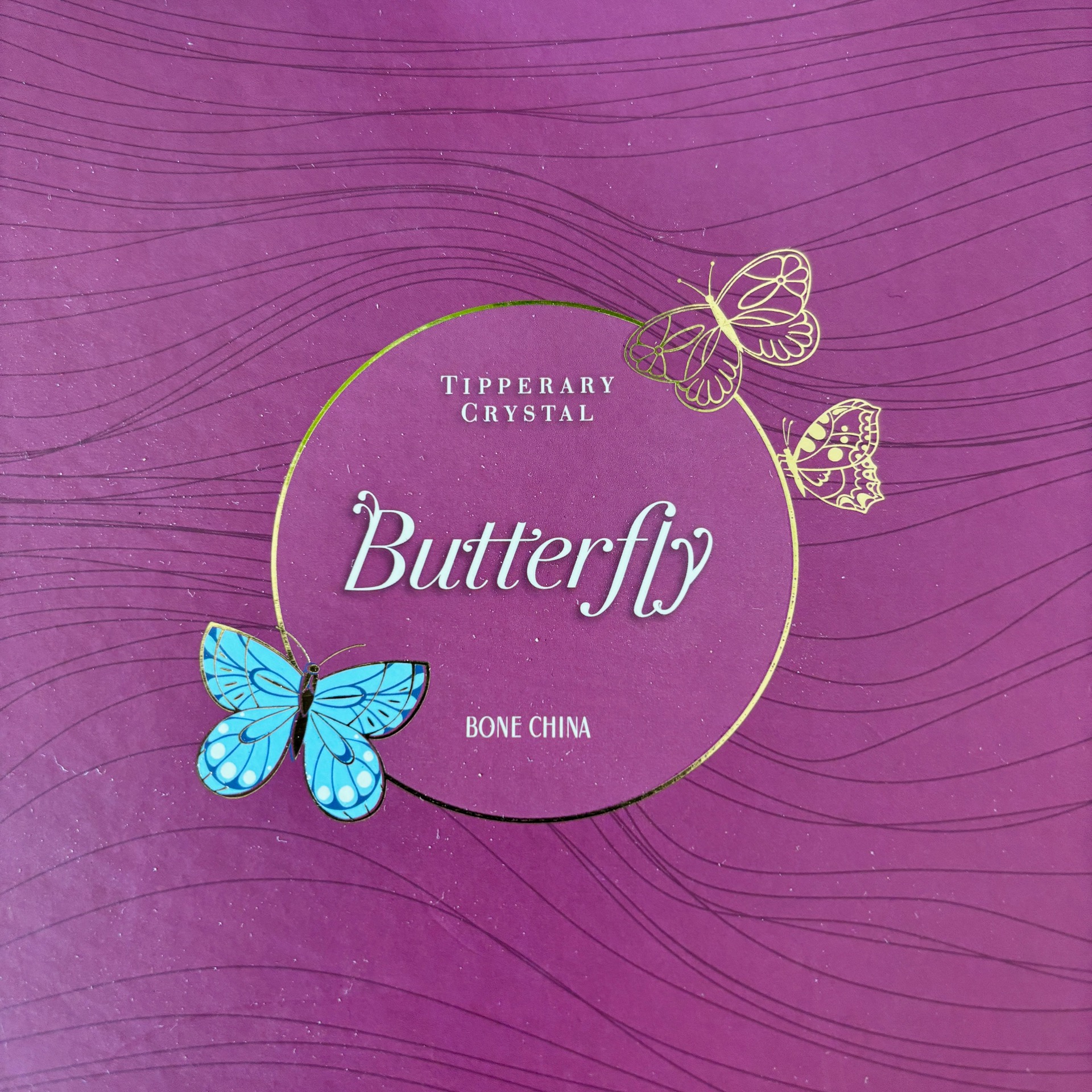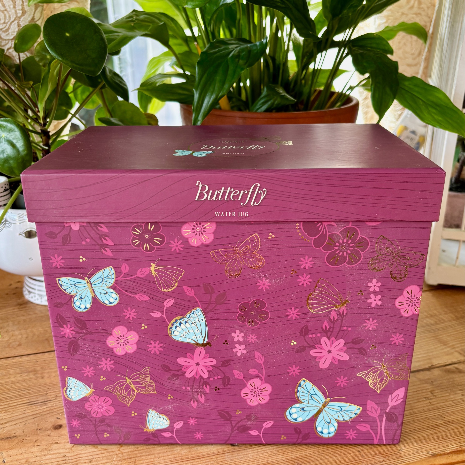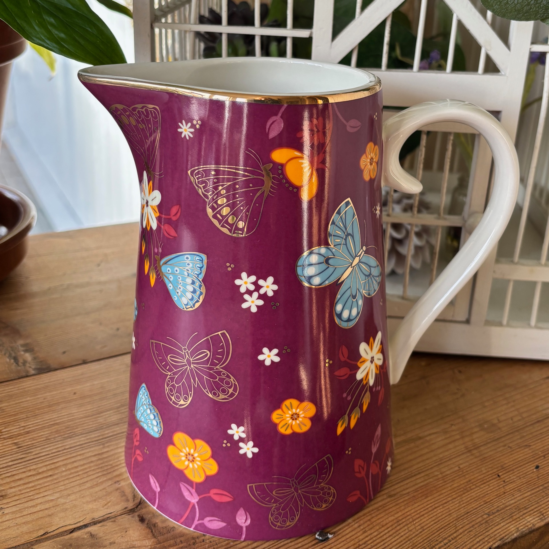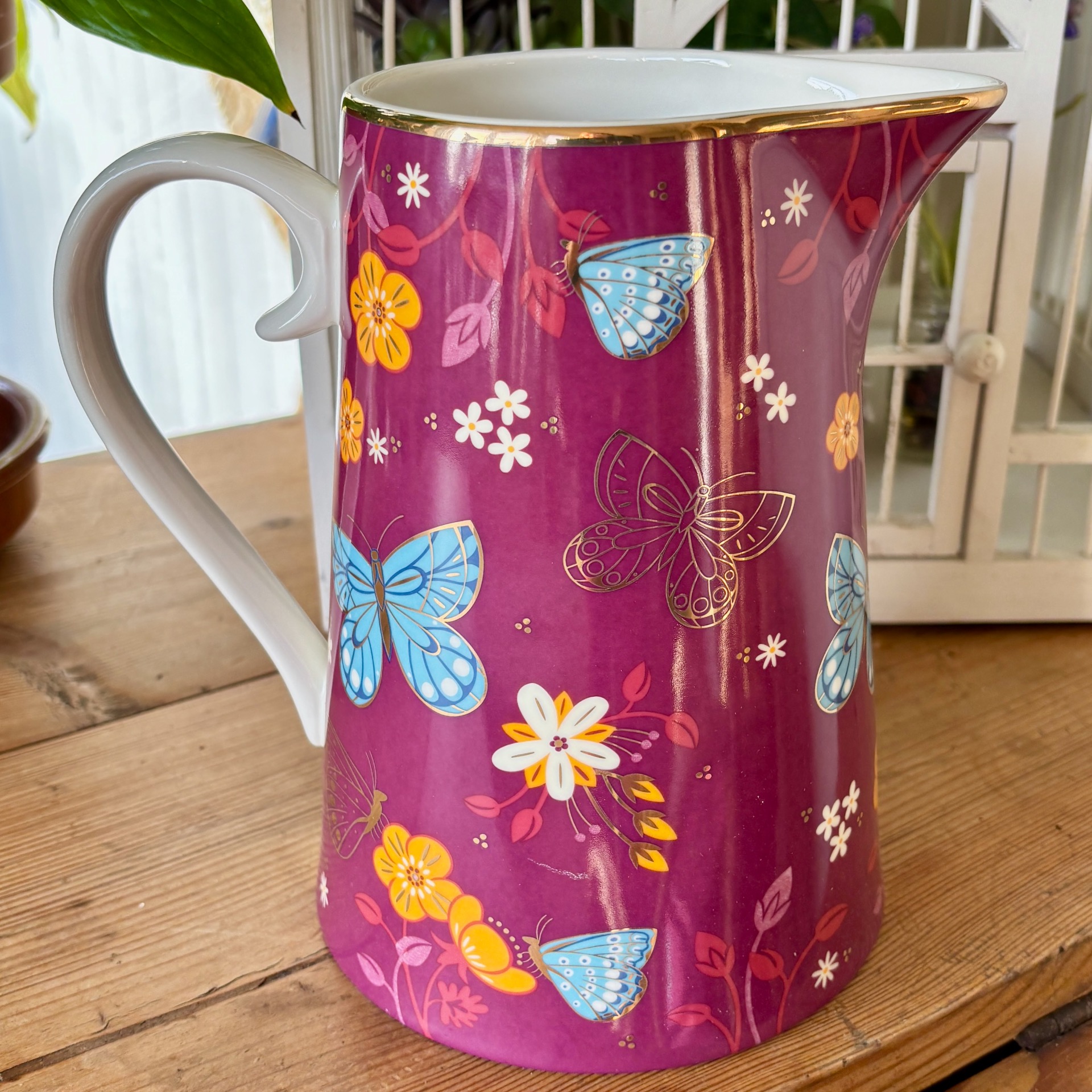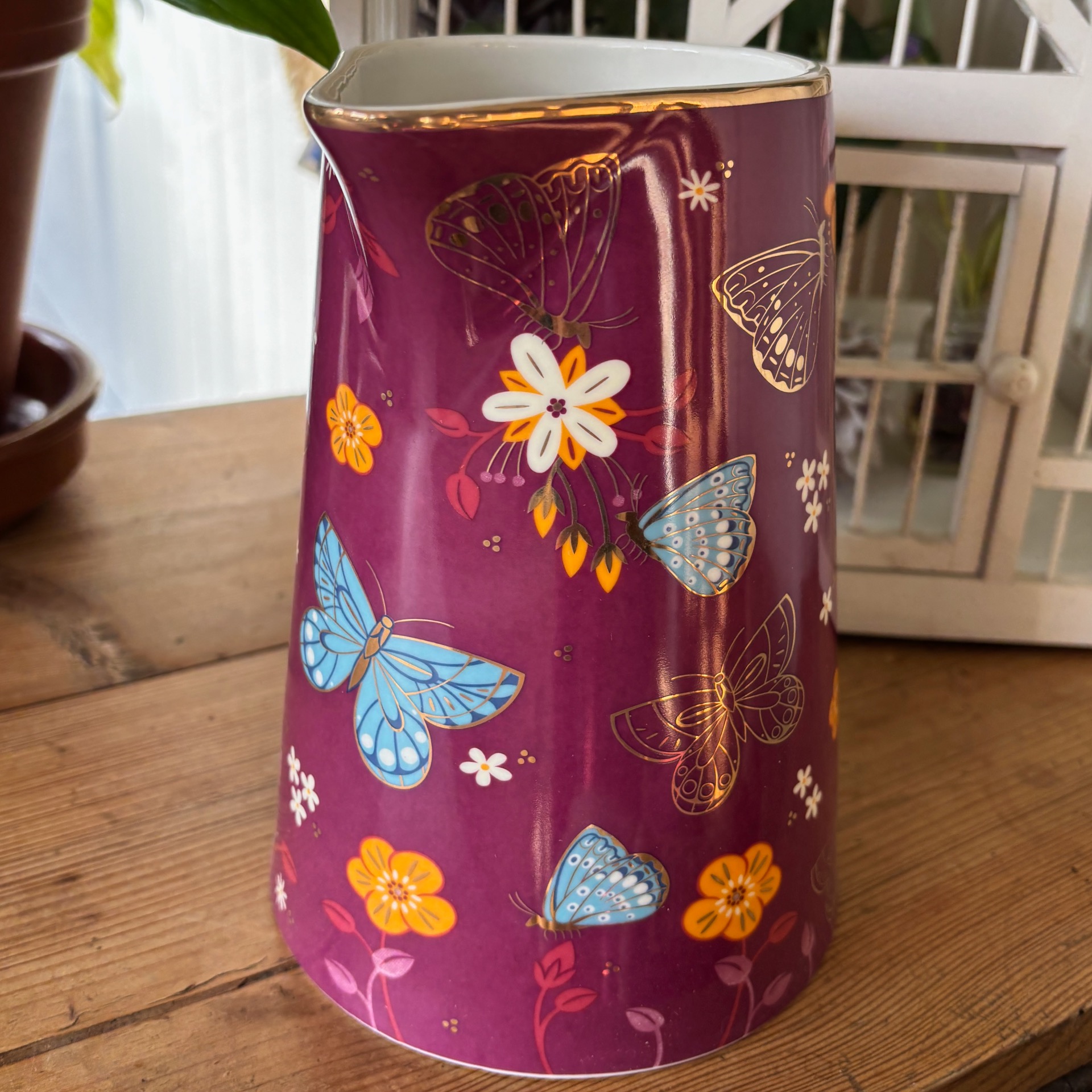 Irske Tipperary Crystal er produsenten bak denne store, herlige vannmuggen i porselen. Den går i lilla med sommerfugler, gullstripe øverst og på håndtaket og ellers her og der på muggen. Leveres i flott gave-eske - se bildet.