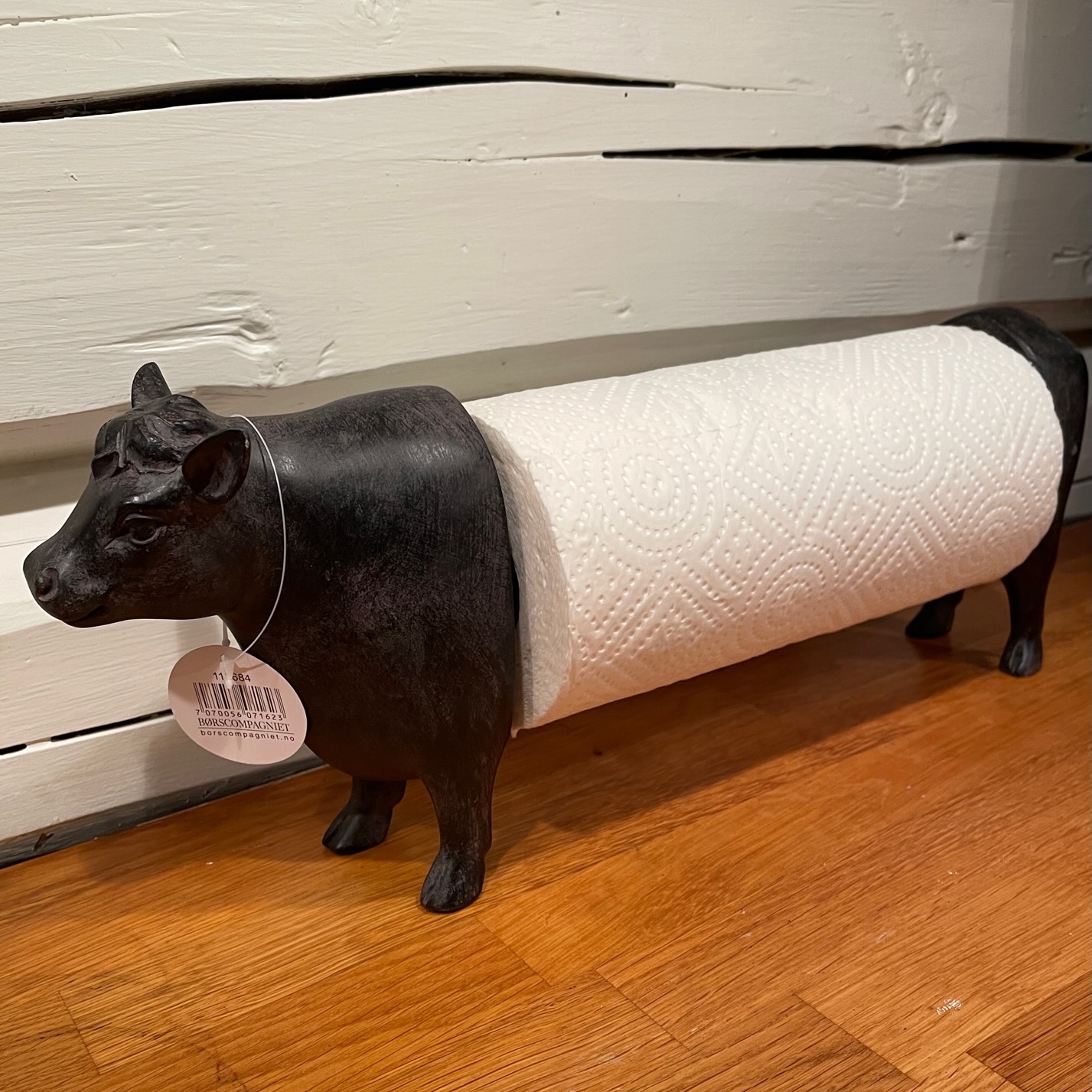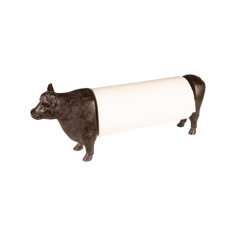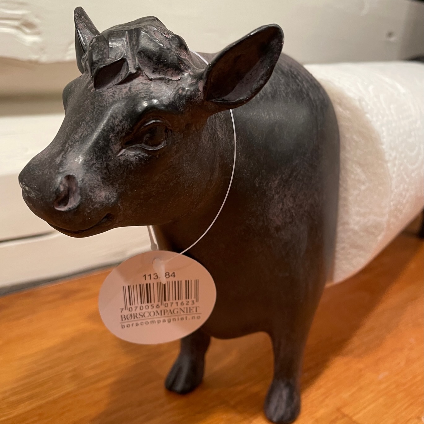 Endelig er denne på lager igjen! En tørkerullholder formet som ku i mørk brun utgave. Det er lett å sette på tørkerull - selvsagt.