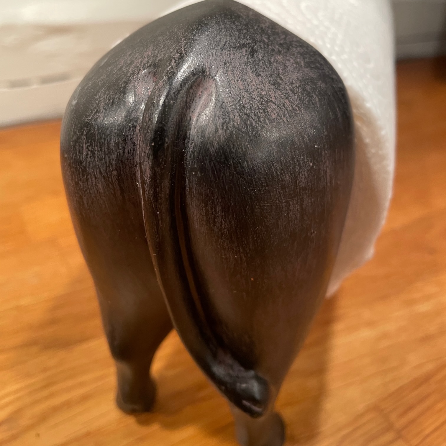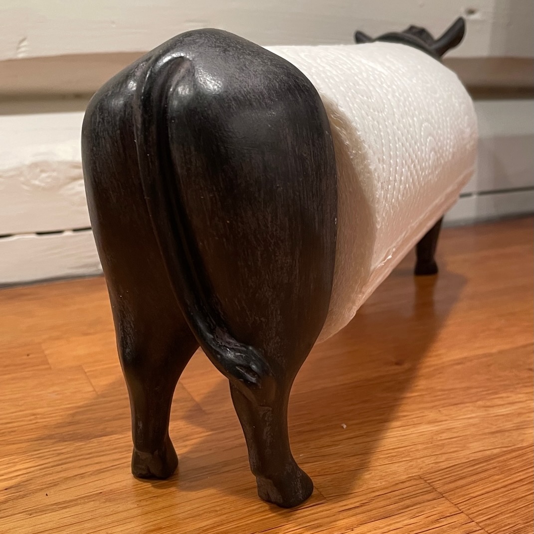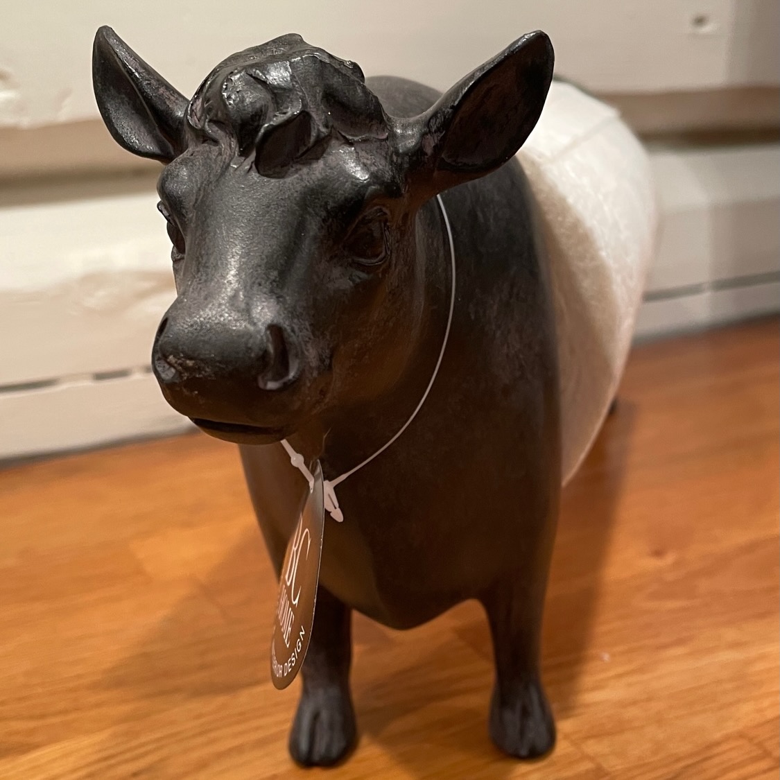 Endelig er denne på lager igjen! En tørkerullholder formet som ku i mørk brun utgave. Det er lett å sette på tørkerull - selvsagt.