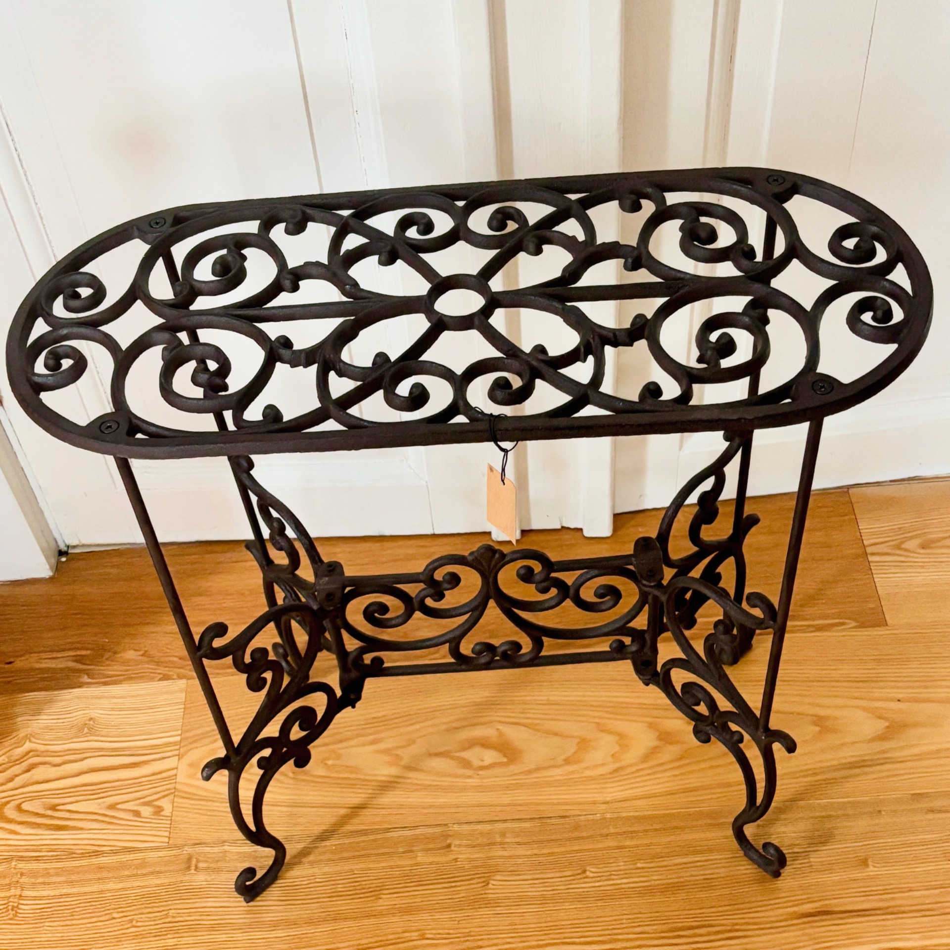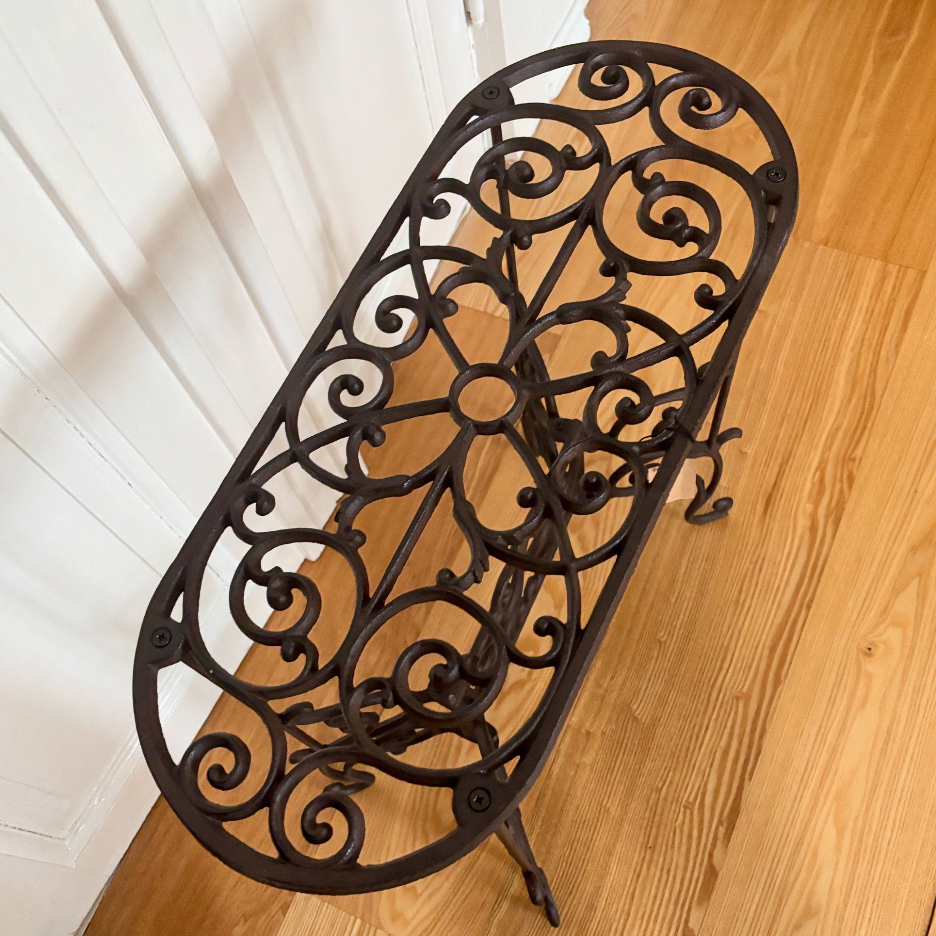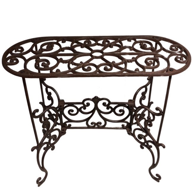 Bordet er laget i støpejern, er mørkt brunt og har sterke vibber mot fransk landstil. Ypperlig å ha på terrassen eller hagen med blomster etc på.