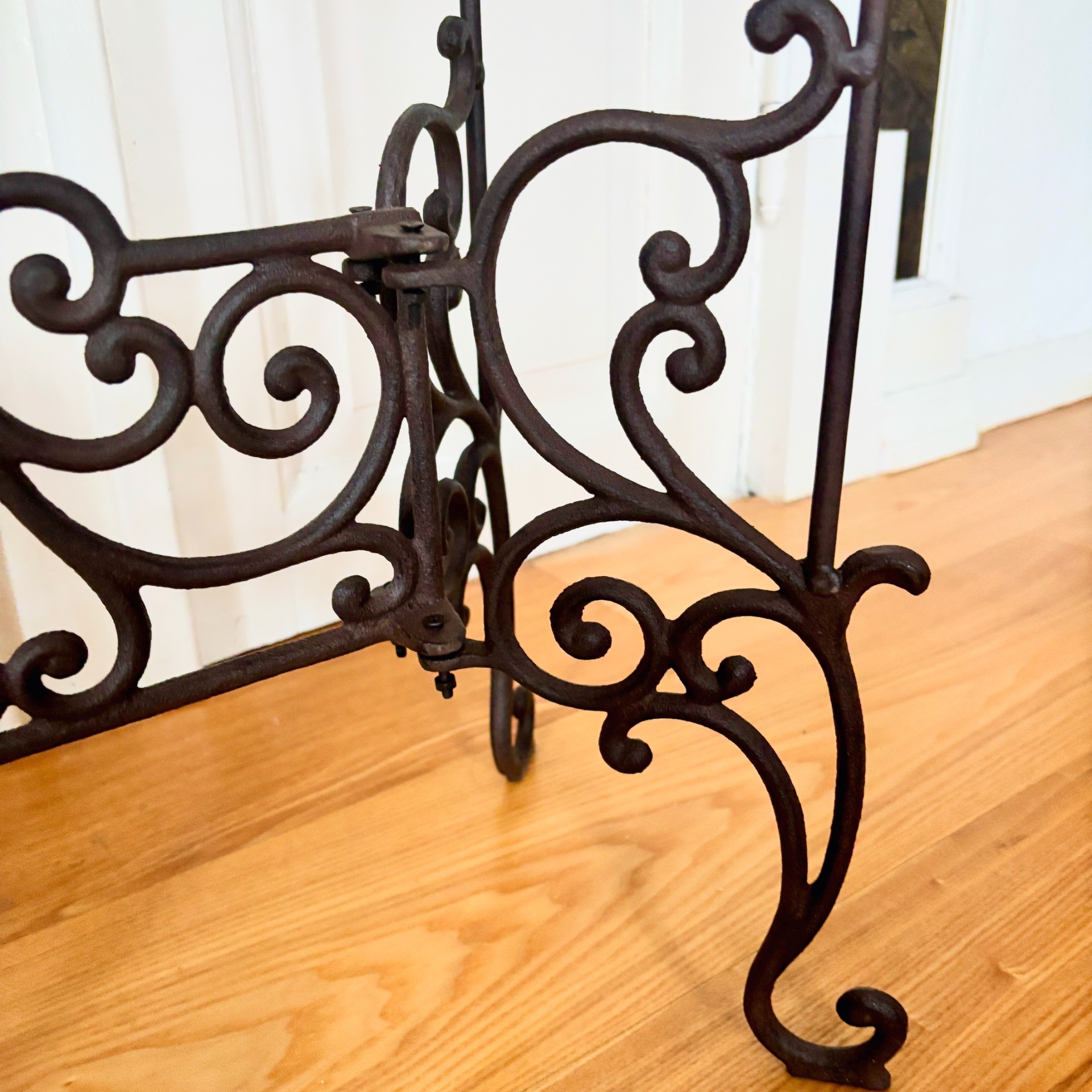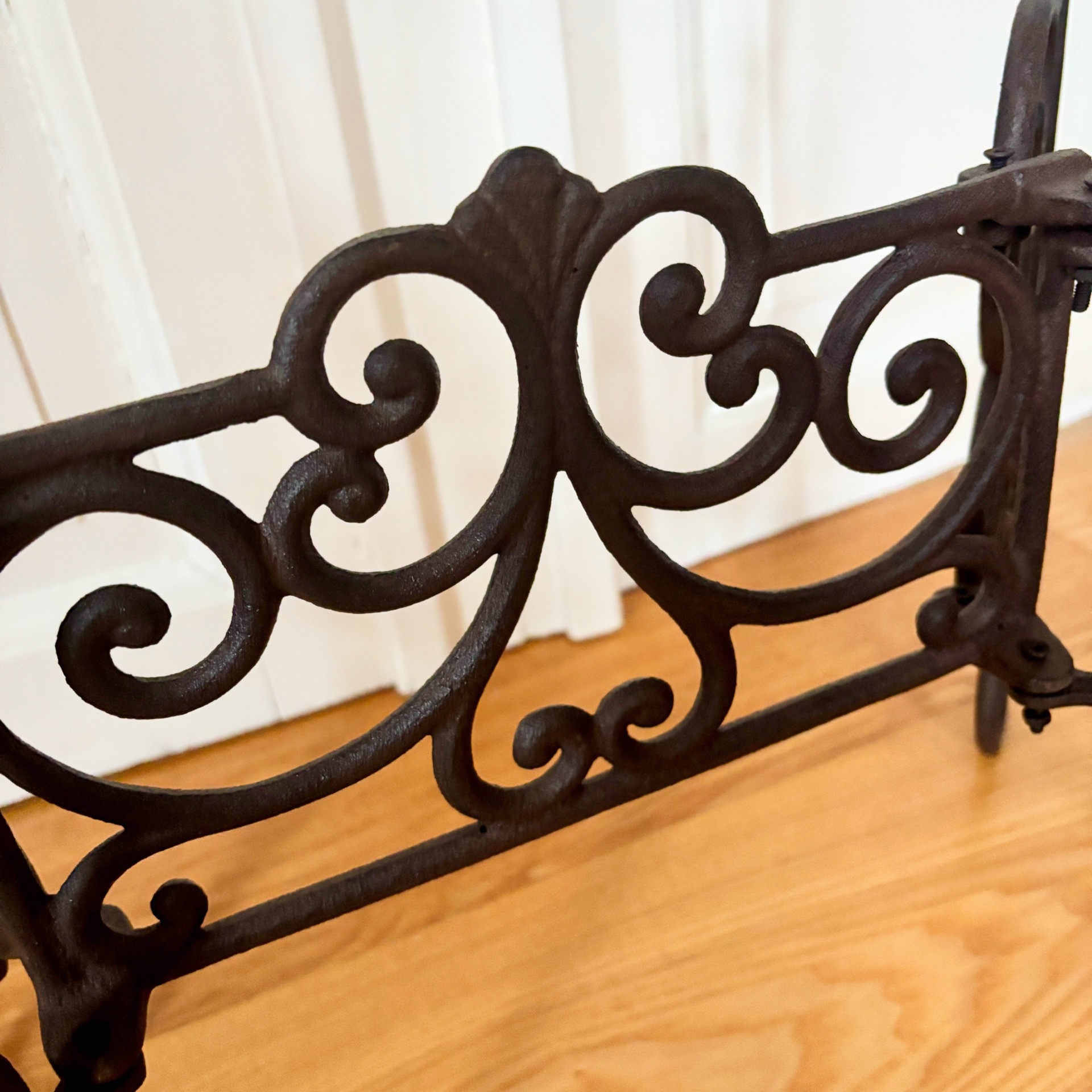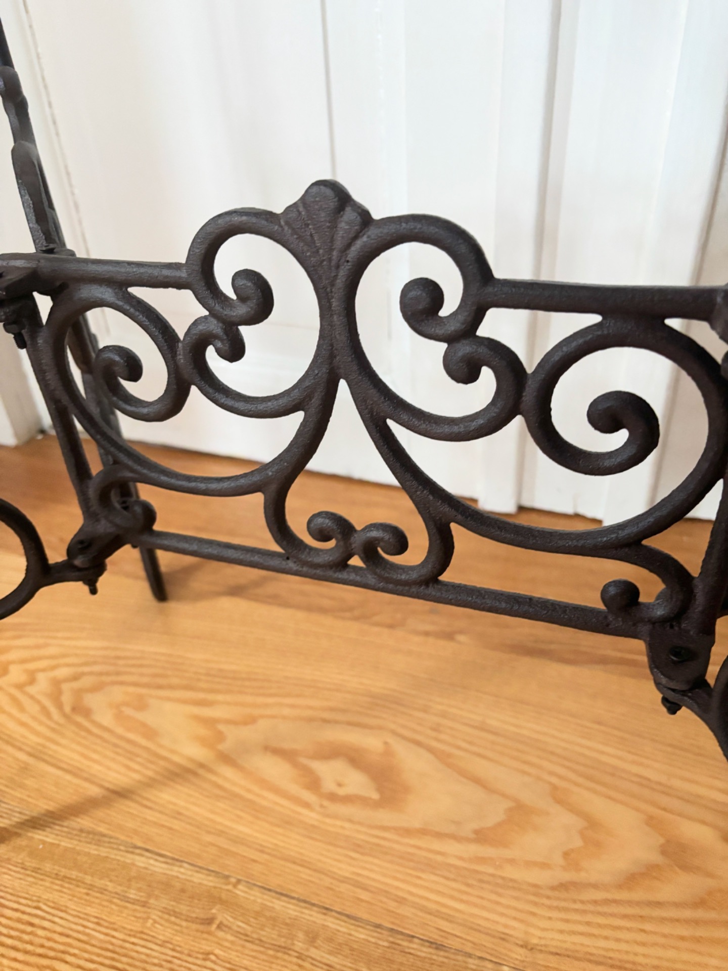 Bordet er laget i støpejern, er mørkt brunt og har sterke vibber mot fransk landstil. Ypperlig å ha på terrassen eller hagen med blomster etc på.