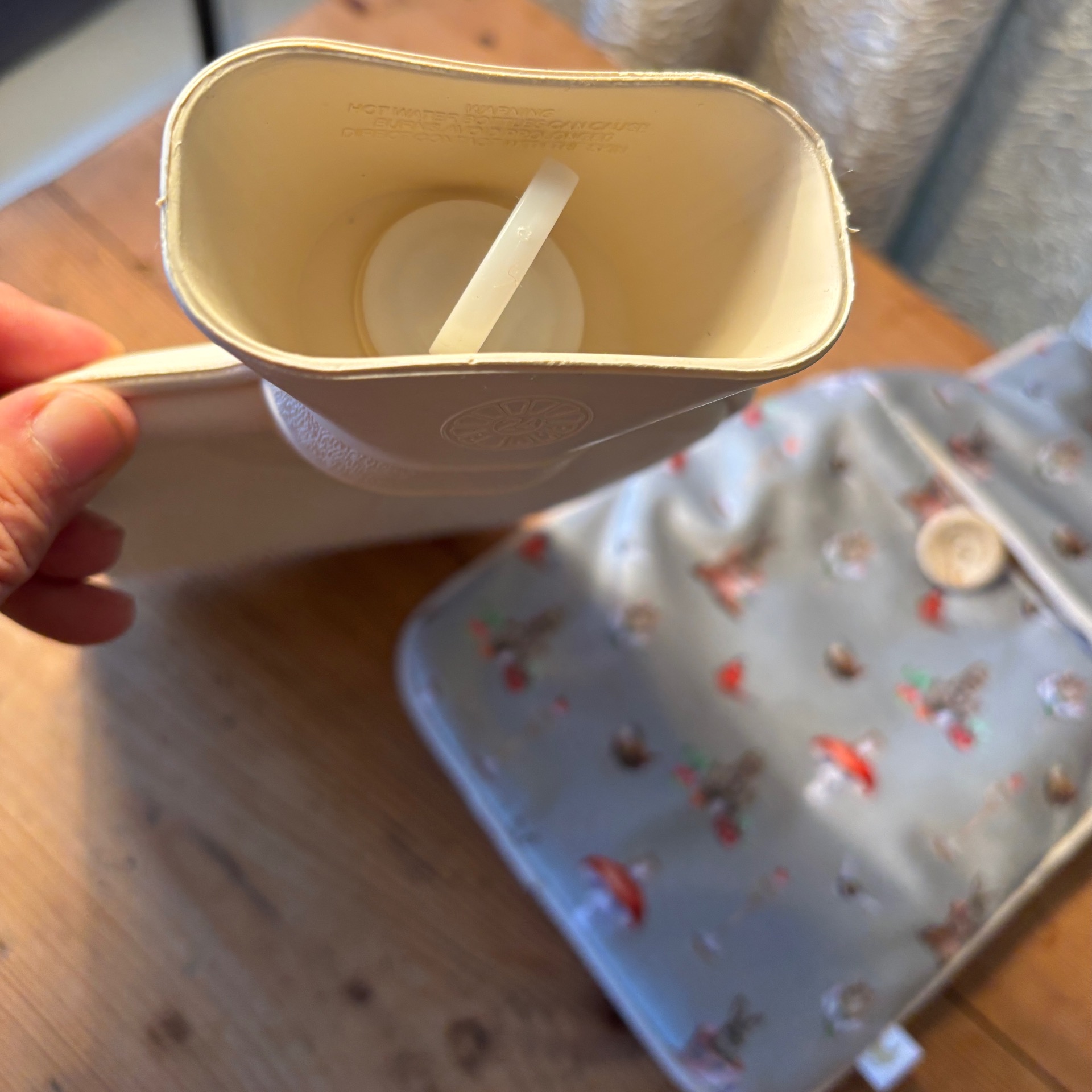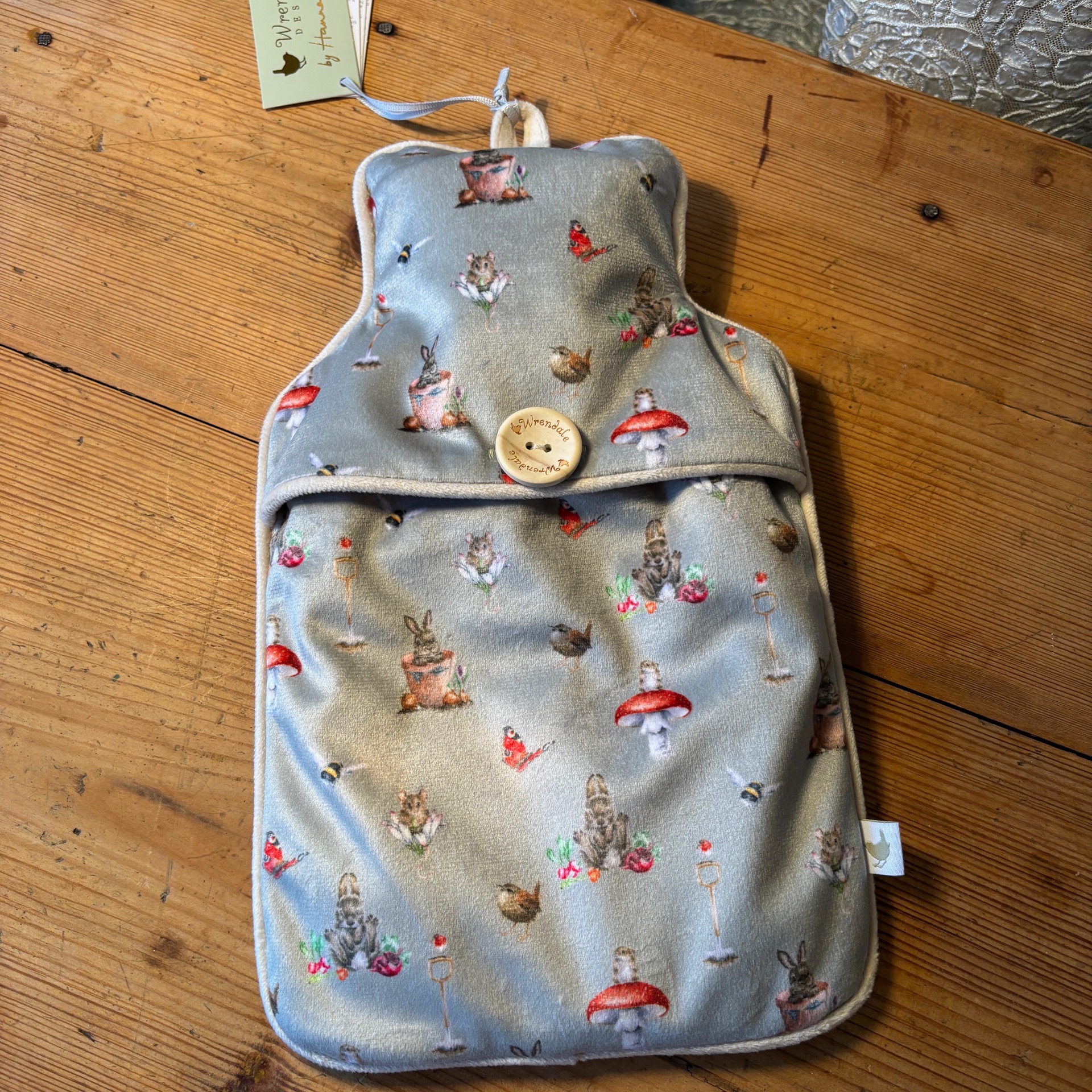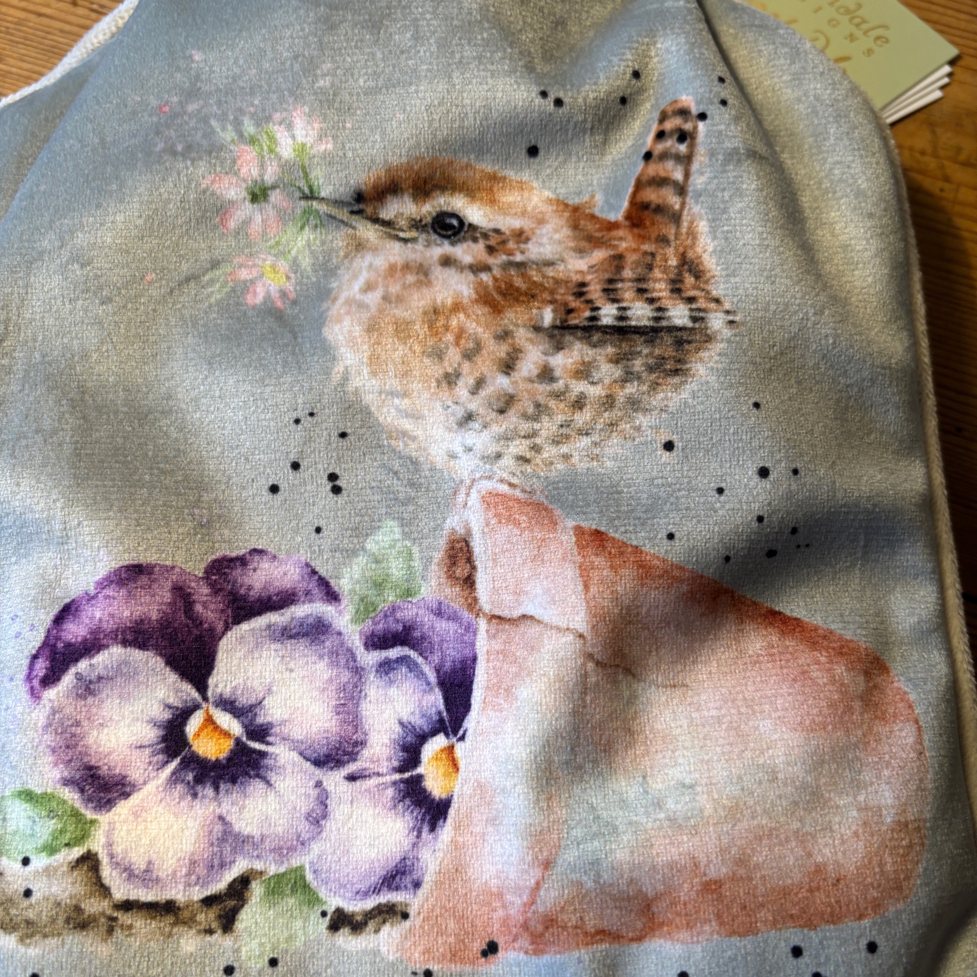 Er du litt frossen om kveldene og trenger litt varme, så kjøp deg en varmeflaske da vel! Trekket på denne er i serien "Garden Friends" - en serie som er utviklet av engelske Wrendale Designs. De er kjent for å levere kvalitetsvarer. På baksiden kan du ta ut flasken enkelt og lett. Se bildene. Lukkingen foretas med en tre-knapp - intet mindre :-)