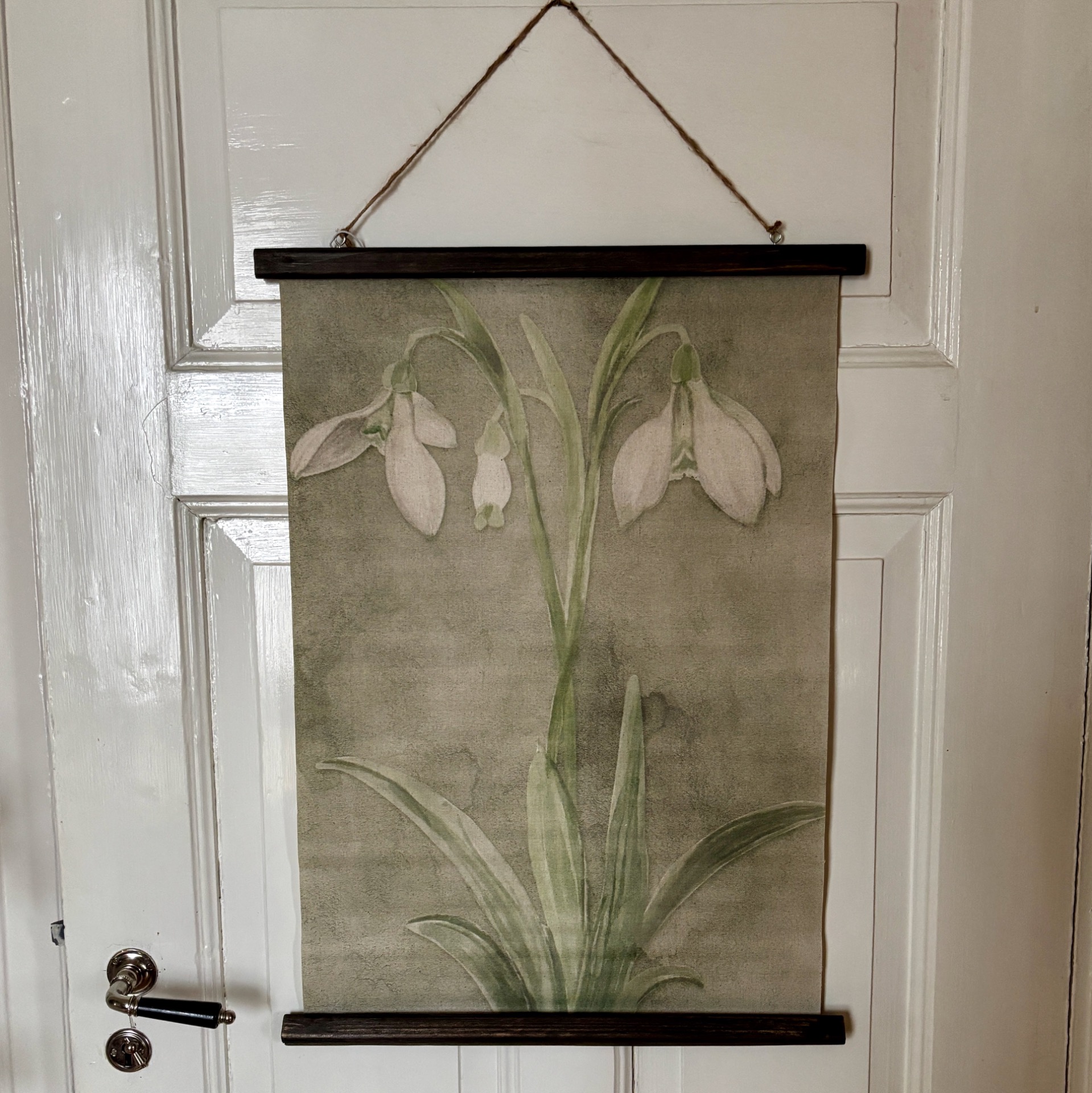 Motivet er to snøklokker på beige bakgrunn. Sart og vakker.